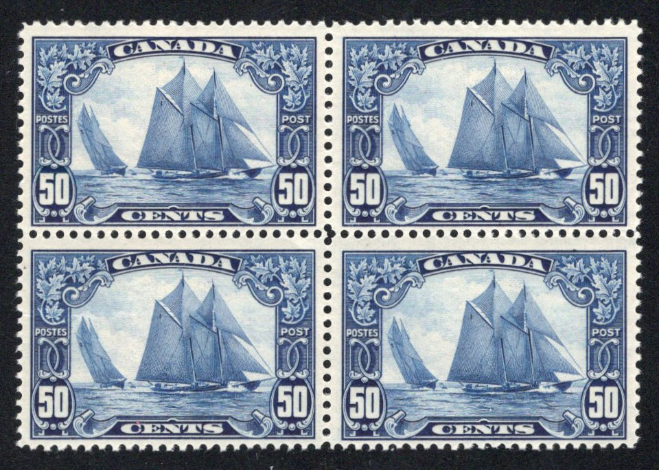 38 nh 158 image1929 50c Dark Blue Bluenose, a mint never hinged plate A-3 block of four, fresh, with four with well centered stamps. Unfortunately the lower right stamp has a significant tear (only visible from the back) and so our catalogue value is for three mint never hinged very fine singles only. A very nice appearing block from the better of the two plates.
