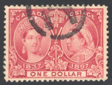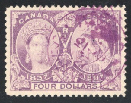 28 O 64 image1897 $4 Purple Jubilee, used with a purple Winnipeg c.d.s. cancel, a well centered and very fine stamp.