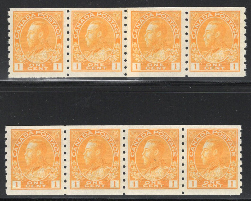 34 nh 126, 126i image1923 1c Orange Yellow Admiral Coil, Dry Printing, Die II, Perforated 8 Vertically, two mint never hinged strips of four, one having a paste-up in the middle, both are quite fresh and well centered, very fine.