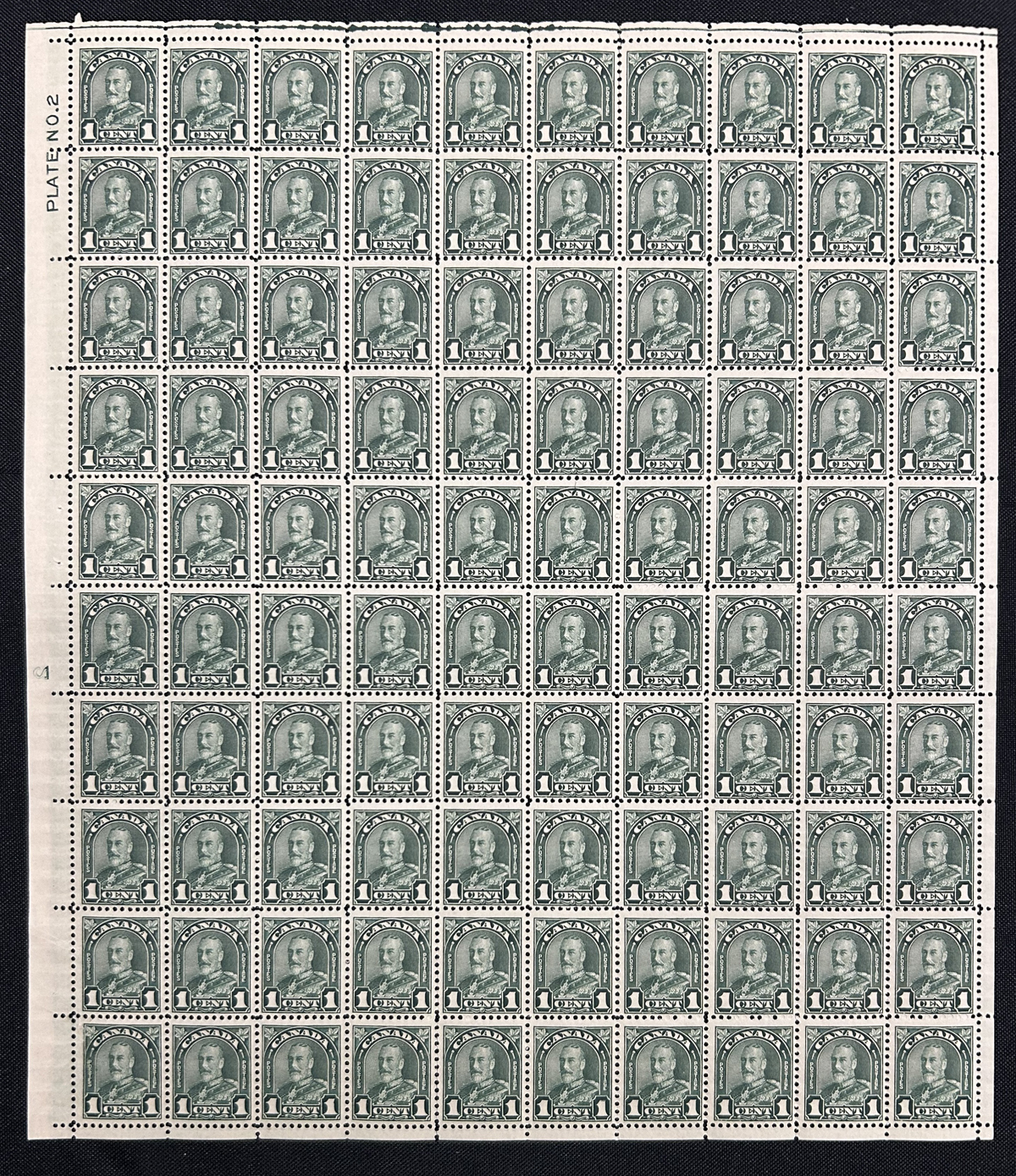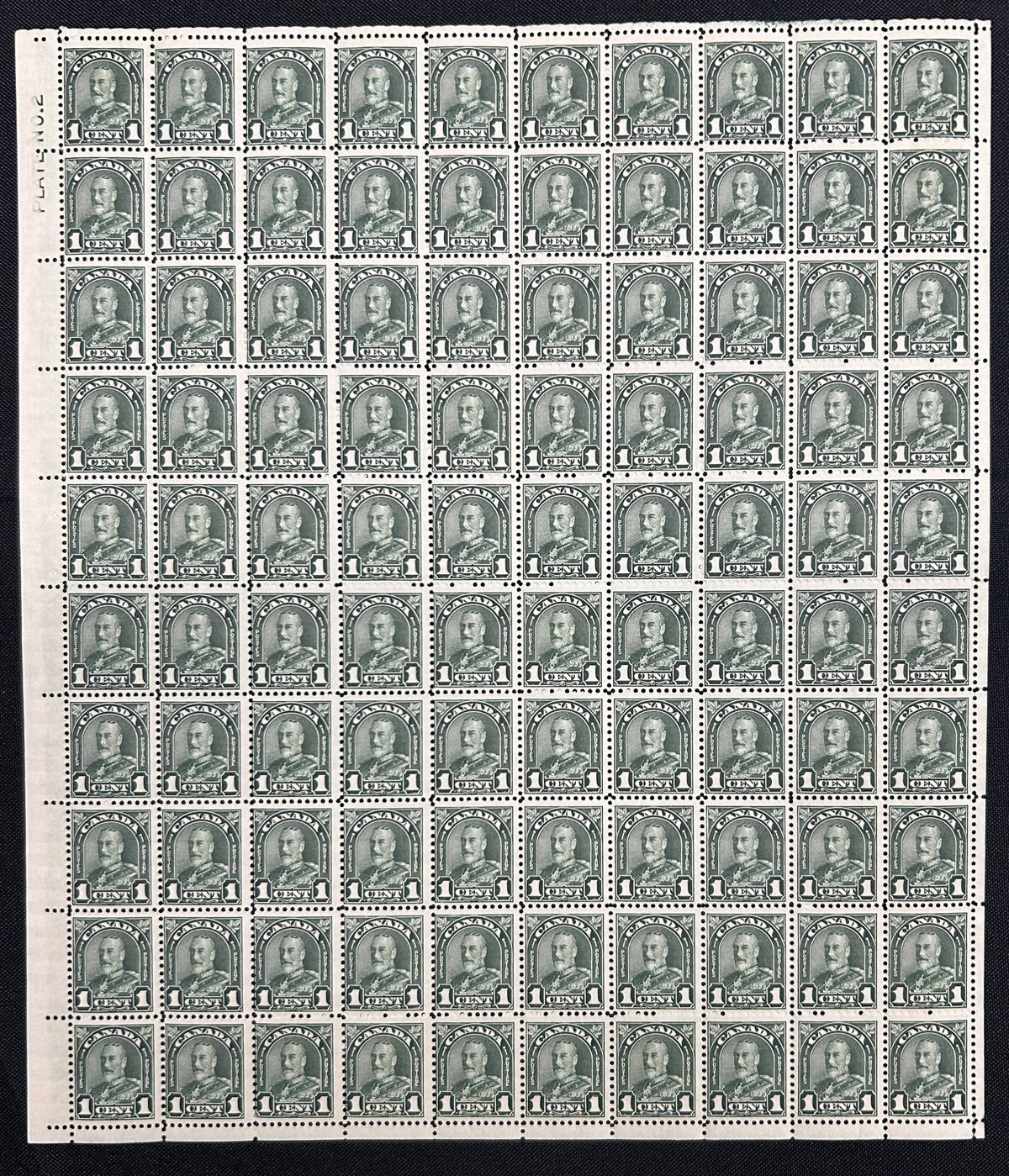 40 nh 163bii image1930 1c Deep Green King George V Arch, Die I, two complete mint never hinged sheets of 100, both showing the Plate 2 inscription at upper left, and both showing the reversed "2" at middle left (one is an albino impression). Both sheets also have the major re-entry in the position 96 stamp, showing strong doubling of the right "1" and "ENTS". One sheet has a bit of separation in one place, else very fine and both have no sign of having previously folded. (Scan 1) (Scan 2) (All Scans) (All Images)