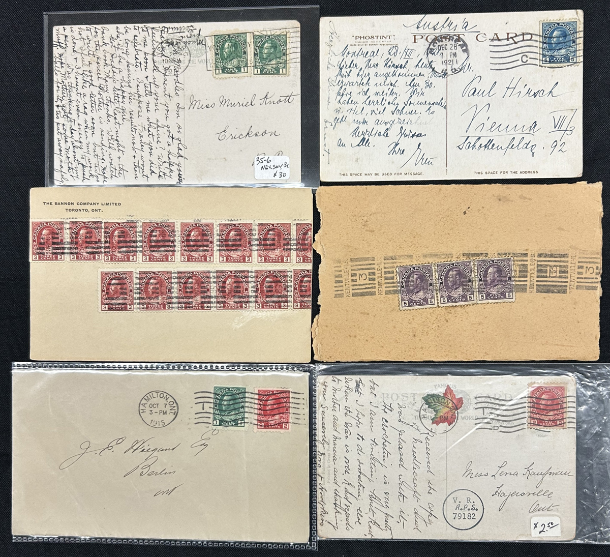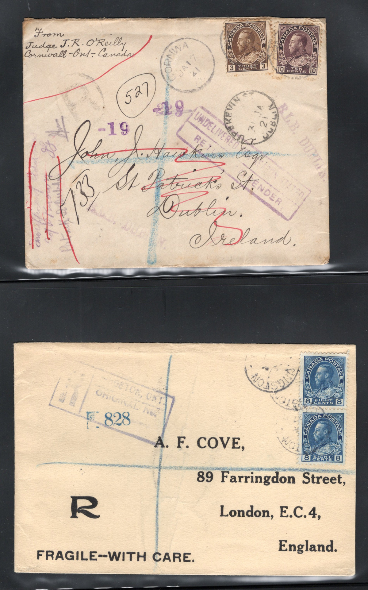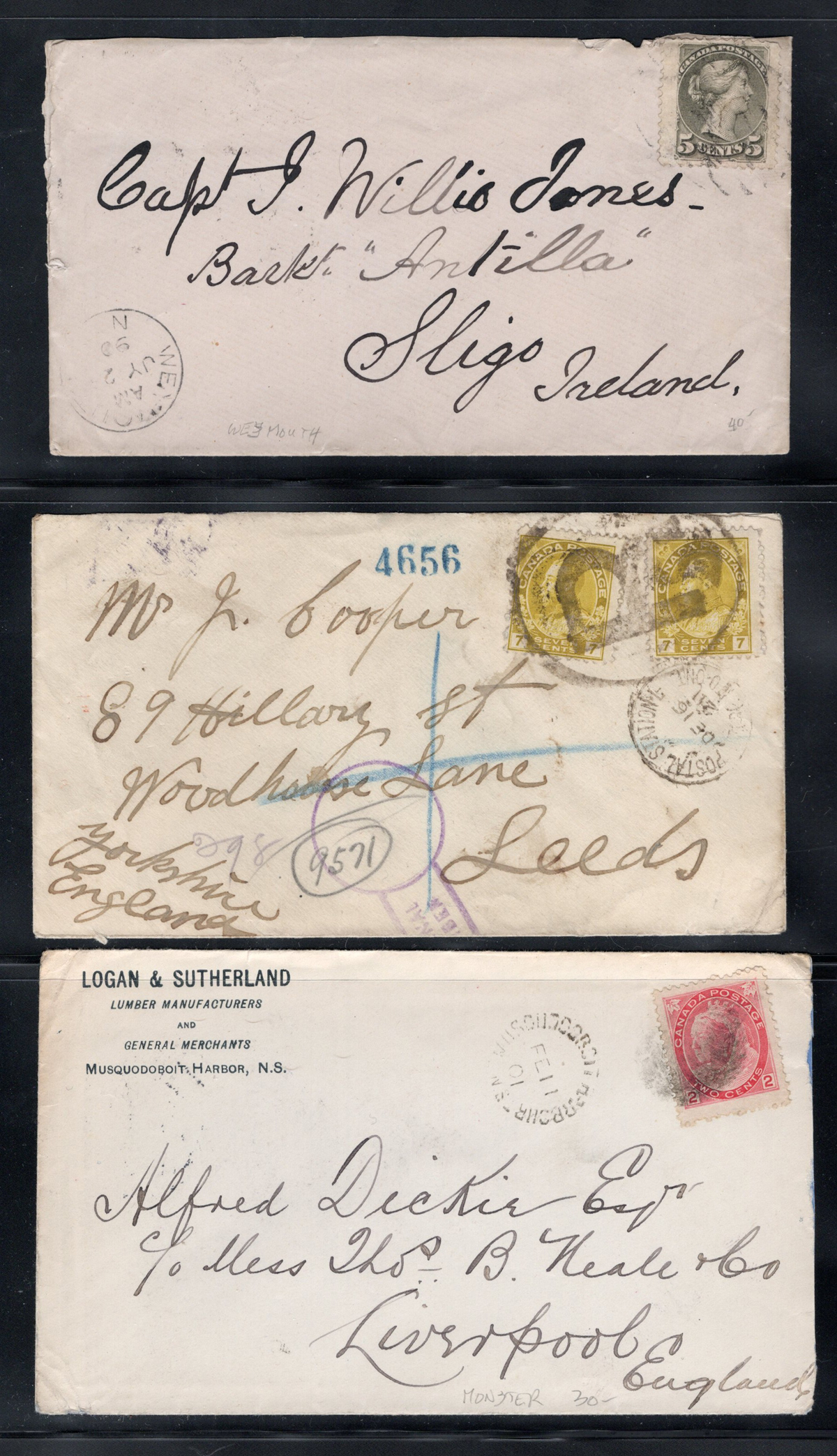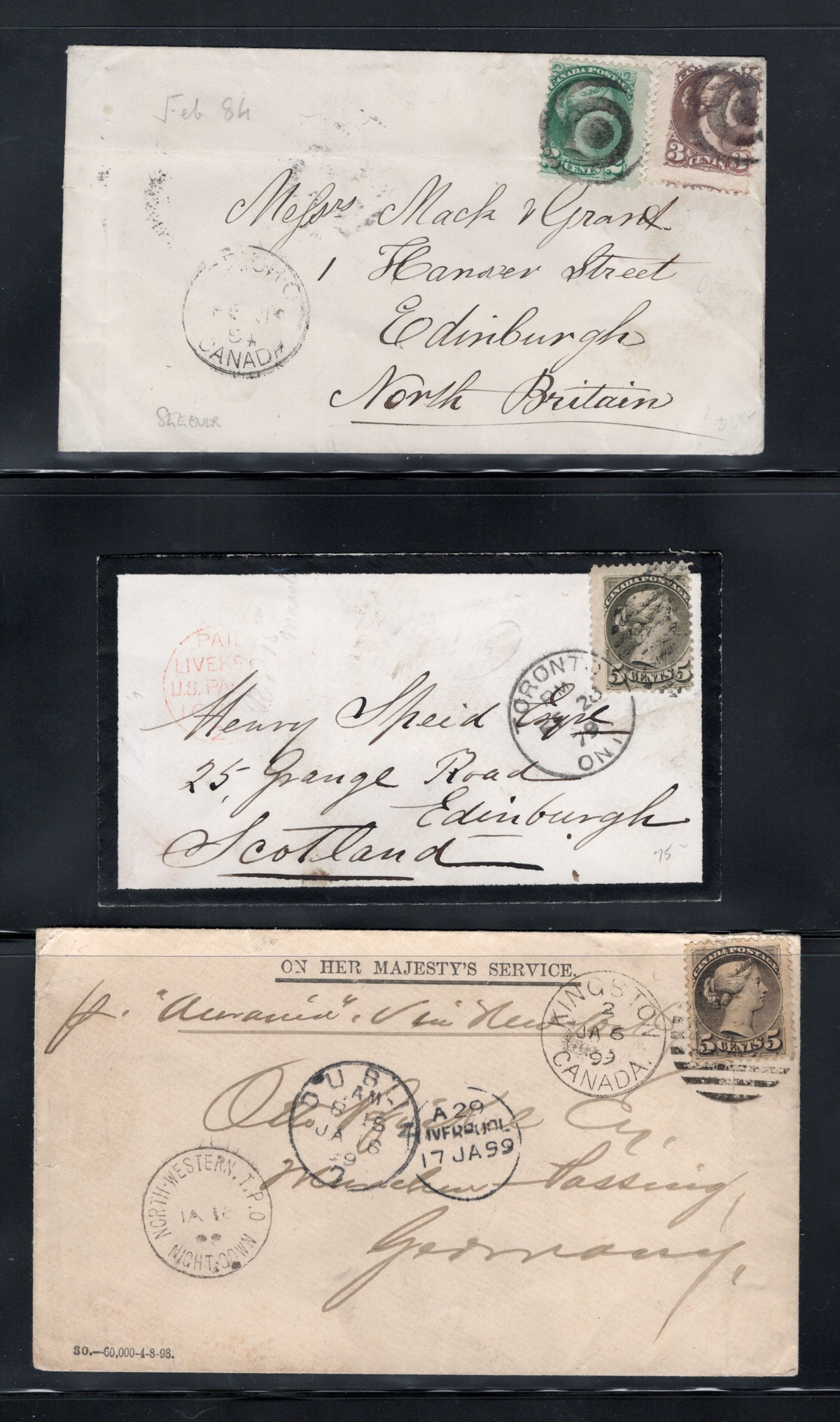 453 CVR 36/116 imageGroup of 10 Small Queen and Admiral Covers Mailed Overseas, with 1879 5c SQ mourning cover to Scotland, 1886 5c SQ to Scotland, re-directed to Ireland (with long letter still inside), 1888 5c SQ to Scotland (missing backflap), 1890 5c to Ireland, 1894 2c + 3c SQ to Scotland, 1899 5c SQ OHMS cover to Germany (through Ireland, with nice TPO postmark on front), 1901 2c Numeral (jumbo) to England, 1921 3c + 10c Admiral registered to Ireland and returned to sender, 1921 2x 7c Admiral registered to England, and 1927 8c pair Admiral registered to England with hand drawn "R". Good assortment of backstamps, some small faults here and there, still an interesting group. (Scan 1) (Scan 2) (Scan 3) (Scan 4) (All Scans) (All Images)