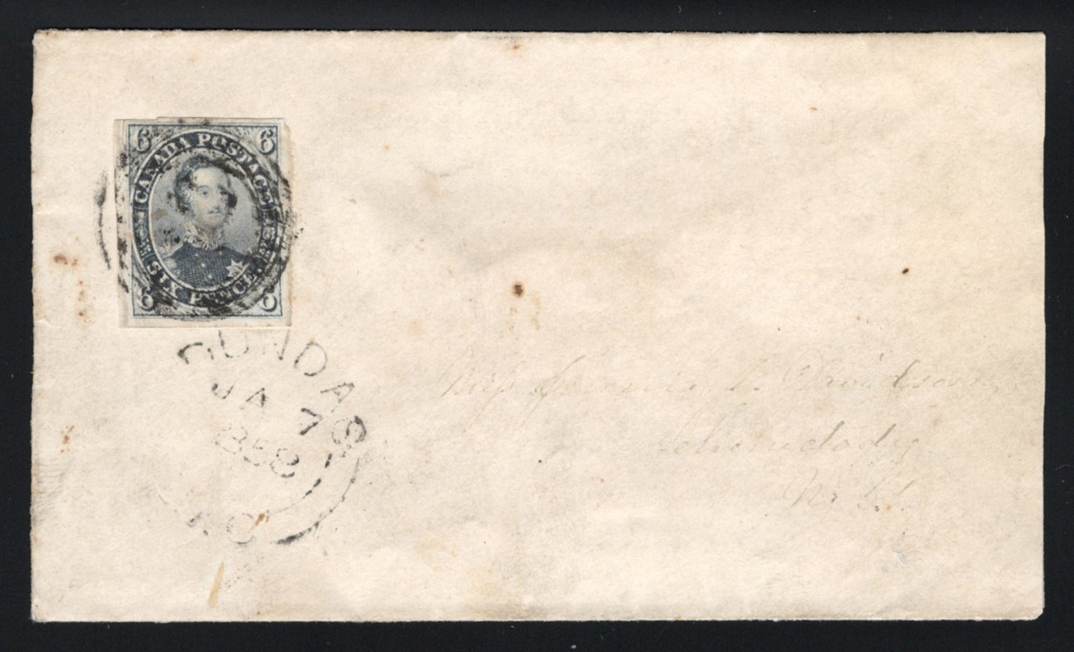 452 CVR 5 image1857 6d Slate Grey Consort Imperforate on Cross-Border Cover, mailed from Dundas U.C. on JAN.7.1858 to Lake Truelady, NY, franked with a 6d slate grey Consort imperforate, with fresh colour and 3 large margins, plus one at top which is well clear (small scissor cut in left margin does not detract) tied to cover by a 4-ring #12 (number not legible, but associated to Dundas P.O.). Very fine.