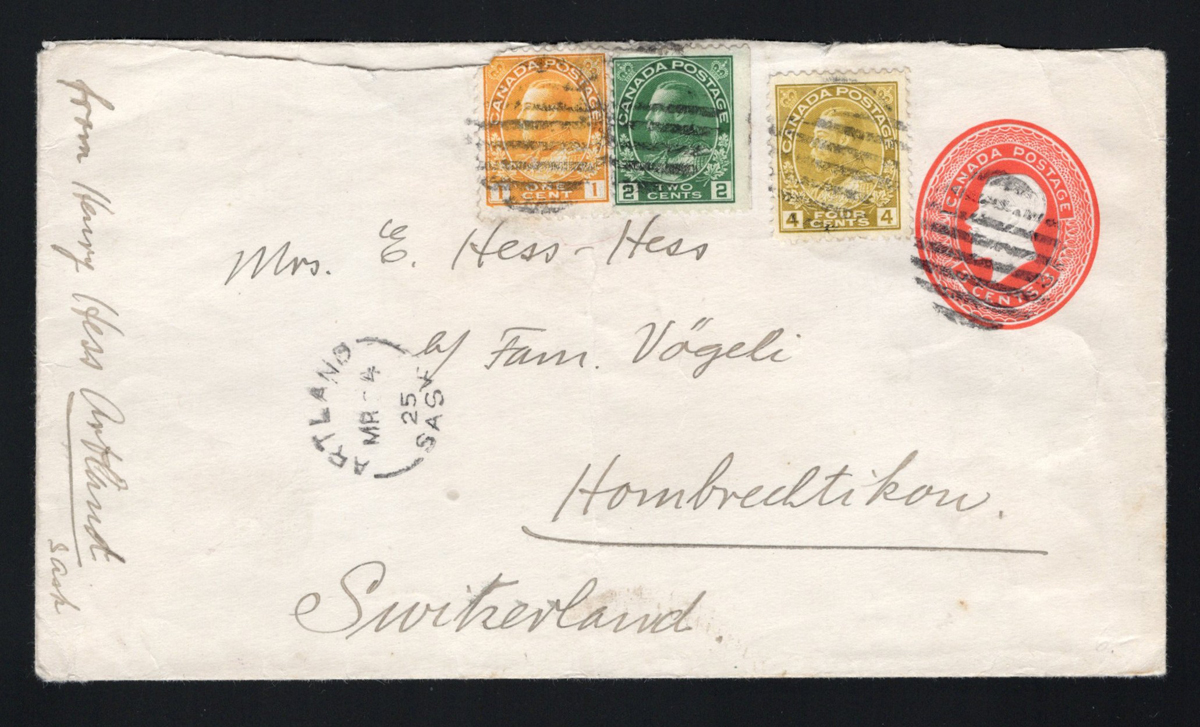 457 CVR 105, 107, 110 image1925 Artland Saskatchewan Admiral Cover to Switzerland, a 3c stationery envelope uprated with a 1c yellow orange, 2c green and 4c yellow ochre (paying 10c U.P.U. rate) mailed from Artland on MAR.4.1925 to Hombrechtikow, Switzerland. 1c stamp has a corner fault and vertical crease from the cover, else fine and attractive. Ex Brigham.