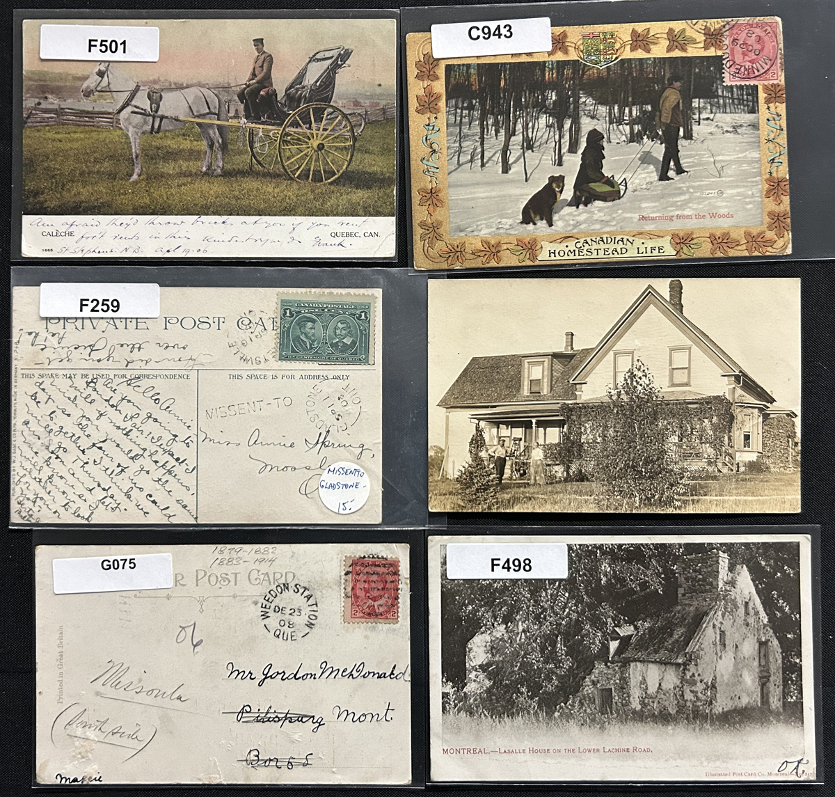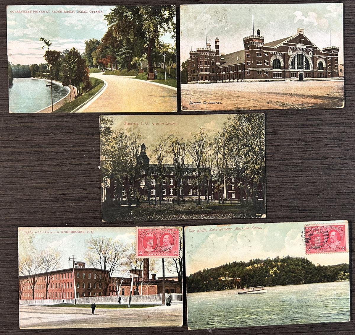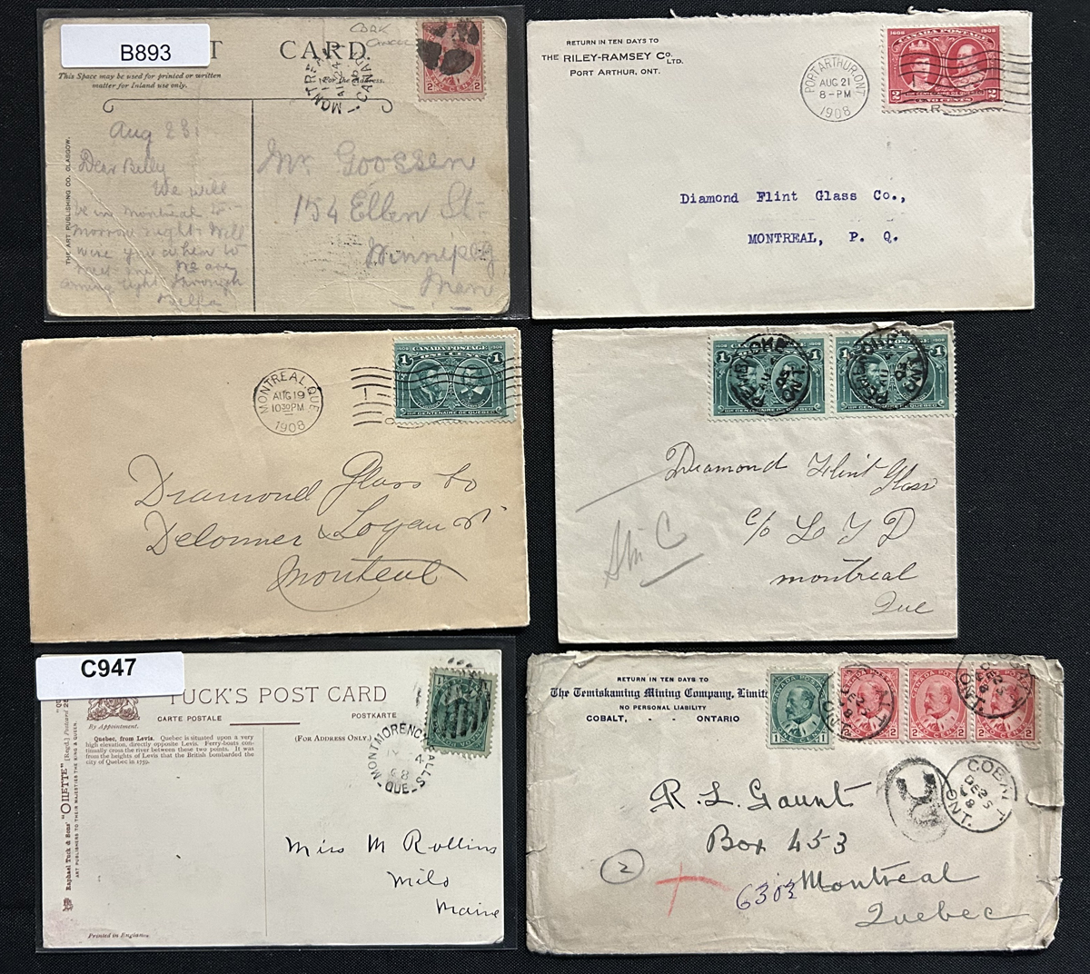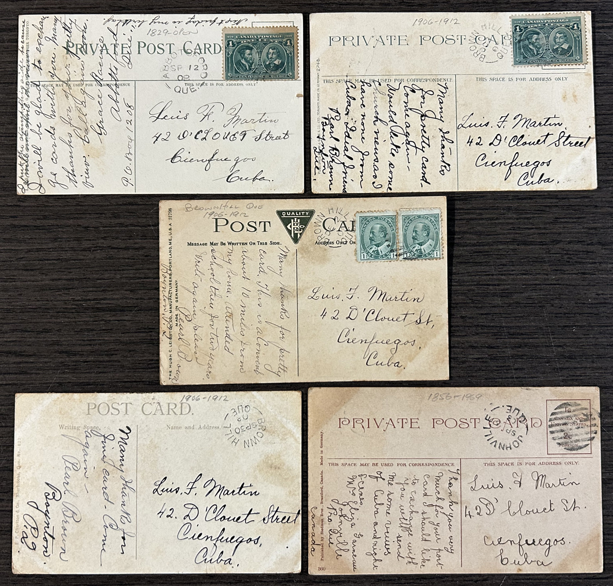 455 PC 89, 97, 98 imageGroup of 5 Picture Postcards Mailed to Cuba, all mailed from small towns in Québec, Abbotsford, Brown Hill (open 1906-1912) and Johnville, between SEP.5.1908 and DEC.2.1908. The cards are addressed to Cienfuegos, Cuba and are franked with 1c Québec, 2c Québec or a pair of 1c KEVII. Light overall staining, with no other faults. A scarce destination in this period. Cards are shown on both sides. (Scan 1) (Scan 2) (All Scans) (All Images)