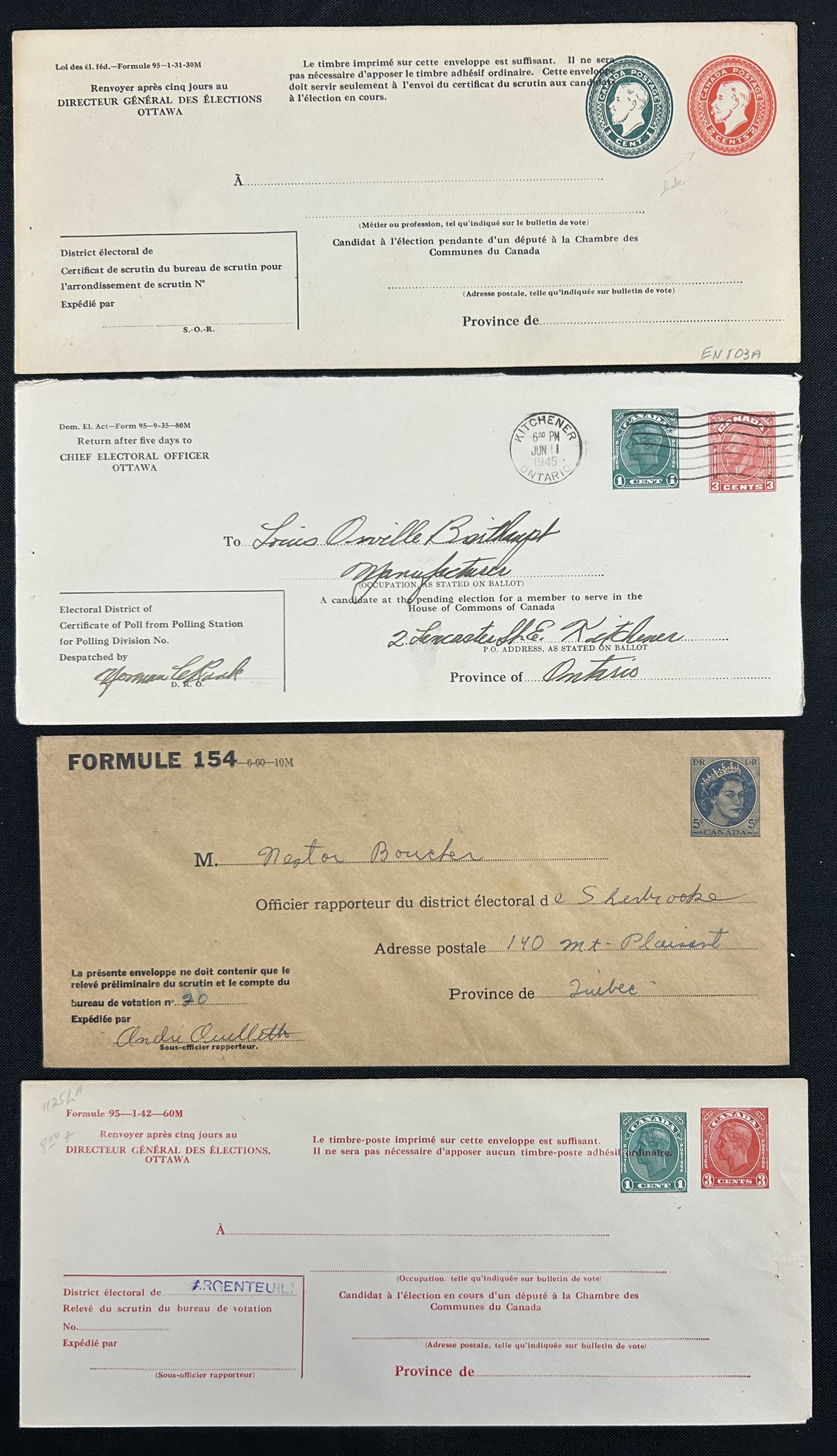 460 CVR   imageGroup of Election Envelopes Filling an Envelope Box, covers KGV to Centennial issues, with a mix of mint and used. Lots of better, including EN800f (x15 used), EN803a (mint, x8 used), EN808h (x4 mint), #820b (x3 used). With form numbers, English and French forms, compound dies. Lots of Wilding, Karsh and Cameos. Moderate to heavy duplication, Webb catalogue value is over U$3,000. (Scan 1) (Scan 2) (Scan 3) (Scan 4) (All Scans) (All Images)