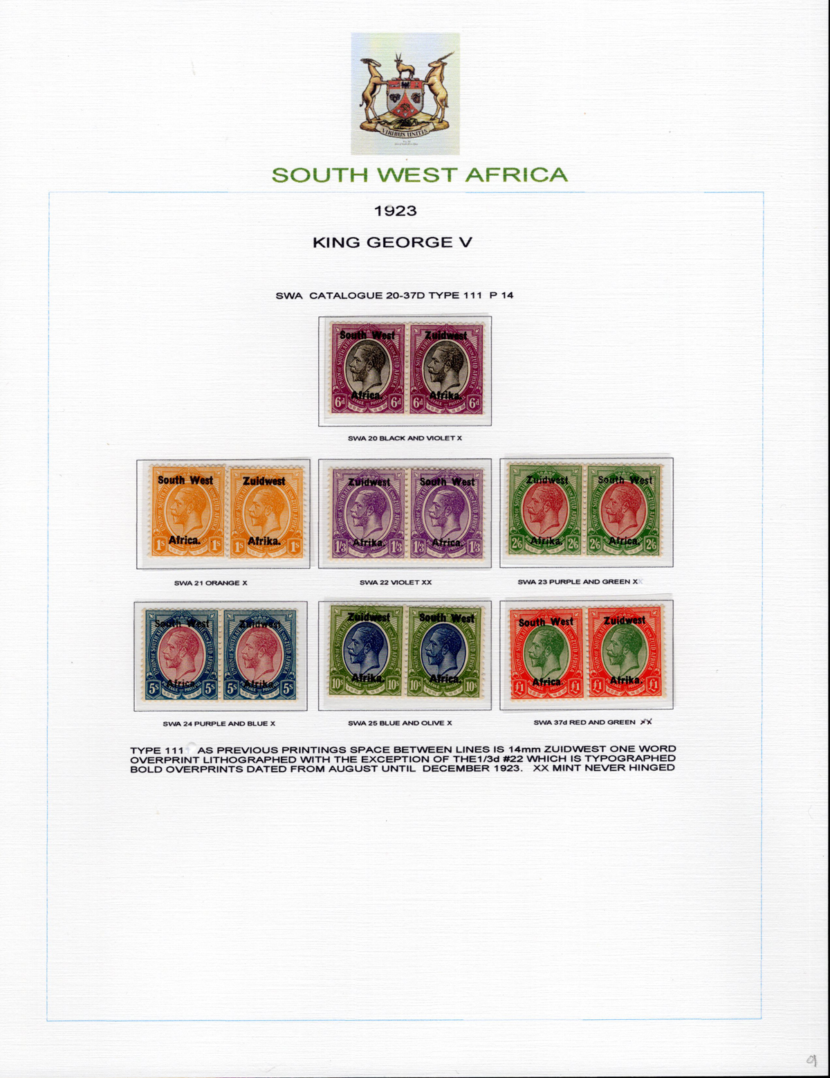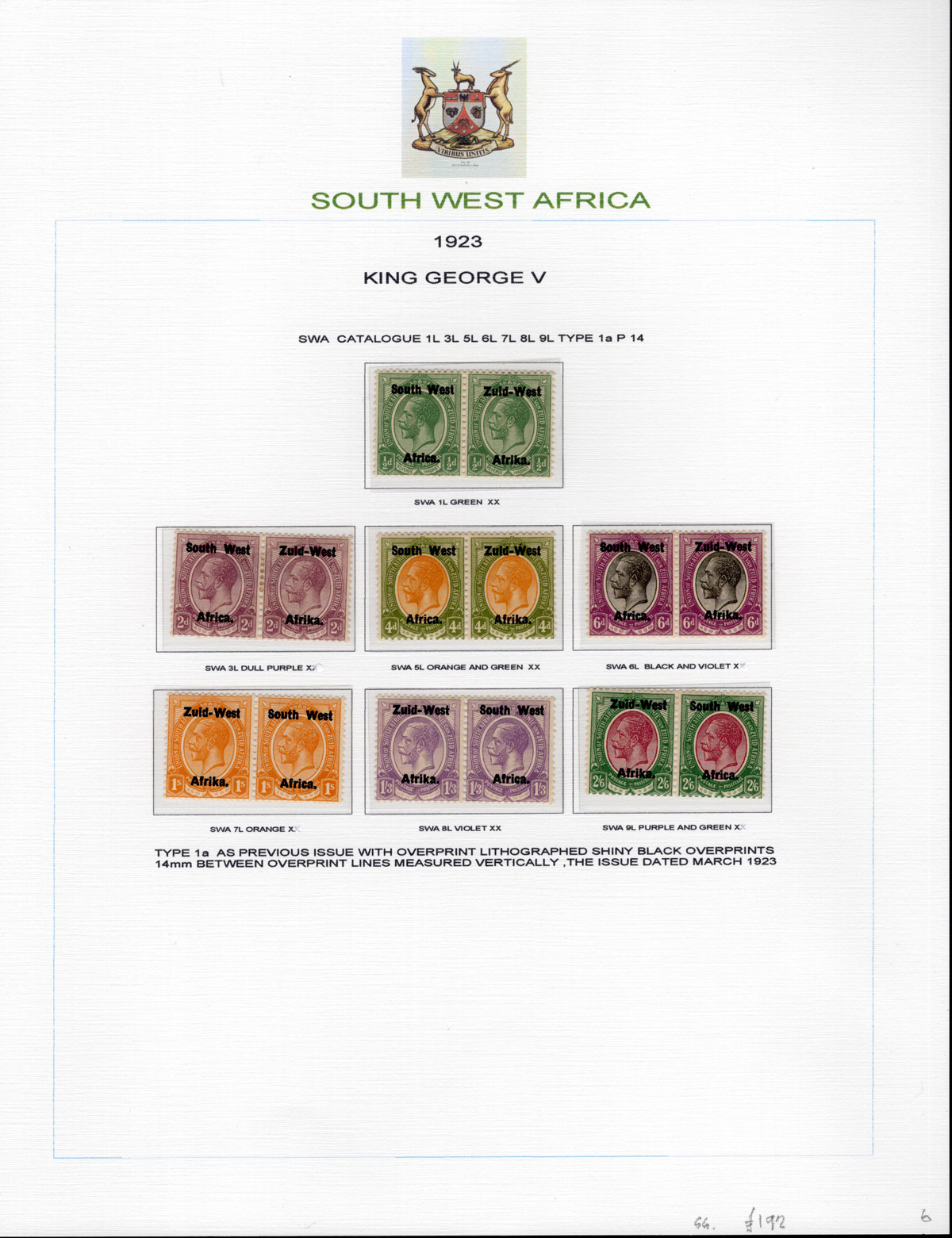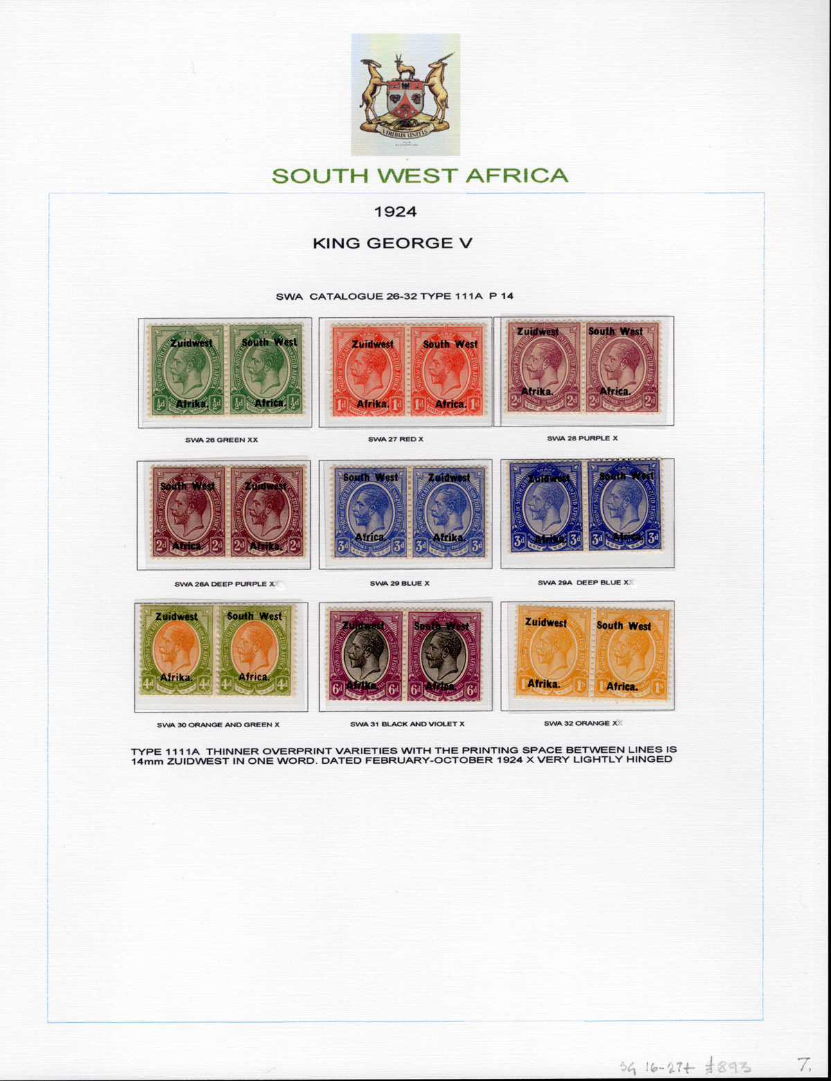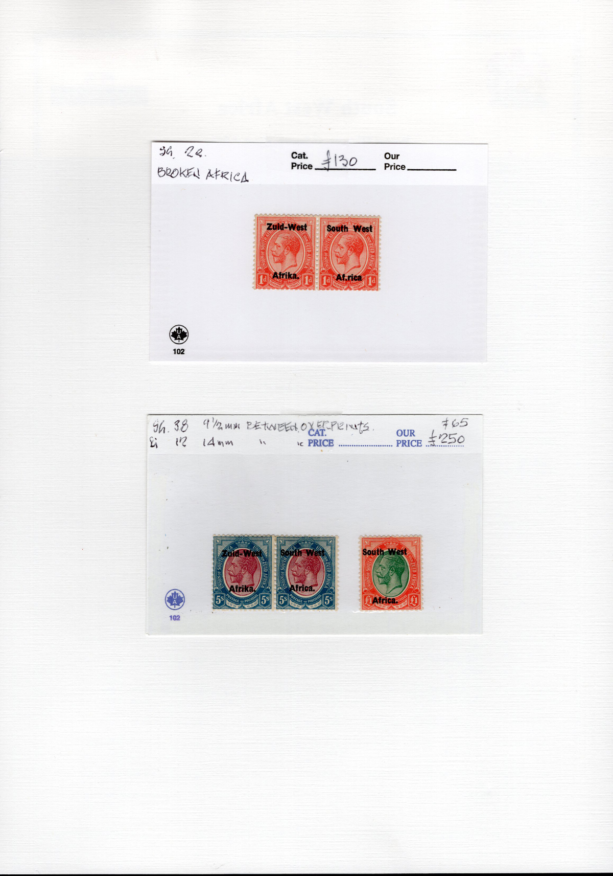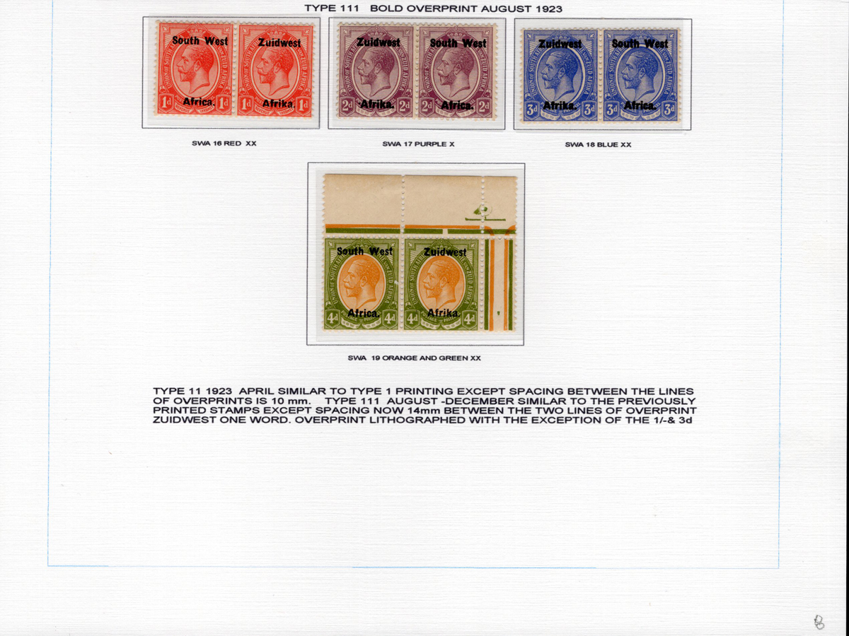 443 og/nh   imageAdvanced Study of the 1923-1924 King George V South West Africa Overprints, all neatly displayed and described on 7 album pages, with a total of 46 different bilingual pairs, plus a single £1 with 14mm spacing (£250). We note detailed descriptions of the several overprint settings, types, etc., and saw one pair with the “Af.rica” overprint variety. A spot check of many pairs revealed a mix of hinged and never hinged and we saw one pair that was separated, overall very fine. The items are identified by South African Stamp Colour catalogue number, but the owner carefully catalogued the group in Stanley Gibbons at £2,630. A scarce offering of such a detailed study. (Scan 1) (Scan 2) (Scan 3) (Scan 4) (Scan 5) (Scan 6) (Scan 7) (All Scans) (All Images)