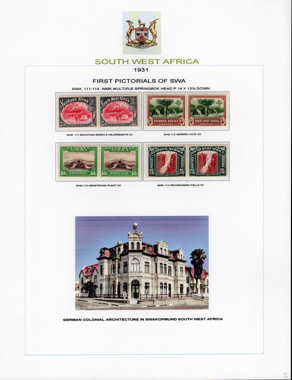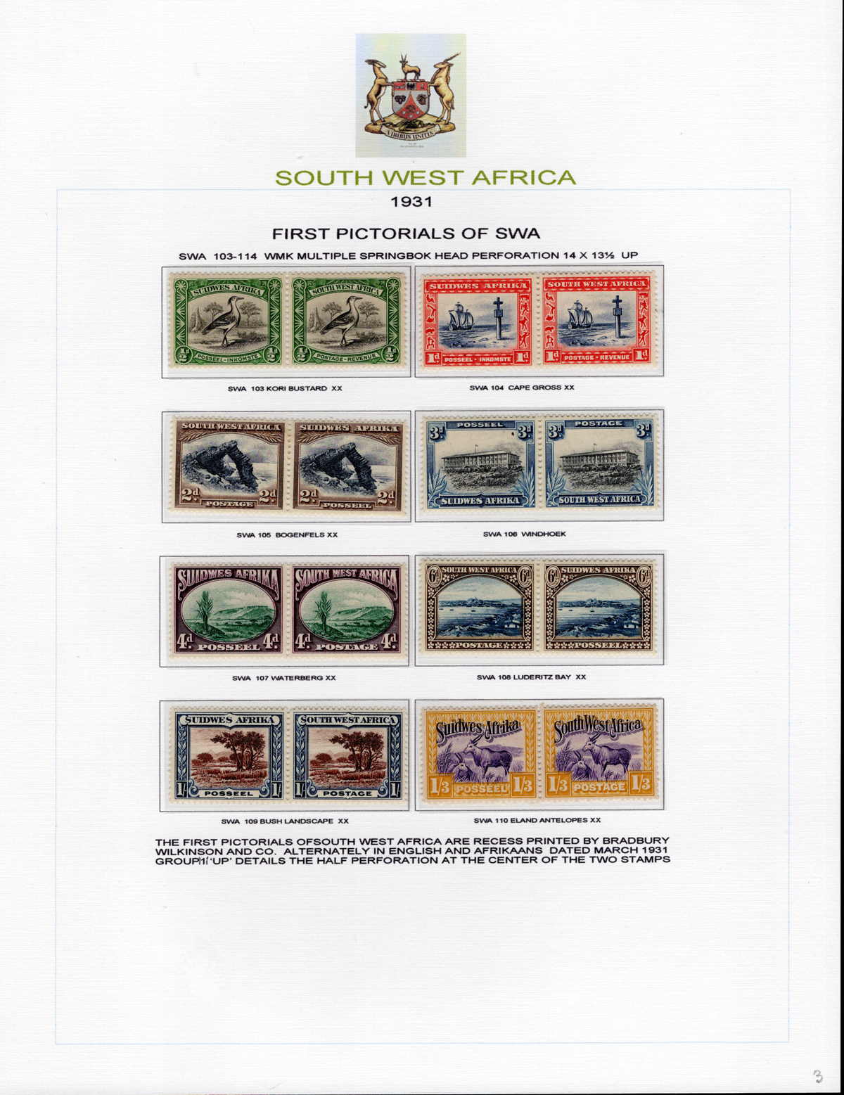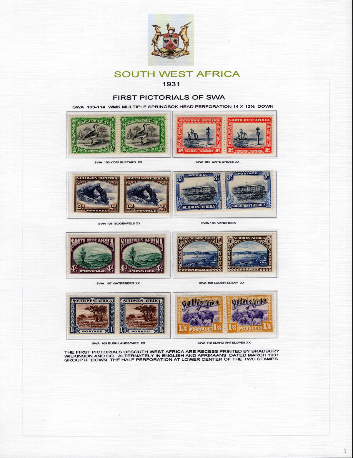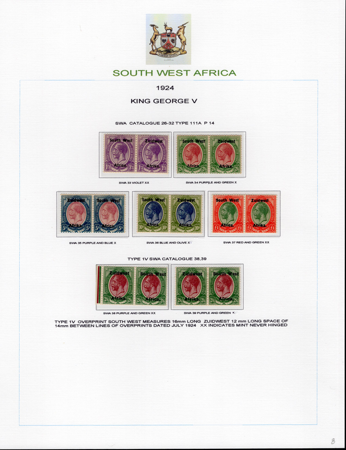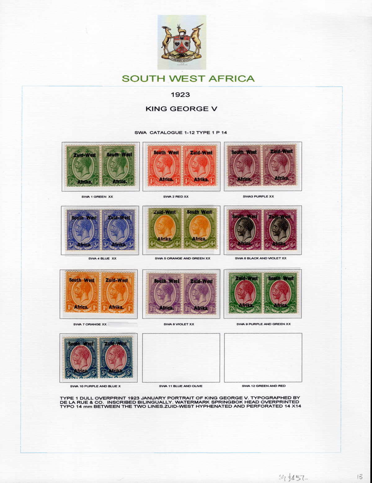 443 og/nh   imageAdvanced Study of the 1923-1924 King George V South West Africa Overprints, all neatly displayed and described on 7 album pages, with a total of 46 different bilingual pairs, plus a single £1 with 14mm spacing (£250). We note detailed descriptions of the several overprint settings, types, etc., and saw one pair with the “Af.rica” overprint variety. A spot check of many pairs revealed a mix of hinged and never hinged and we saw one pair that was separated, overall very fine. The items are identified by South African Stamp Colour catalogue number, but the owner carefully catalogued the group in Stanley Gibbons at £2,630. A scarce offering of such a detailed study. (Scan 1) (Scan 2) (Scan 3) (Scan 4) (Scan 5) (Scan 6) (Scan 7) (All Scans) (All Images)