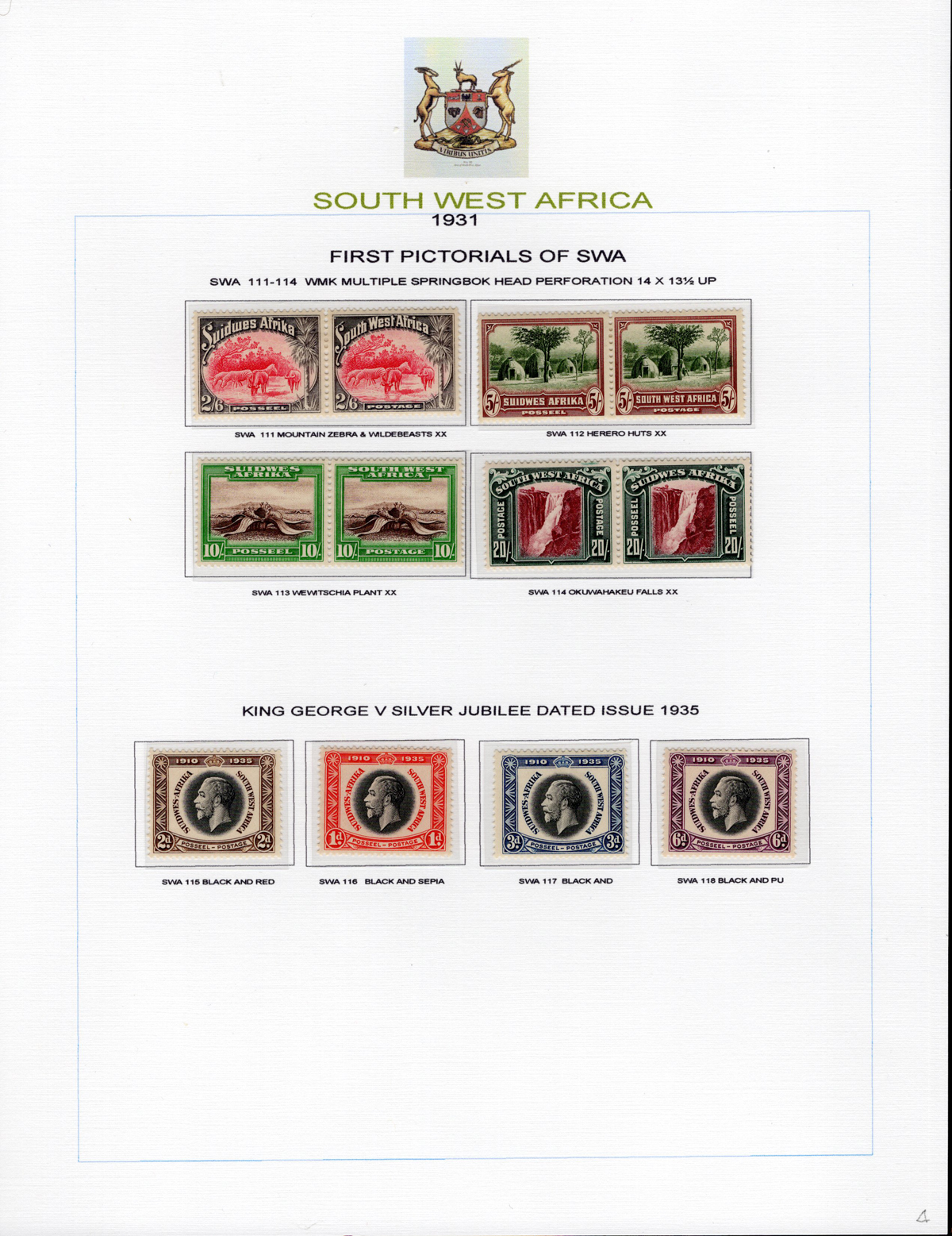 442 og/nh   image1931 ½d to 20sh First Pictorial Sets,with two mint sets of 12, one perforated 14 x 13¾ down and one 14 x 13¾ up (the up and down denote different perforations, as described in the South Africa specialized catalogue) all neatly displayed on four album pages. The down set is never hinged and the up set is lightly hinged, also includes the KGV Silver Jubilee set of four, overall very fine. Scott #s 108-124, with a basic value of U$470, S.G. catalogue #74-91, £512. (Scan 1) (Scan 2) (Scan 3) (Scan 4) (All Scans) (All Images)