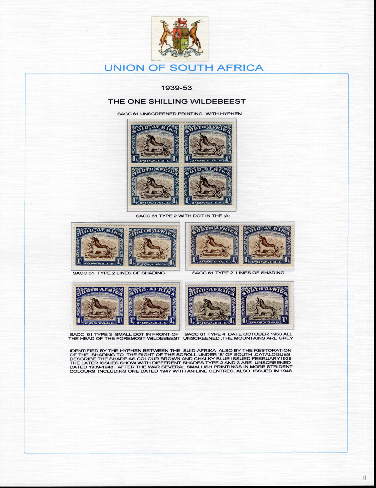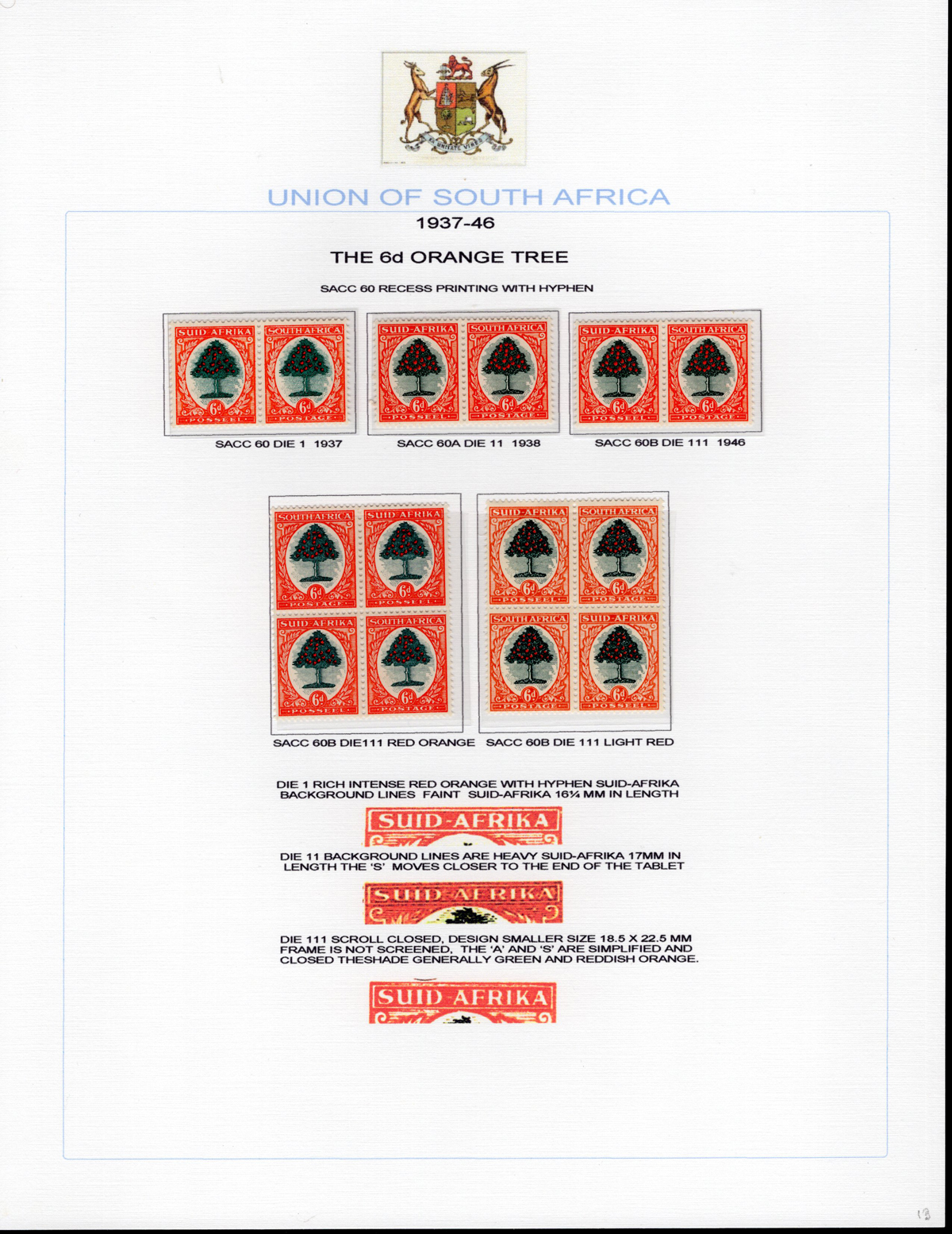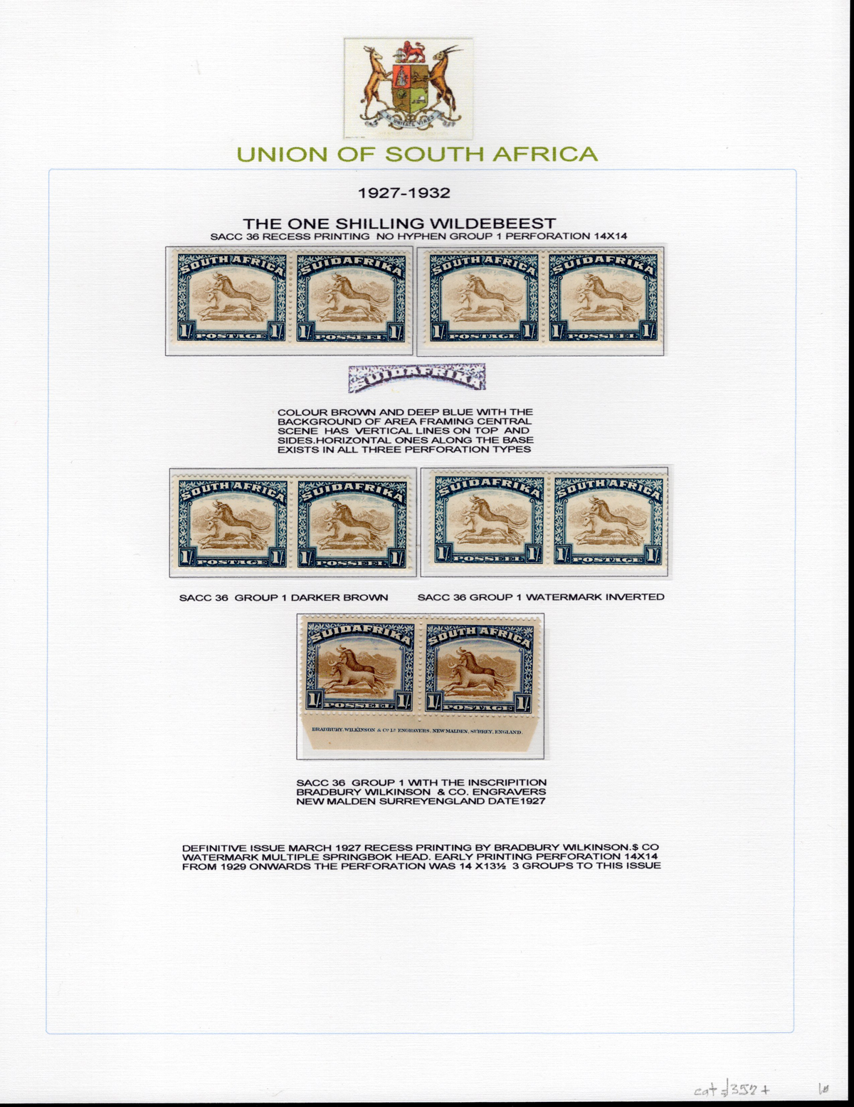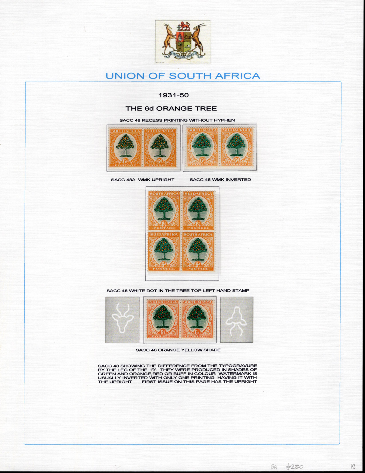 441   imageSpecialized Collection of the 1927-53 6d and 1sh Issues, all mint, includes a page of 6sh “without hyphen” (3 pairs and a block), 6d “with hyphen” (3 pairs and two blocks, Dies I, II and III, one block has one stamp stuck to the page), also one page each of the 1sh printings (with and without hyphen) with Type I (5 different pairs) and Type II and III (4 different pairs and a block of four). A lovely study of these issues, showing different shades, inverted watermarks, an imprint pair etc., all identified using the South African Stamp Colour Catalogue numbers. Mix of hinged and never hinged, overall fresh and very fine. Scott basic #s 25, 29, 59-61, 62, 62c for a total of U$298. Owner’s Stanley Gibbons value of £602. (Scan 1) (Scan 2) (Scan 3) (Scan 4) (All Scans) (All Images)