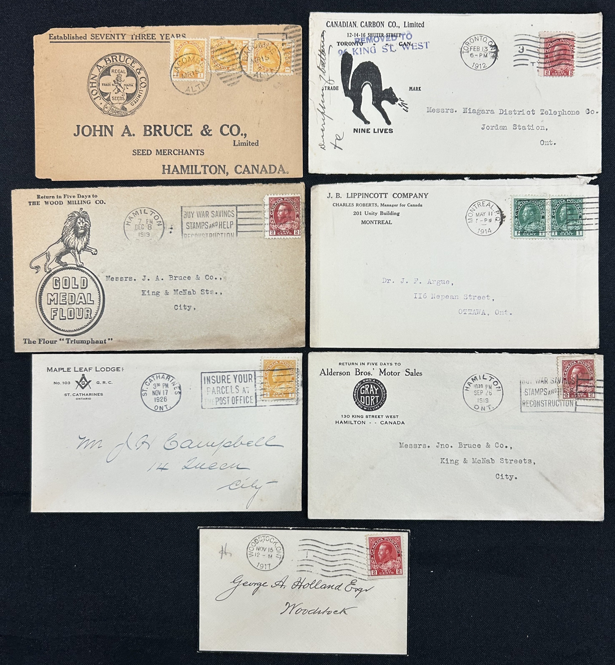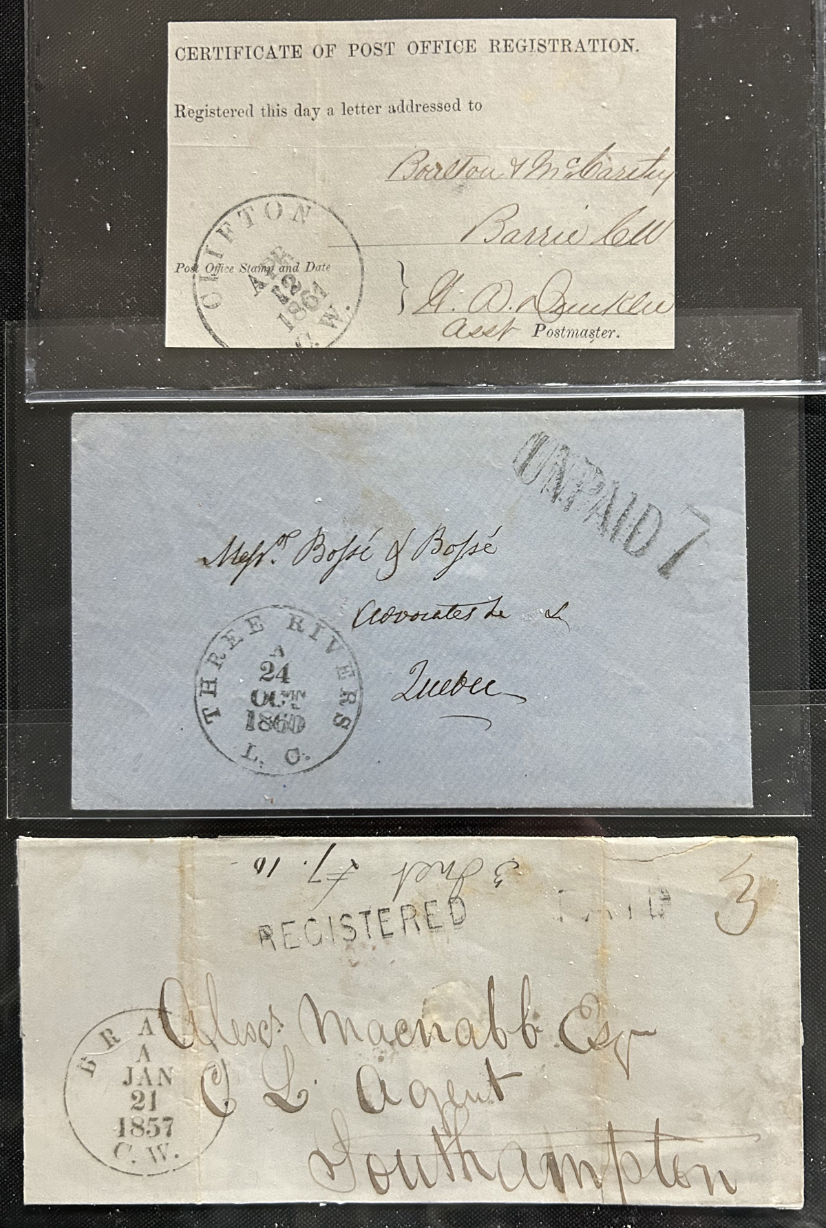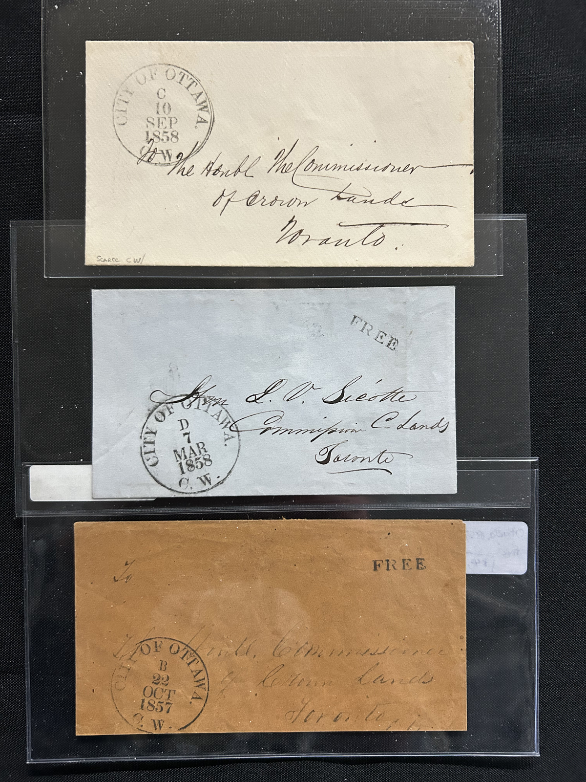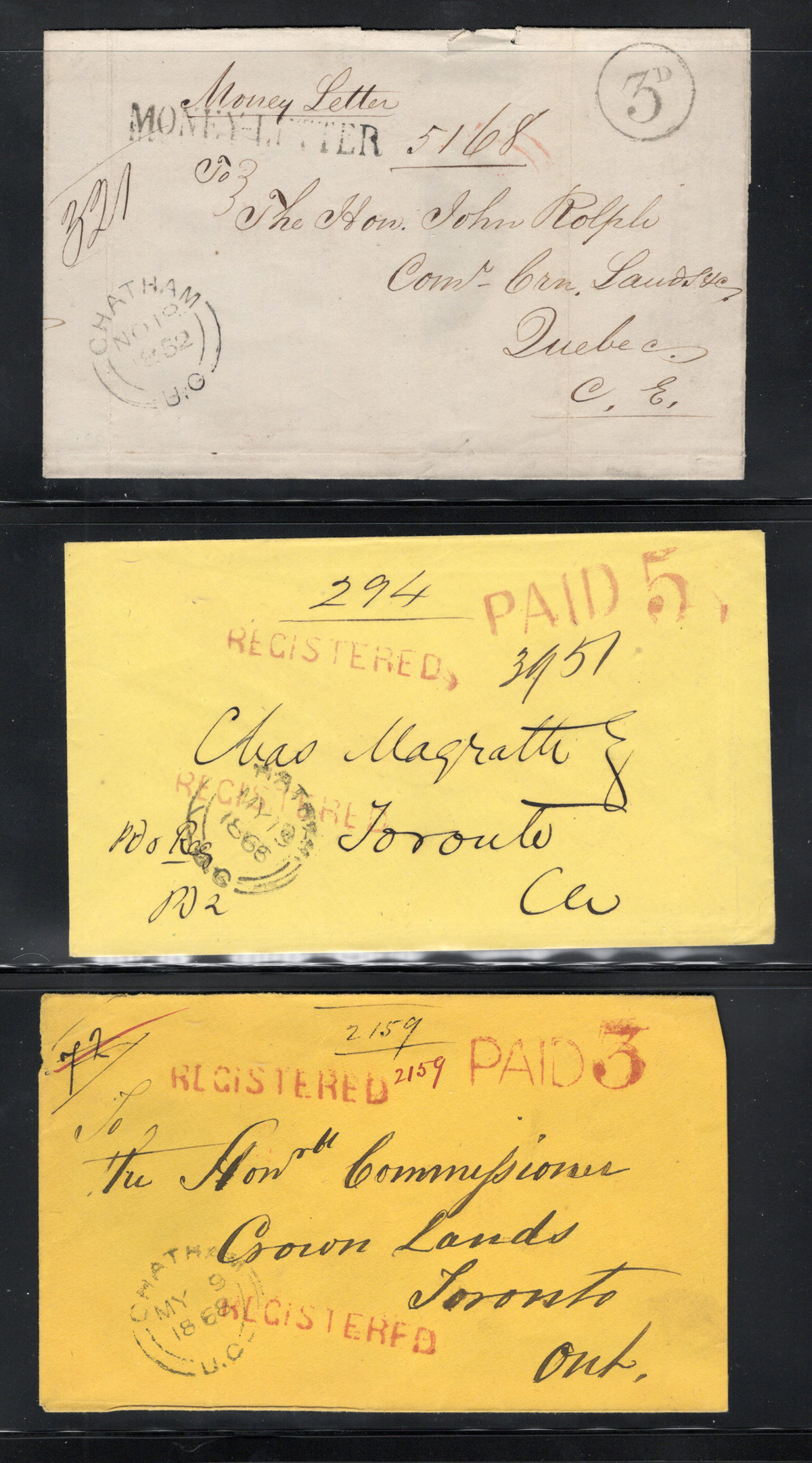 448 CVR   imageCollection of 14 Different "Ruggles", a.k.a. "Changeling" Type C.D.S. Postmarks on Cover, all used as despatch postmarks on covers or folded letters, with City of Ottawa (three, with B, C, D indicia), Brant (on registered), Clifton (on registration receipt), Three Rivers, Owen Sound, London, Saint John C.E., Wardsville, Toronto (with "1/2" rate handstamp), St. Hyacynthe C.E. (in red and in black), and Montreal L.C. (on registered letter to Kingston). Some have faults, else a better than average group of postmarks, with several very fine strikes. All are pictured. (Scan 1) (Scan 2) (Scan 3) (Scan 4) (All Scans) (All Images)