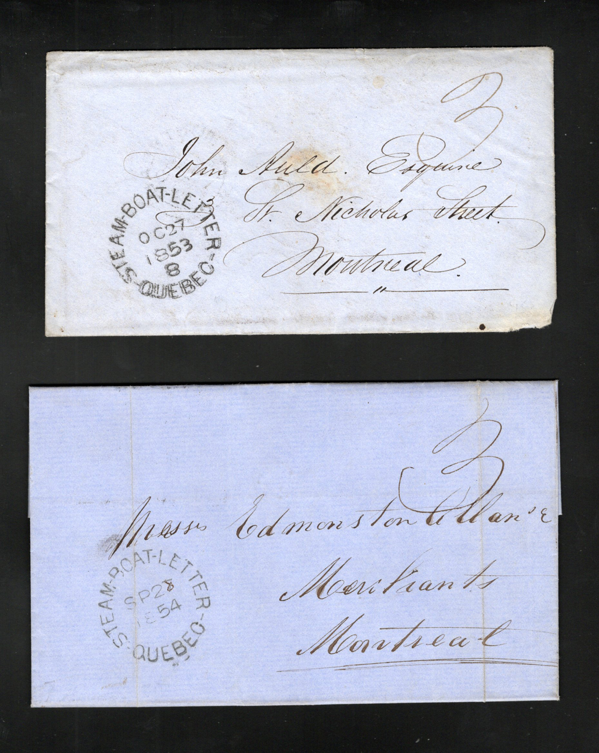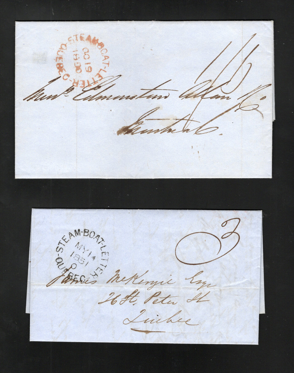 446 CVR   imageCollection of 4 Different "Steam-Boat-Letter / Québec" Covers, with OCT.19.1850 in red (no basal indicia), MAY.14.1851 in black (basal "0"), OCT.27.1853 in black (rare basal "8", ex Parsons) and SEP.28.1854 in black (no basal indicia). A very fine group. (Scan 1) (Scan 2) (All Scans) (All Images)