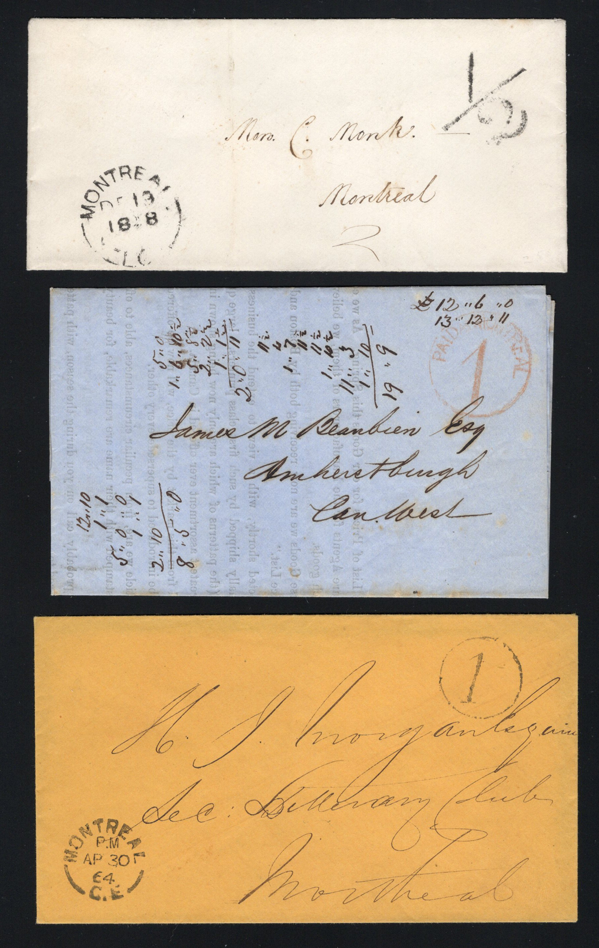447 CVR   imageThree Better Montréal Early Rate Markings, a small drop cover has a "1/2" rate handstamp (year date of despatch is unreadable), a folded printed matter letter to Amherstburg has a "PAID AT MONTREAL / 1" in circle in red (undated) and a APR.30.1864 drop cover has a "1" in circle, which may be a state of an older "1d" with "d" removed to be used in the decimal era. A fine to very fine trio.