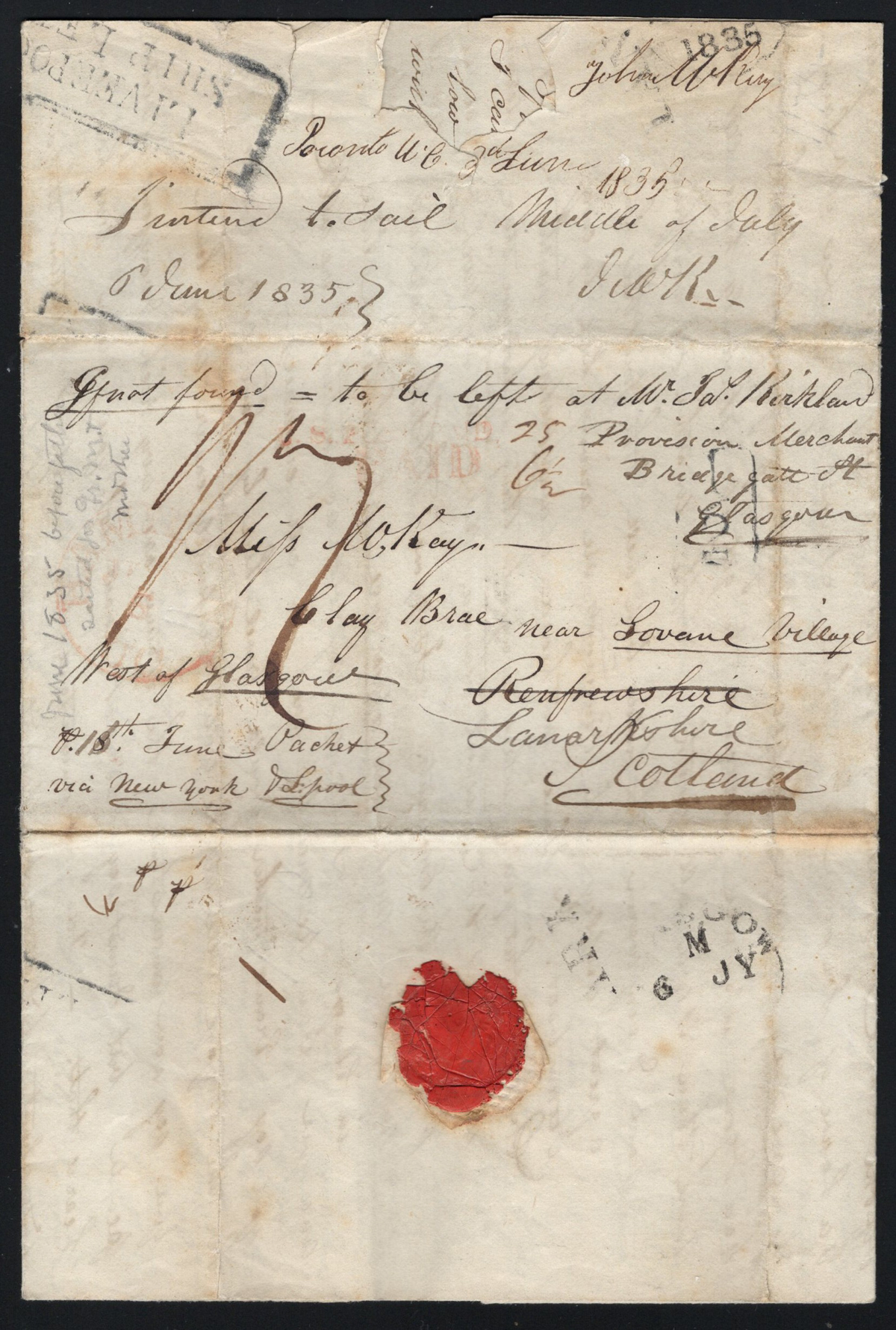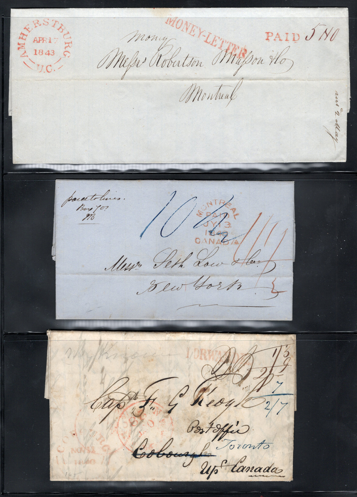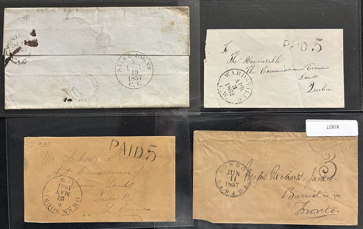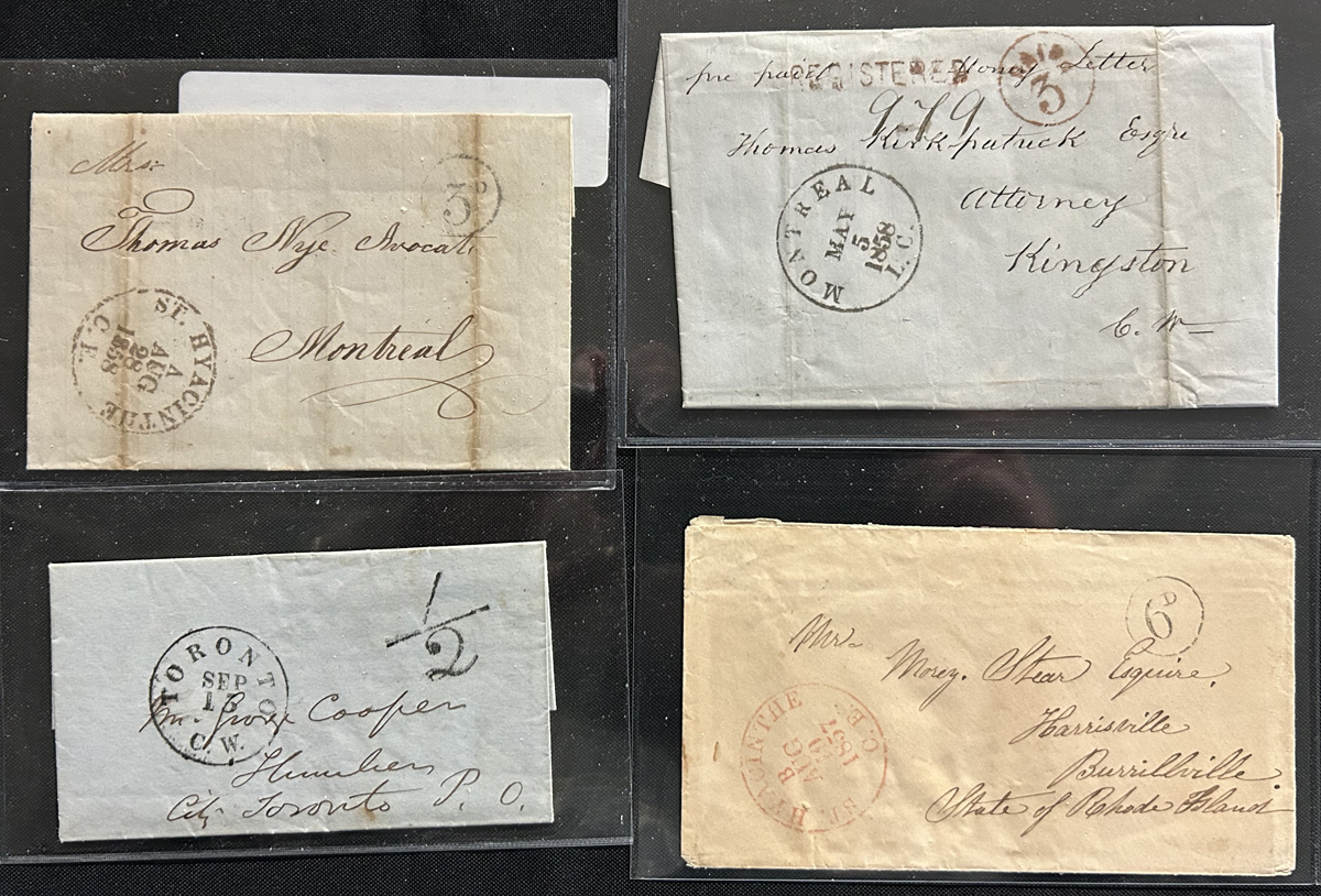 449 CVR   imageGroup of 5 Early Stampless Covers / Folded Letters, 1838 Montréal L.C. double circle to England via New York, 1851 New Glasgow L.C. double circle on faulty cross-border cover with Montréal backstamp, 1843 Rawdon L.C double circle on folded letter to Kingston, 1840 Prescott U.C. double circle O.H.M.S. to London England (front only), and 1835 Toronto (dateline inside of a very fine folded letter to Lanarkshire Scotland (with Lanark straightline receiver on back), through Hamilton (c.d.s. transit in red) with boxed "Liverpool / Ship Letter" handstamp and Glasgow transit dated JUL.6.1838. Faults on some, else overall fine. (Scan 1) (Scan 2) (Scan 3) (All Scans) (All Images)