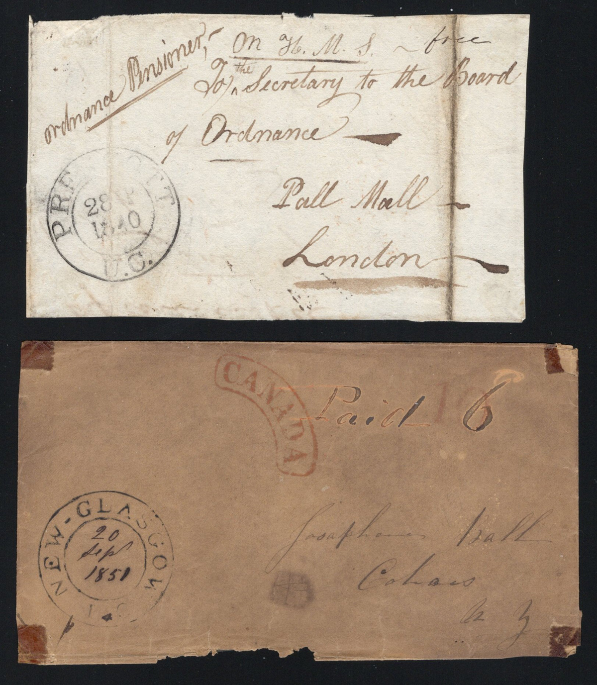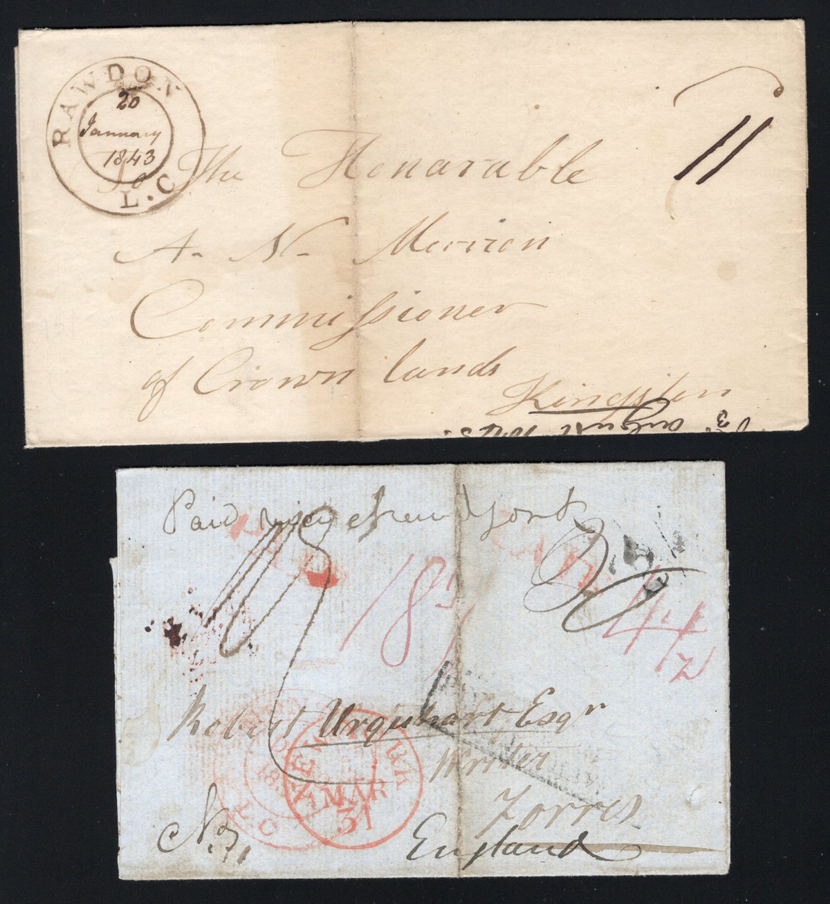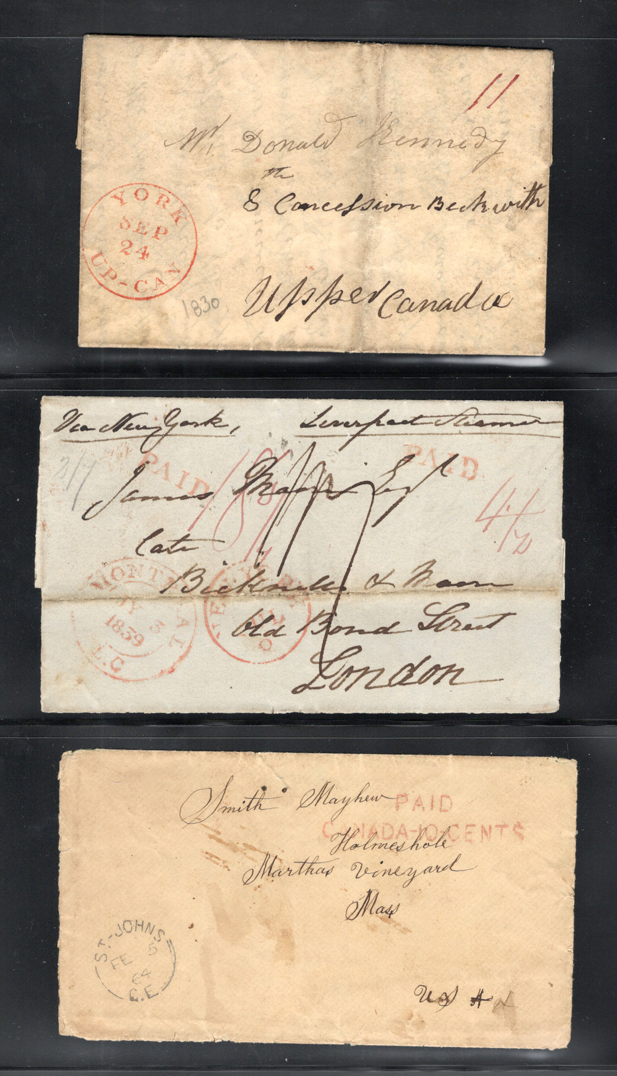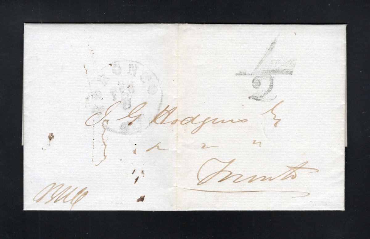 449 CVR   imageGroup of 5 Early Stampless Covers / Folded Letters, 1838 Montréal L.C. double circle to England via New York, 1851 New Glasgow L.C. double circle on faulty cross-border cover with Montréal backstamp, 1843 Rawdon L.C double circle on folded letter to Kingston, 1840 Prescott U.C. double circle O.H.M.S. to London England (front only), and 1835 Toronto (dateline inside of a very fine folded letter to Lanarkshire Scotland (with Lanark straightline receiver on back), through Hamilton (c.d.s. transit in red) with boxed "Liverpool / Ship Letter" handstamp and Glasgow transit dated JUL.6.1838. Faults on some, else overall fine. (Scan 1) (Scan 2) (Scan 3) (All Scans) (All Images)