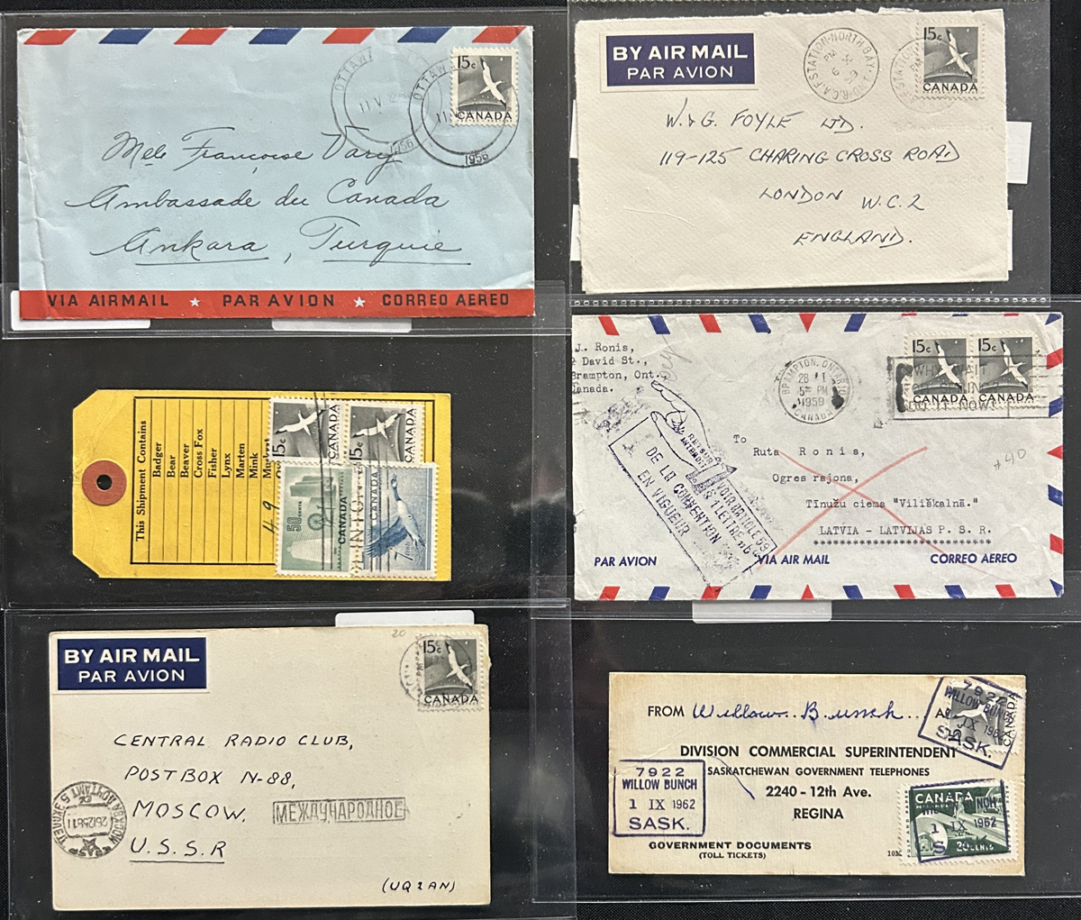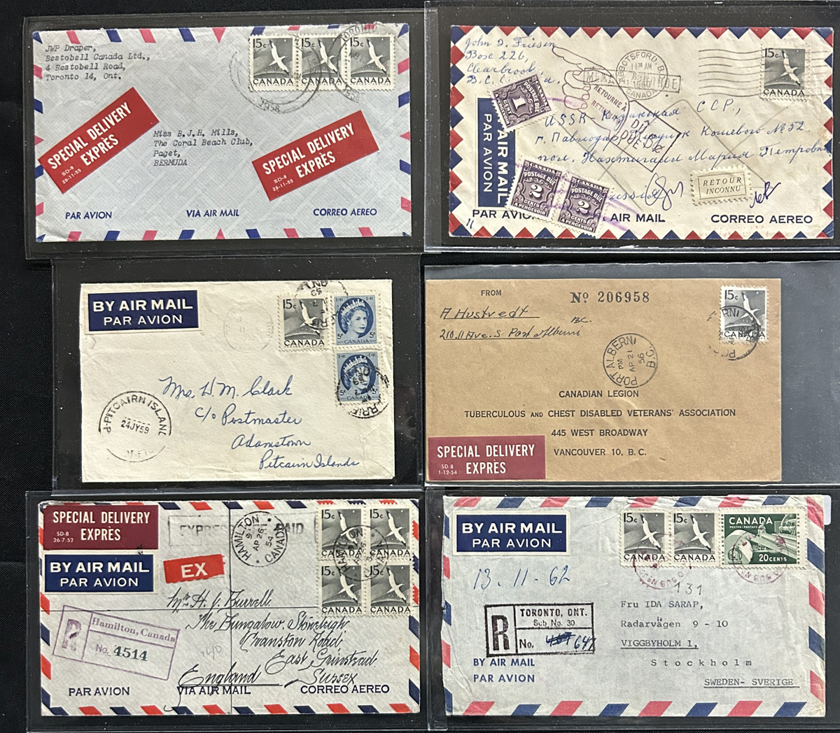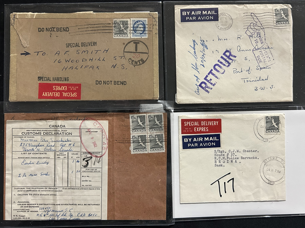458 CVR/PC 343 imageCollection of Postal History of the 1954 15c Gannet Issue, consisting of 54 covers and cards franked with the 15c Gannet. We note rates paying for registered, airmail, double or triple weight and other services including special delivery. Destinations include Switzerland, GB, Sweden, Germany, Bermuda, Rhodesia, Pitcairn Islands, Australia, India, France, Greece, Russia, Czechoslovakia, Brazil, Austria, Ireland, Poland, Denmark, Latvia, Hungary, Trinidad and Turkey. There is lots of postmark interest, not to mention rates and much more, noting some postage due, parcel tags, a Christmas gift wrapper mailed to Germany with customs label, a customs declaration label on cover, military uses, and much more. Some have faults, still a great start to an exhibit, just waiting to be studied and mounted. Would be a good accompaniment to the 15c Gannet pre-production material lot offered in our Canadian stamp section. (Scan 1) (Scan 2) (Scan 3) (Scan 4) (All Scans) (All Images)