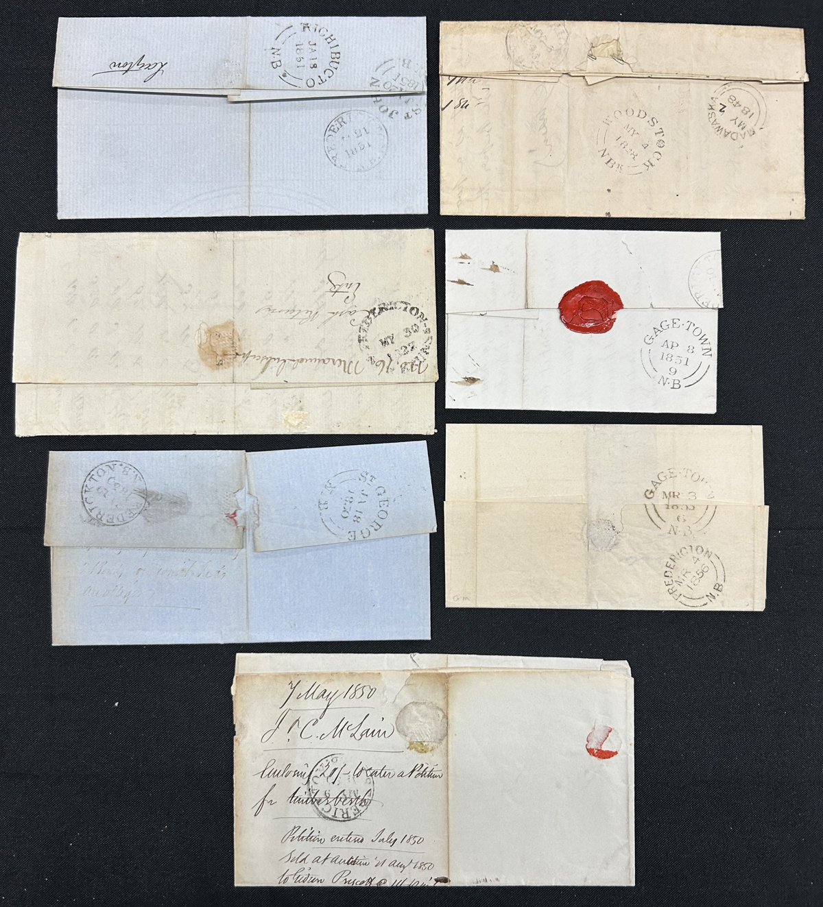 451 CVR   imageGroup of 7 New Brunswick Stampless Folded Letters, 1848 St Francis of Madawaska to Fredericton via Woodstock, 1850 St John to Fredericton1850 St George to Fredericton, 1856 Gagetown to Fredericton, 1827 Fredericton to Miramichi, 1851 Gagetown to Fredericton and 1851 Richibucto to Fredericton via St John. A useful group for postmarks, rates and routes, overall fine. (Scan 1) (Scan 2) (All Scans) (All Images)