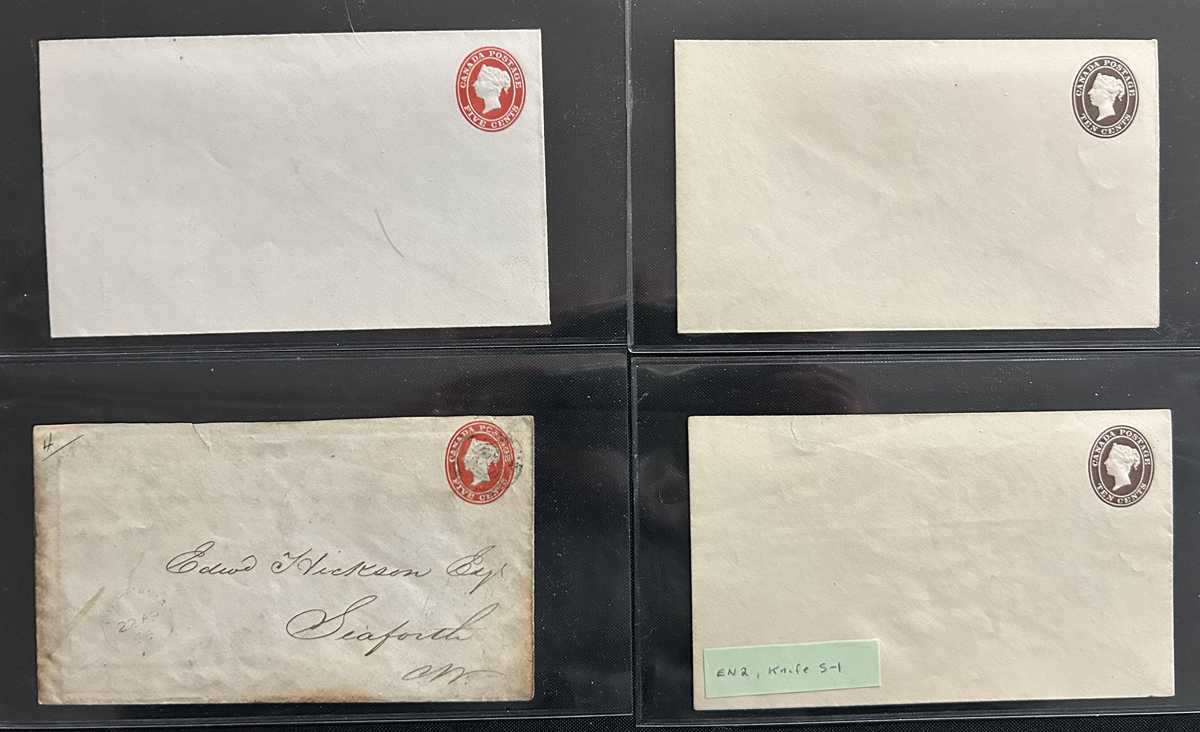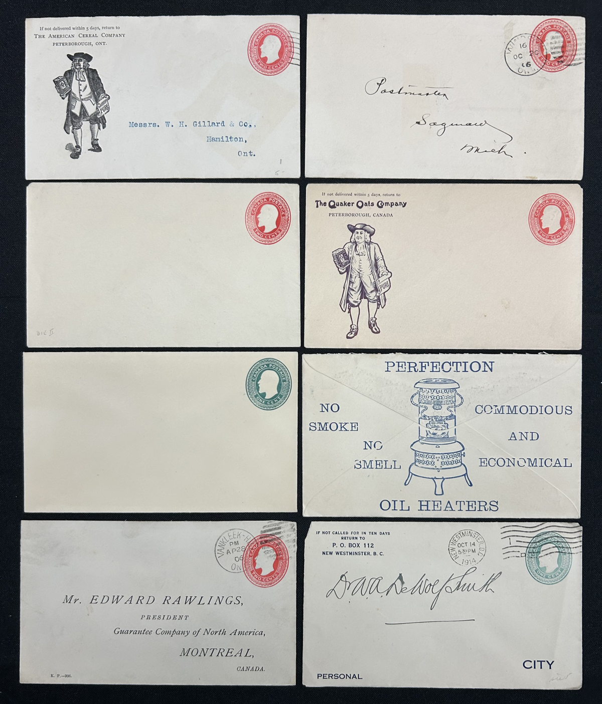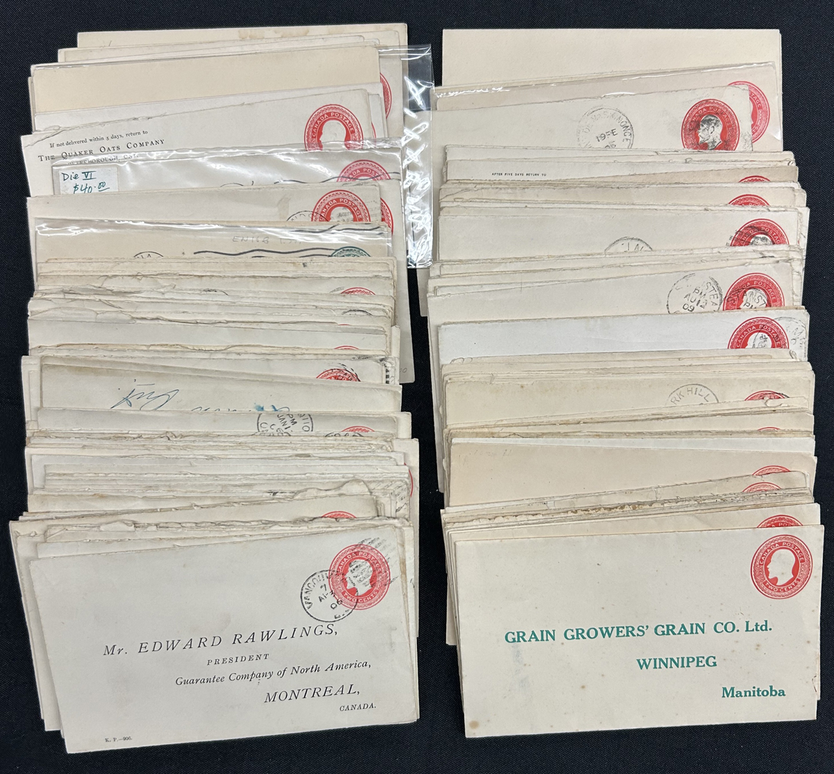 477 CVR EN24-EN25 imageA Large Handful of King Edward VII 1c and 2c Mint and Used Envelopes, most awaiting identification of die types (we did see 3x 2c die IV used). There are five with “Quaker Oats” corner cards showing William Penn, and other printed addresses and some small-town cancels, duplexes, etc. Overall fine to very fine. (Scan 1) (Scan 2) (All Scans) (All Images)