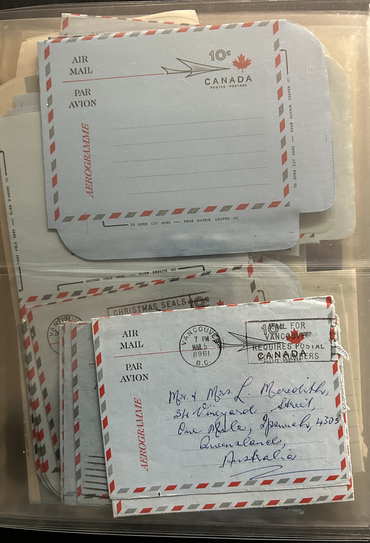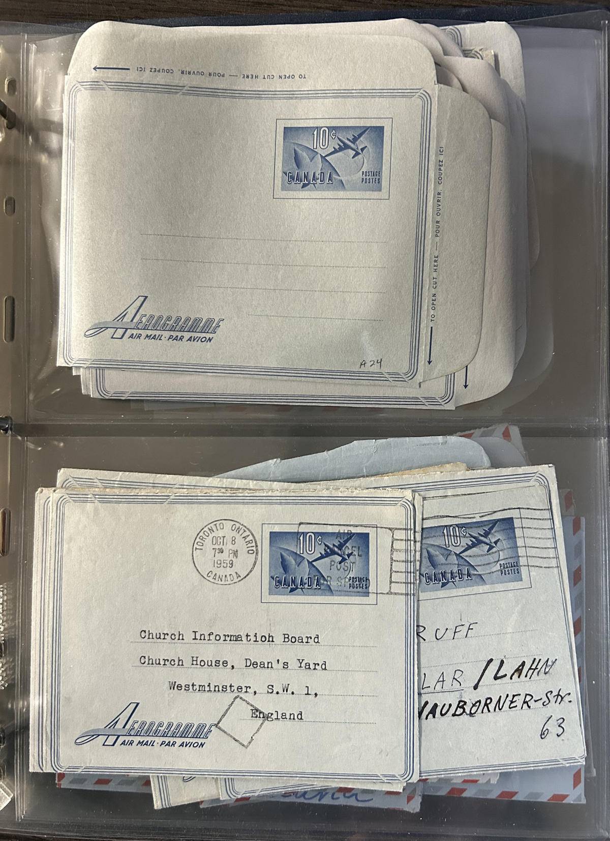 474 A2/A29 imageSubstantial Aerogramme Holding – Part 1, King George VI to the “Globe over Leaf” Design, with both mint and used (all to proper overseas destinations), with up to a dozen of a type, including knife and watermark variants, large and small “52” on the “Landscape” issue. Individual items with catalogue values to U$50. Packed into a large Uni-Safe binder with matching slipcover. Photos only show a small sampling. (Scan 1) (Scan 2) (Scan 3) (Scan 4) (Scan 5) (Scan 6) (Scan 7) (Scan 8) (Scan 9) (All Scans) (All Images)