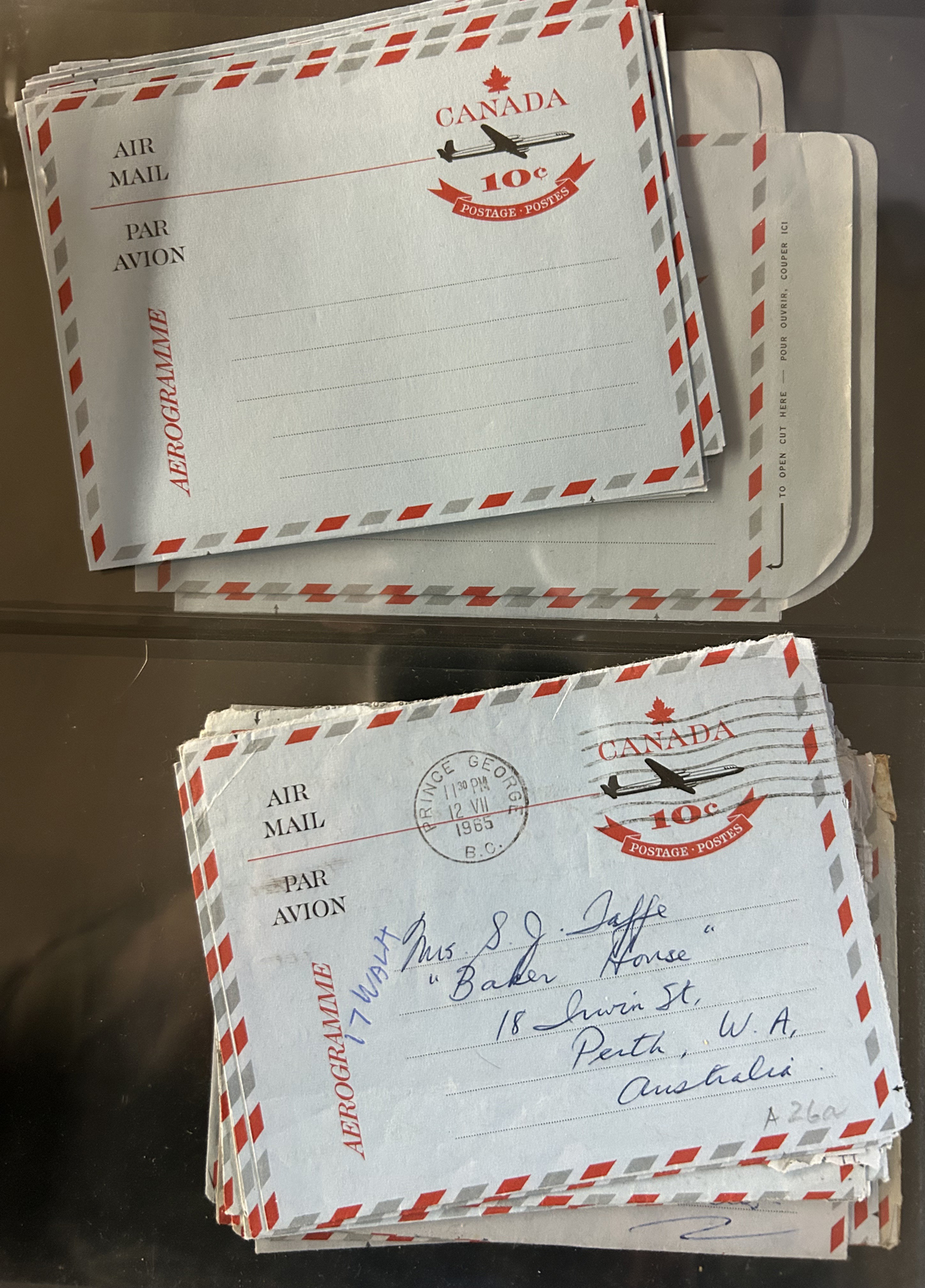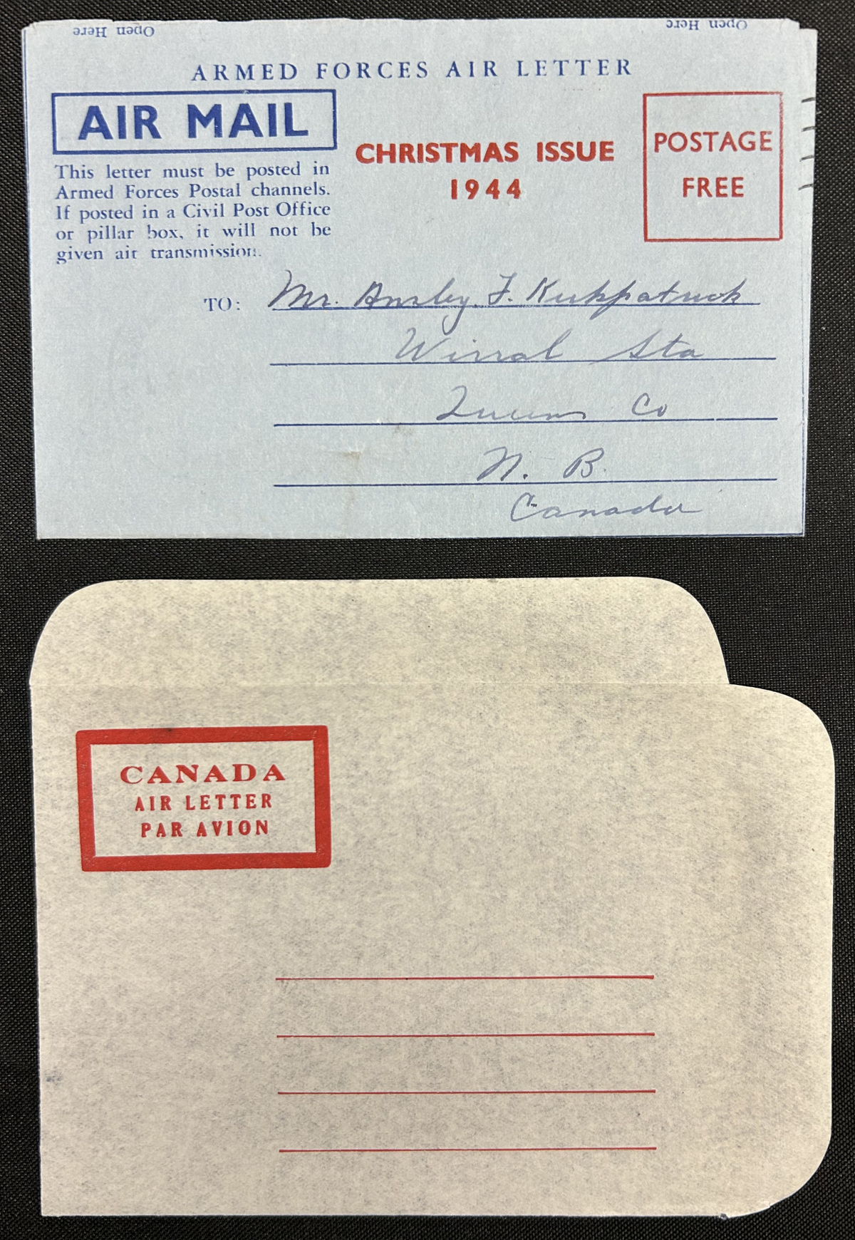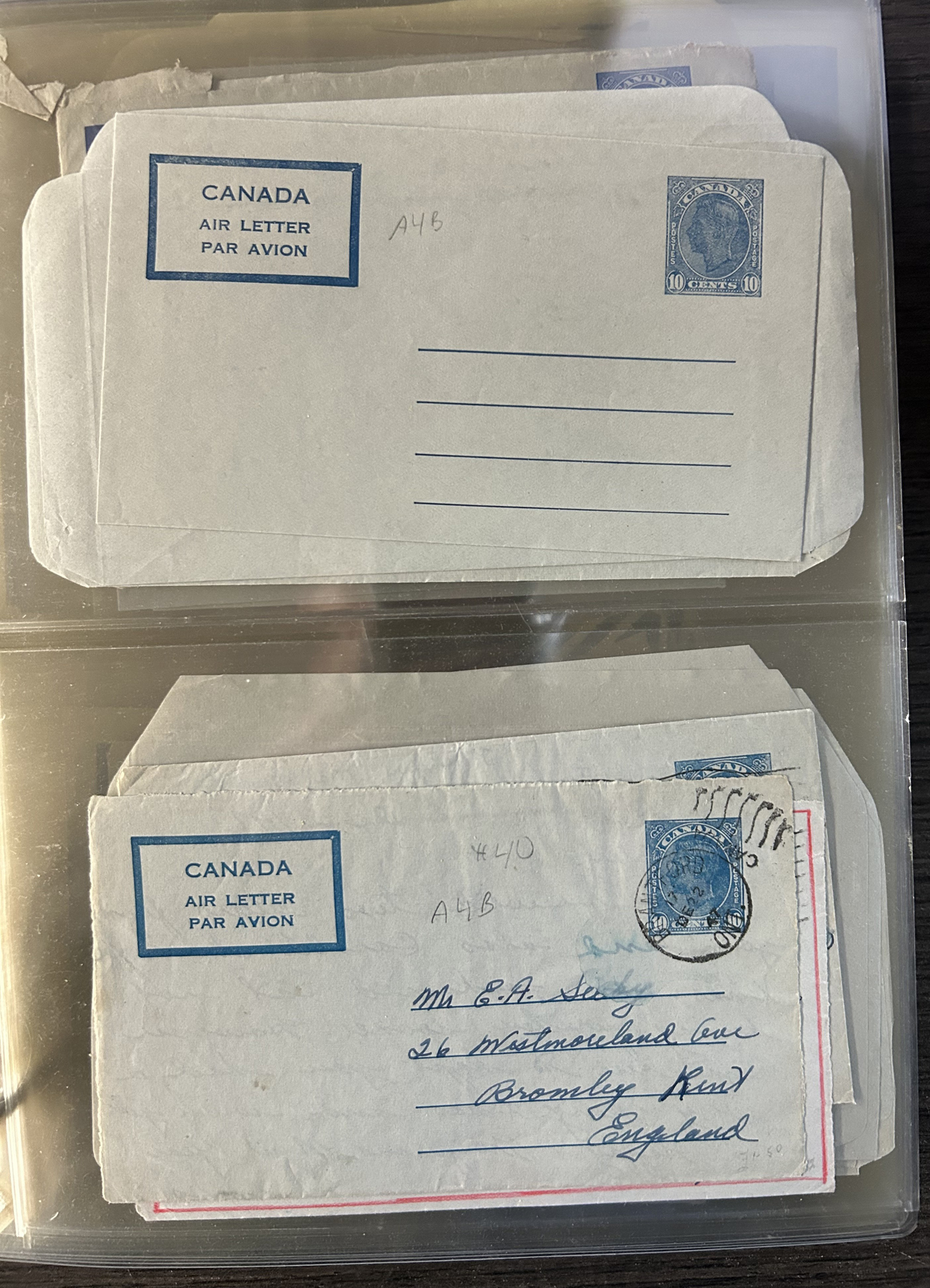 473   imageAssortment of 7 Better Aerogrammes, including 10c KGVI “square die” A1, A3 used (“Her”), A4 “inverted die cut”, A9 used to France with French postage due stamps. Proofs A5-P9 with no stamp and a blue mottled backing, and A13-P2 the 15c Landscape as issued, but with no die cut. Formerly Webb listed Christmas 1944 air letter with 3 address lines rounds out the lot. (Scan 1) (Scan 2) (Scan 3) (Scan 4) (All Scans) (All Images)