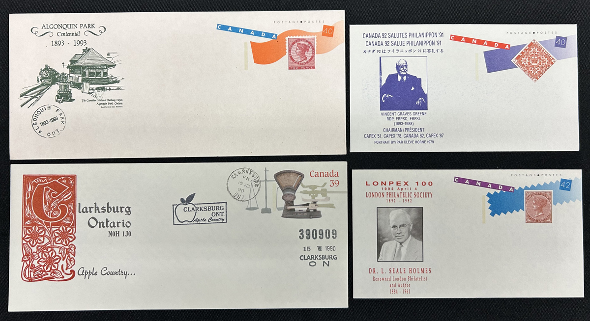 462 CVR   imageSpecial Event & Conestoga Press Commemorative Envelopes, a small group of ca. 1990s envelopes with private printings to promote stamp shows (some Webb listed) or local (Ontario) post offices. Includes both scarce “PhilaNippon ‘91” EN287C, EN297A, cat $75 each. The better portion is the good mix of over 100, mostly different, mint and used examples of the Conestoga Press private cachets. Nice condition, overlooked modern beauties. Our photos show and overview plus a small sampling. (Scan 1) (Scan 2) (Scan 3) (All Scans) (All Images)
