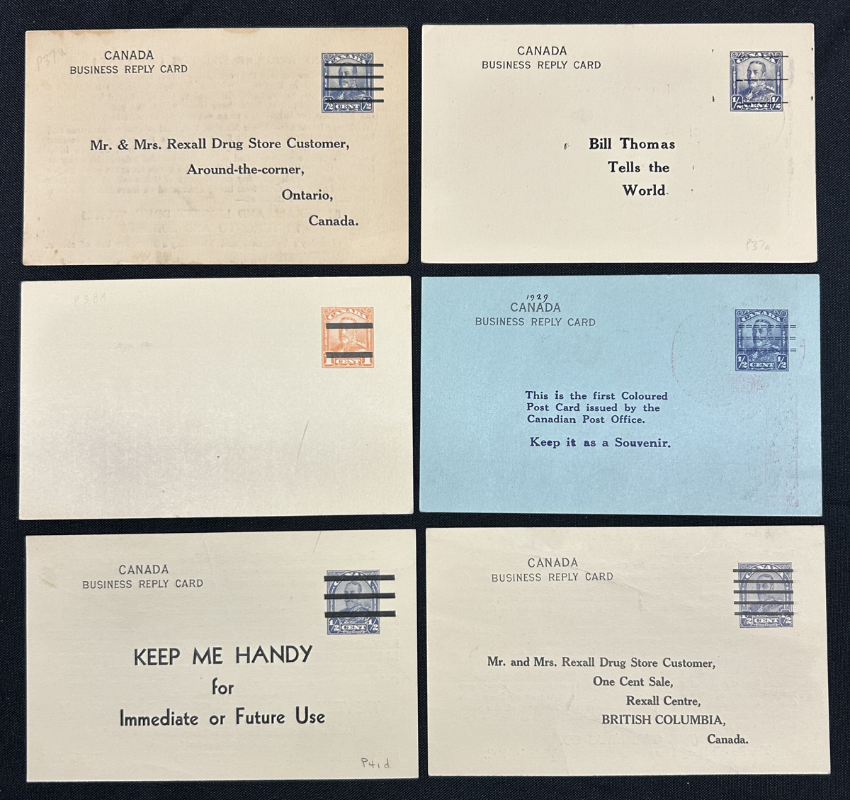 464 PC   imagePrivate Precancels on King George V “Scroll” and “Arch” Issue Cards, with P84a (x2), KP84d (blue card), P86b, P97a (x2), very fine. Webb catalogue value US$415. (Scan 1) (Scan 2) (All Scans) (All Images)