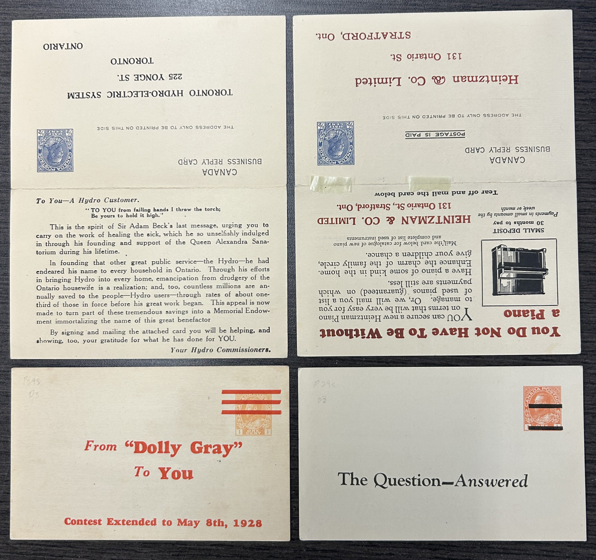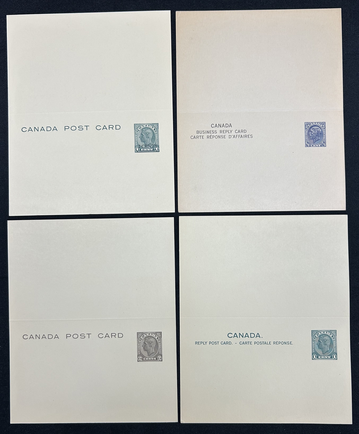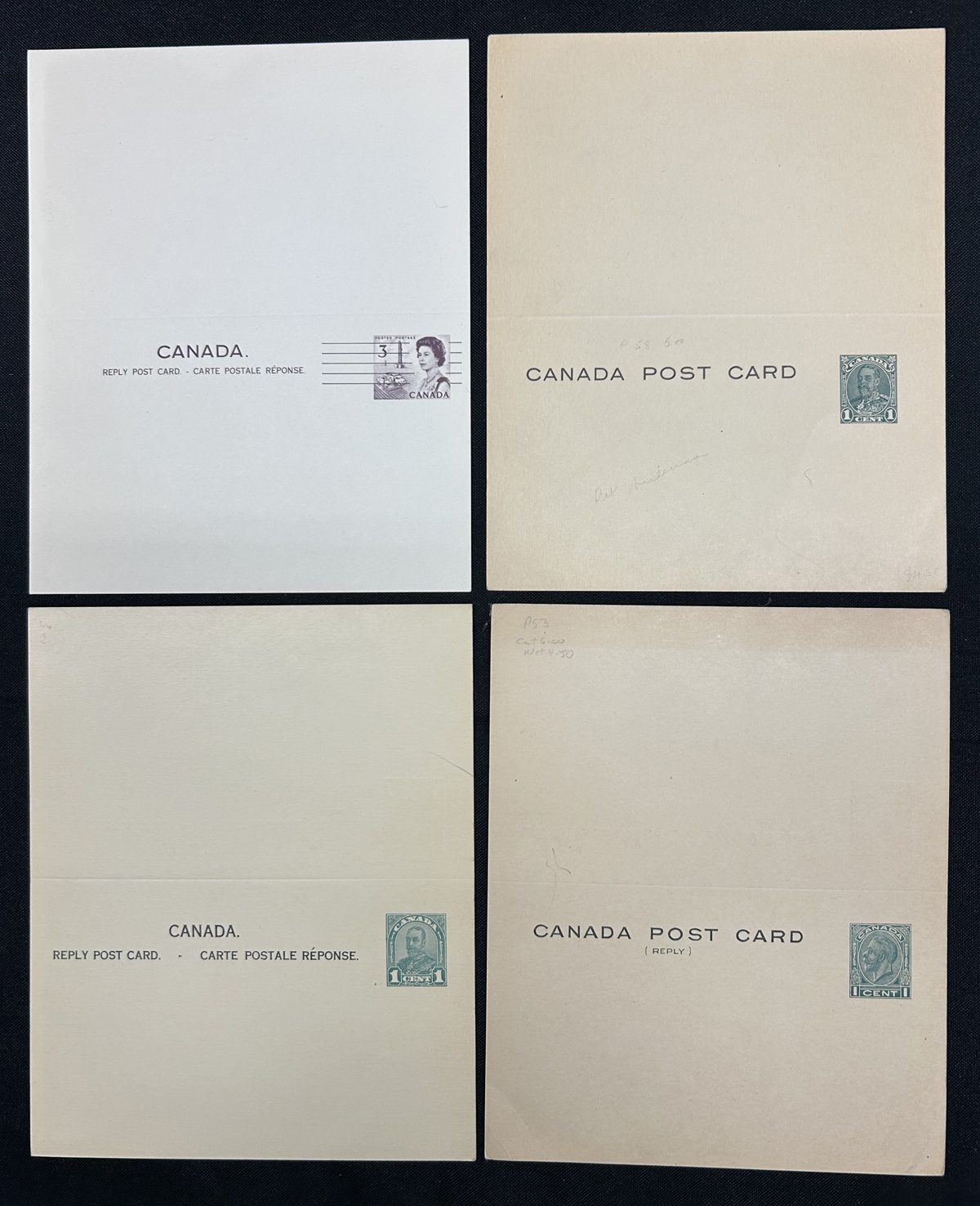465 PC   imagePrivate Precancels on four Admiral Postal Cards, including two different precancel types on reply cards (one hinge re-attached). P46b, P47a, P55a. Always eye catching. Webb catalogue value is U$400. (Scan 1) (Scan 2) (All Scans) (All Images)