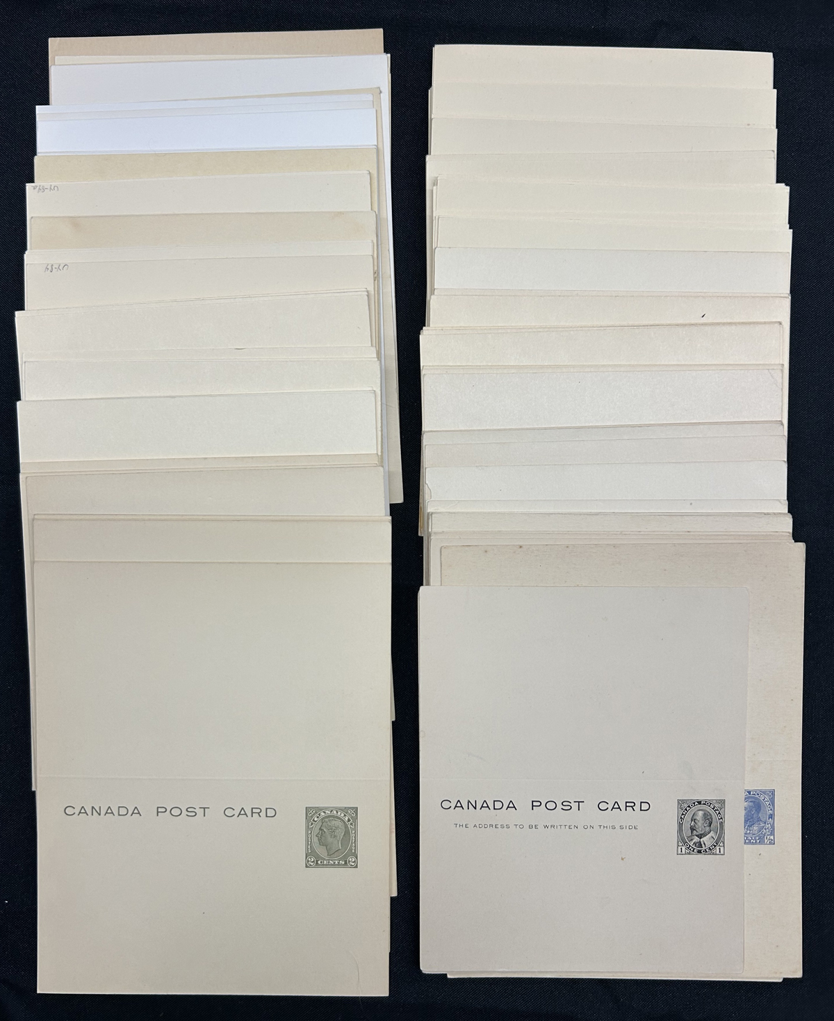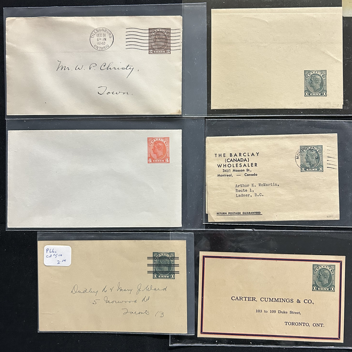 470 CVR/PC   imageGroup of 35 King George VI Stationery Covers and Cards, with a good variety of material, with only a handful of mint and the rest used. We note wrappers, cards, covers, election cards, CNR freight advice cards, etc. with the 1c through the 4c denominations. Unchecked by us for better items, but our pictures should give a good idea. A few have small faults, else overall very fine. (Scan 1) (Scan 2) (All Scans) (All Images)