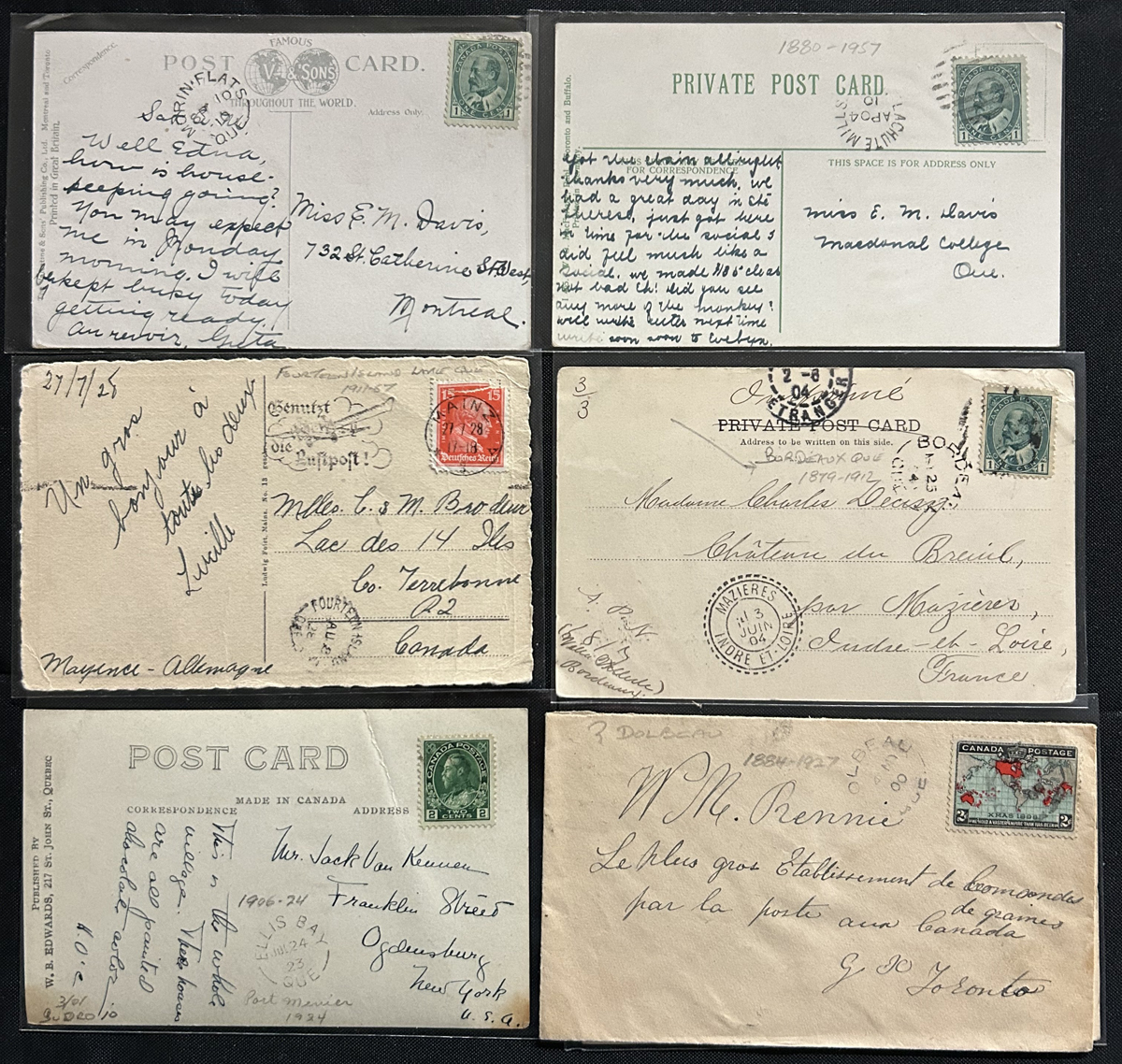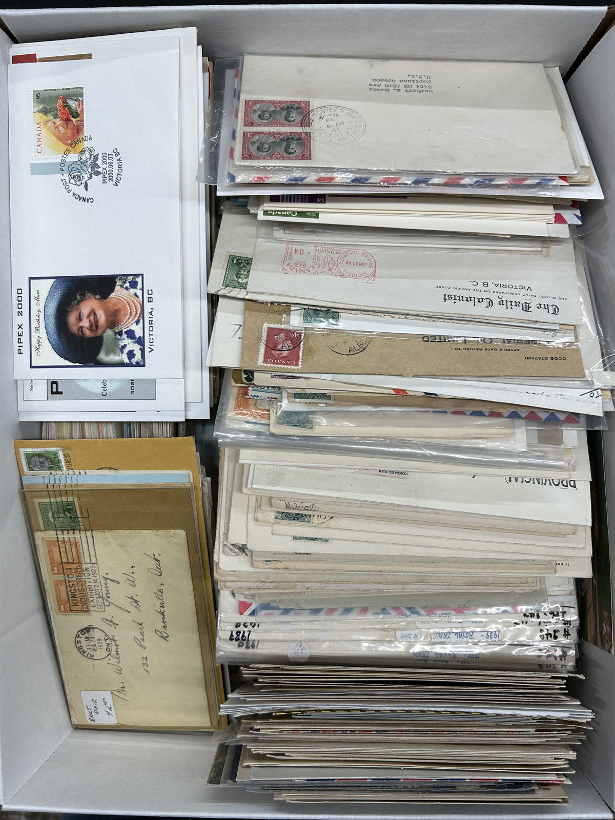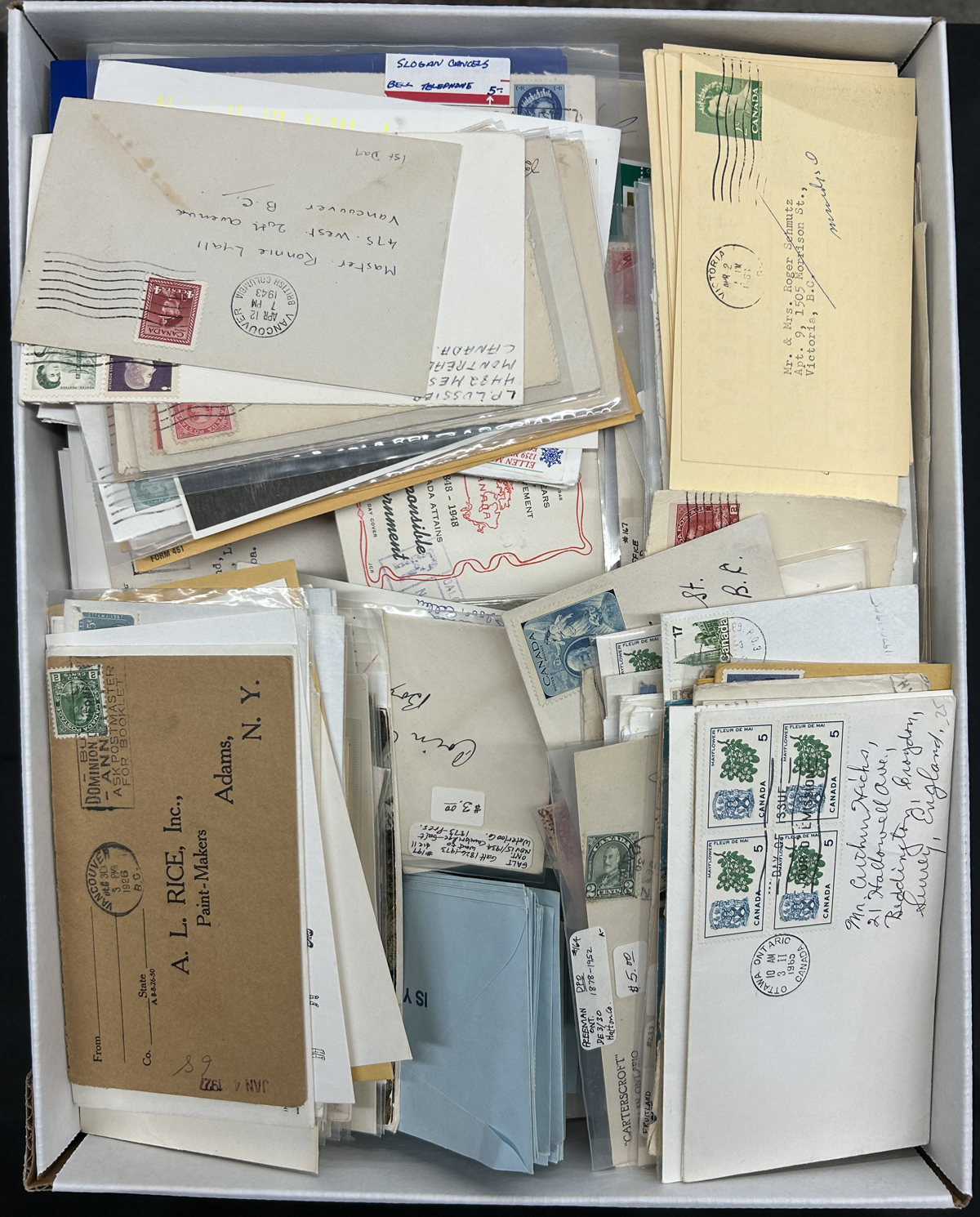502 CVR/PC   imageBox of About 435 Covers and Cards, 1900s to 1990s, about half and half postcards and covers, with a good variety of material, noting picture postcards, several patriotic postcards, postmarks of all sorts from mostly Ontario, Québec and the Maritimes. The odd fault, else overall fine or better. See some nice examples in our photos. (Scan 1) (Scan 2) (Scan 3) (Scan 4) (Scan 5) (Scan 6) (All Scans) (All Images)