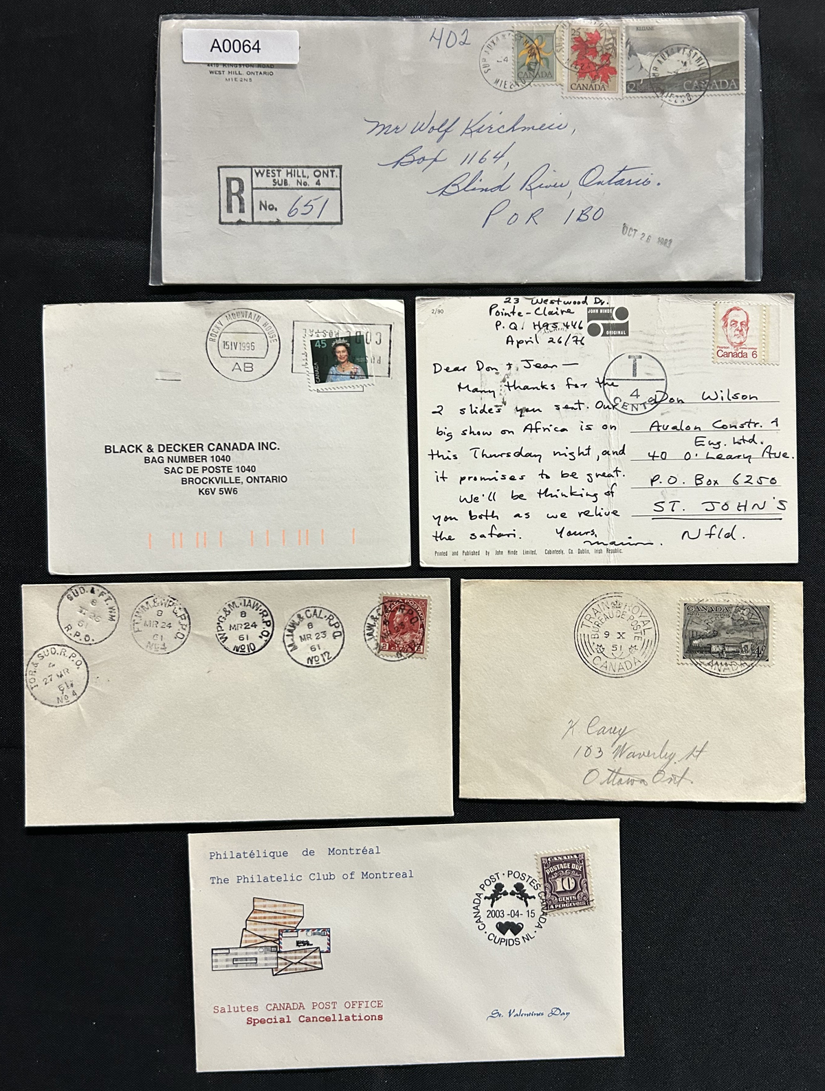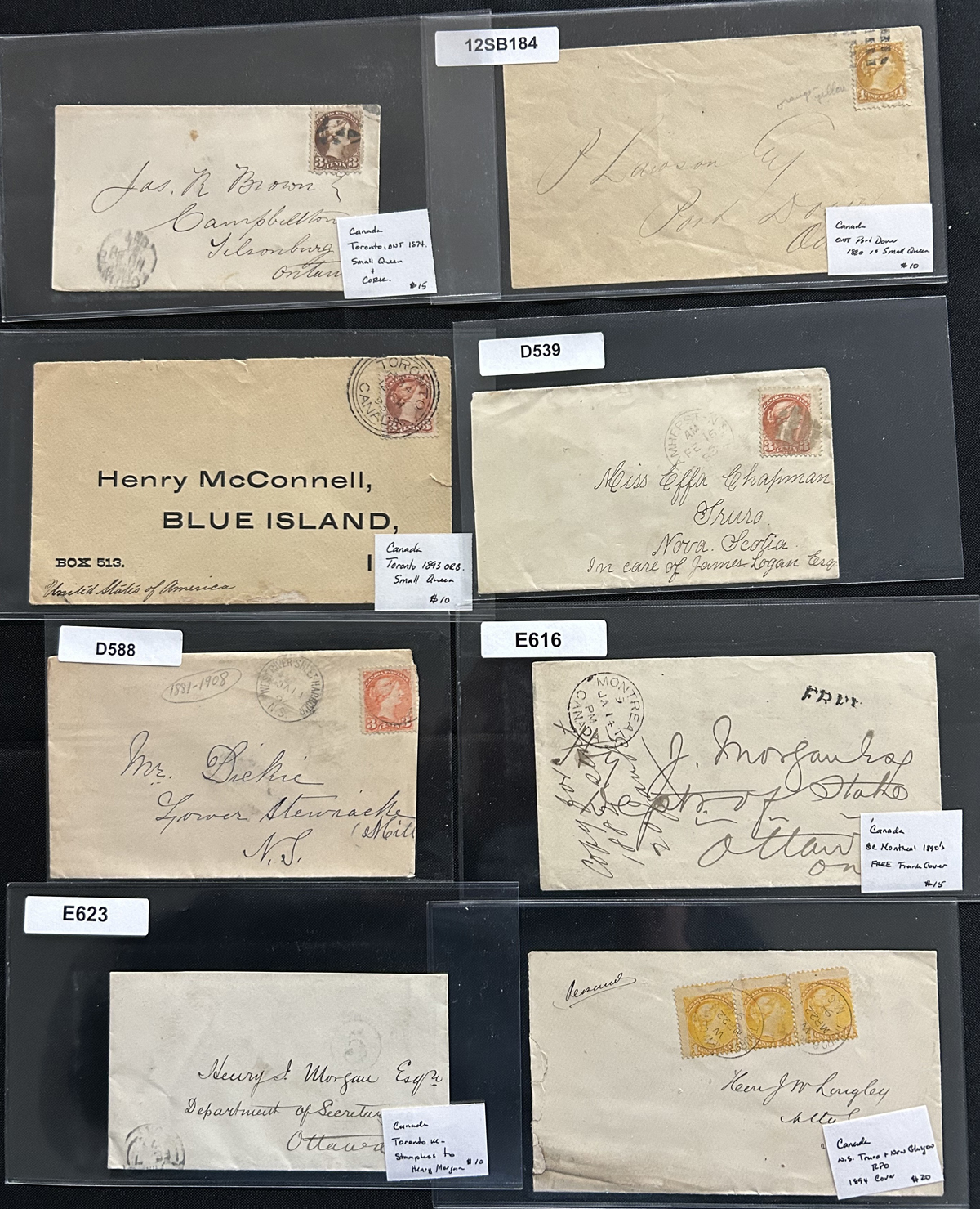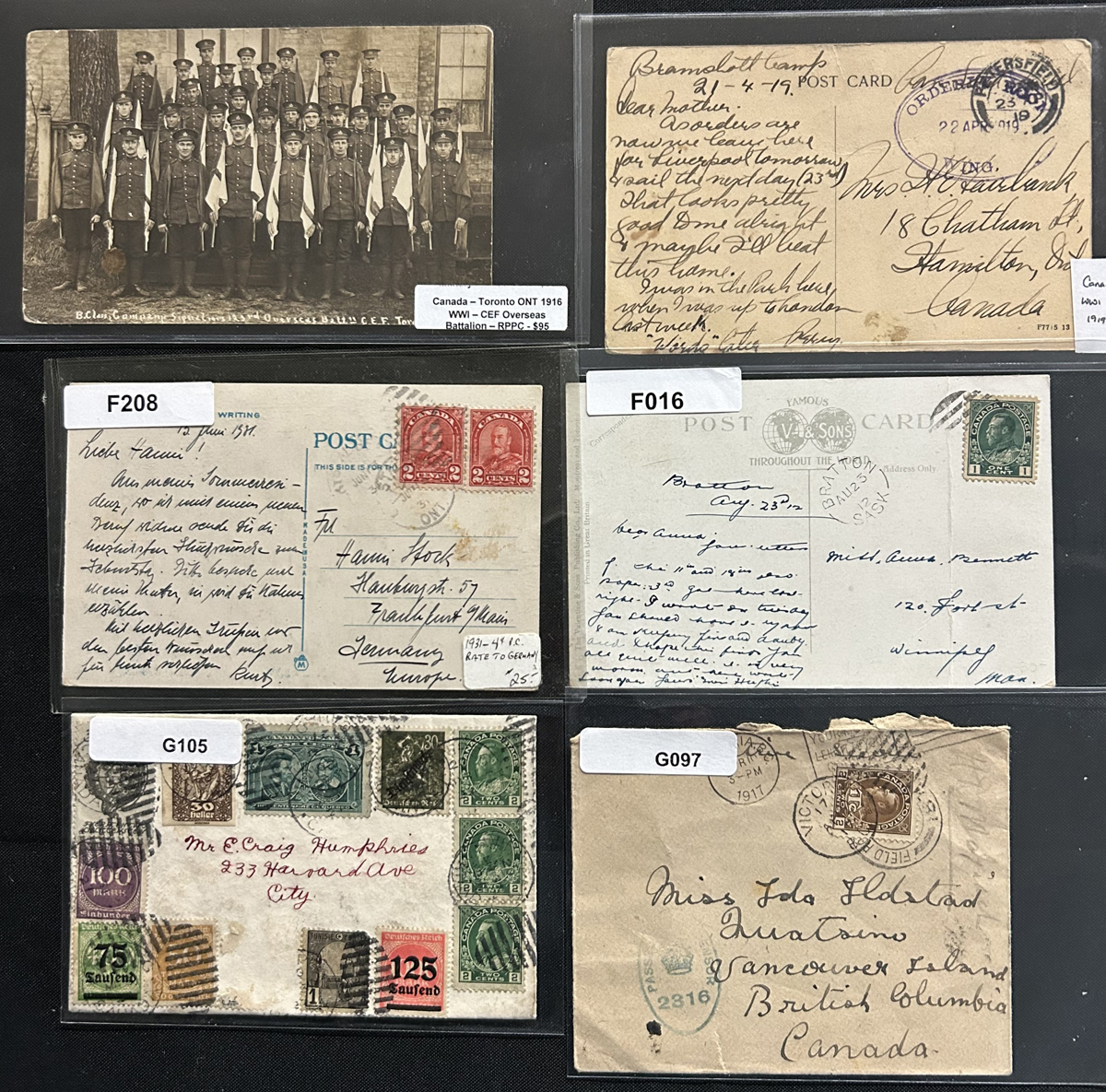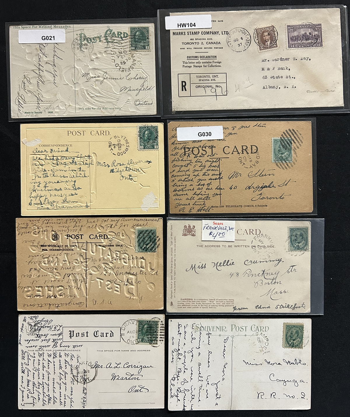 502 CVR/PC   imageBox of About 435 Covers and Cards, 1900s to 1990s, about half and half postcards and covers, with a good variety of material, noting picture postcards, several patriotic postcards, postmarks of all sorts from mostly Ontario, Québec and the Maritimes. The odd fault, else overall fine or better. See some nice examples in our photos. (Scan 1) (Scan 2) (Scan 3) (Scan 4) (Scan 5) (Scan 6) (All Scans) (All Images)