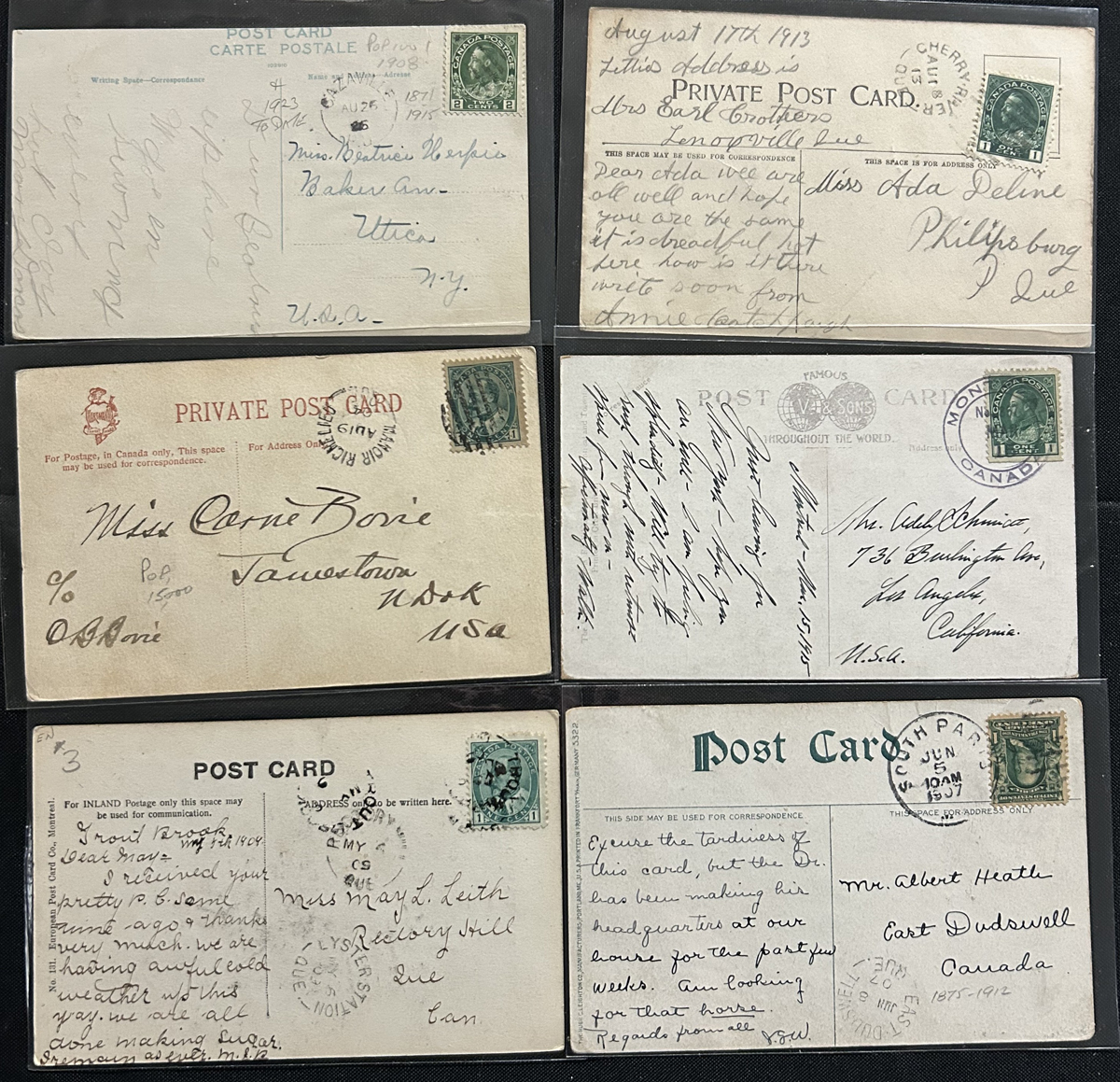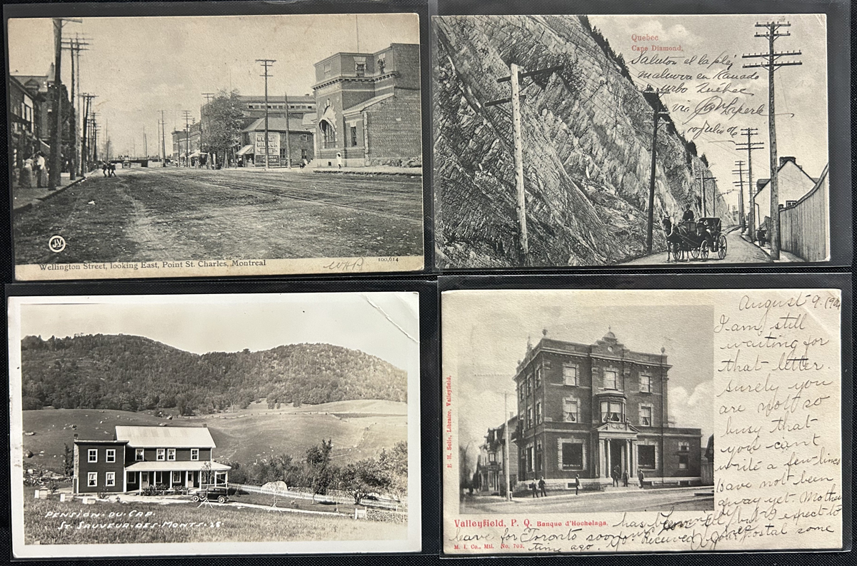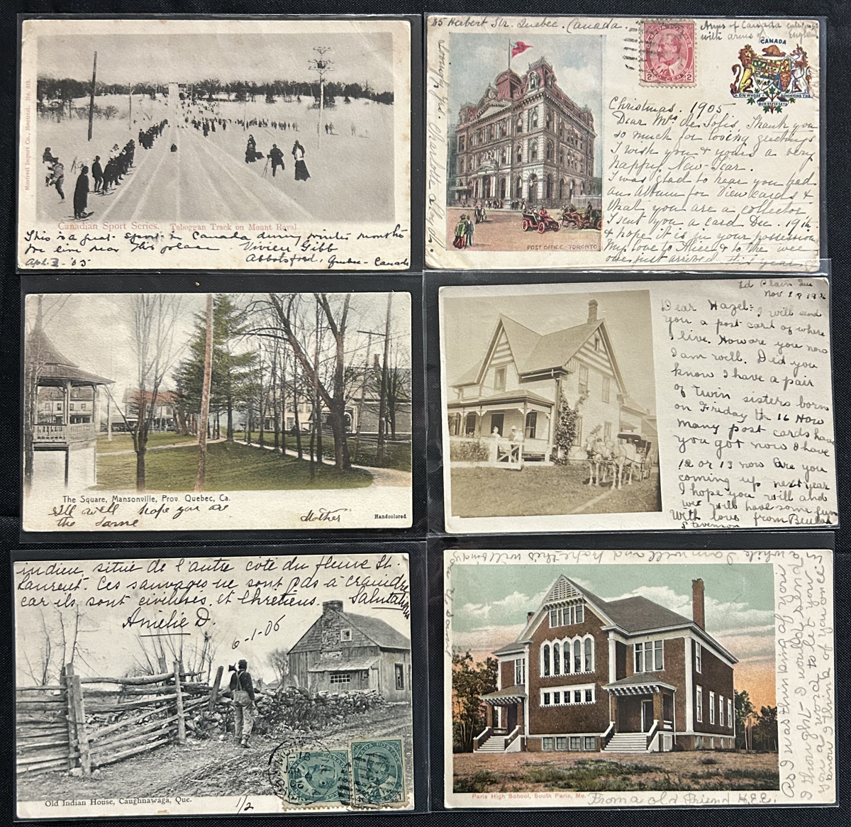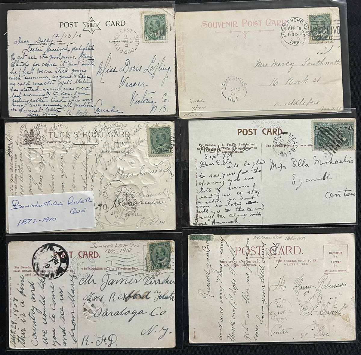 516 PC   imageOld Dealer Stock of Early Picture Postcards with Better Province of Québec Broken Circle Postmarks, a white postcard box with about 600 mostly sleeved cards, the great majority from 1902 to 1920s (plus a few after that). The great majority of these cards have been put aside long ago for having small town PQ broken circle cancels. The cards are either addressed to, or come from these towns, a large quantity of which are long ago closed. In fact, the dealer carefully wrote the town name and Post Office opening and closing dates (in pencil) on most of the cards, which makes it easy to see that a good quantity of these were only open 5-15 years. There are way too many to list or photograph, but our photos will show a sampling. The picture sides often have useful features such as early town views (not all cards are from PQ), etc, and we show a few sample photos of this. Quality of the cards is average, with the odd fault here and there. Should easily be worth our low estimate of 80c per card. (Scan 1) (Scan 2) (Scan 3) (Scan 4) (Scan 5) (Scan 6) (All Scans) (All Images)