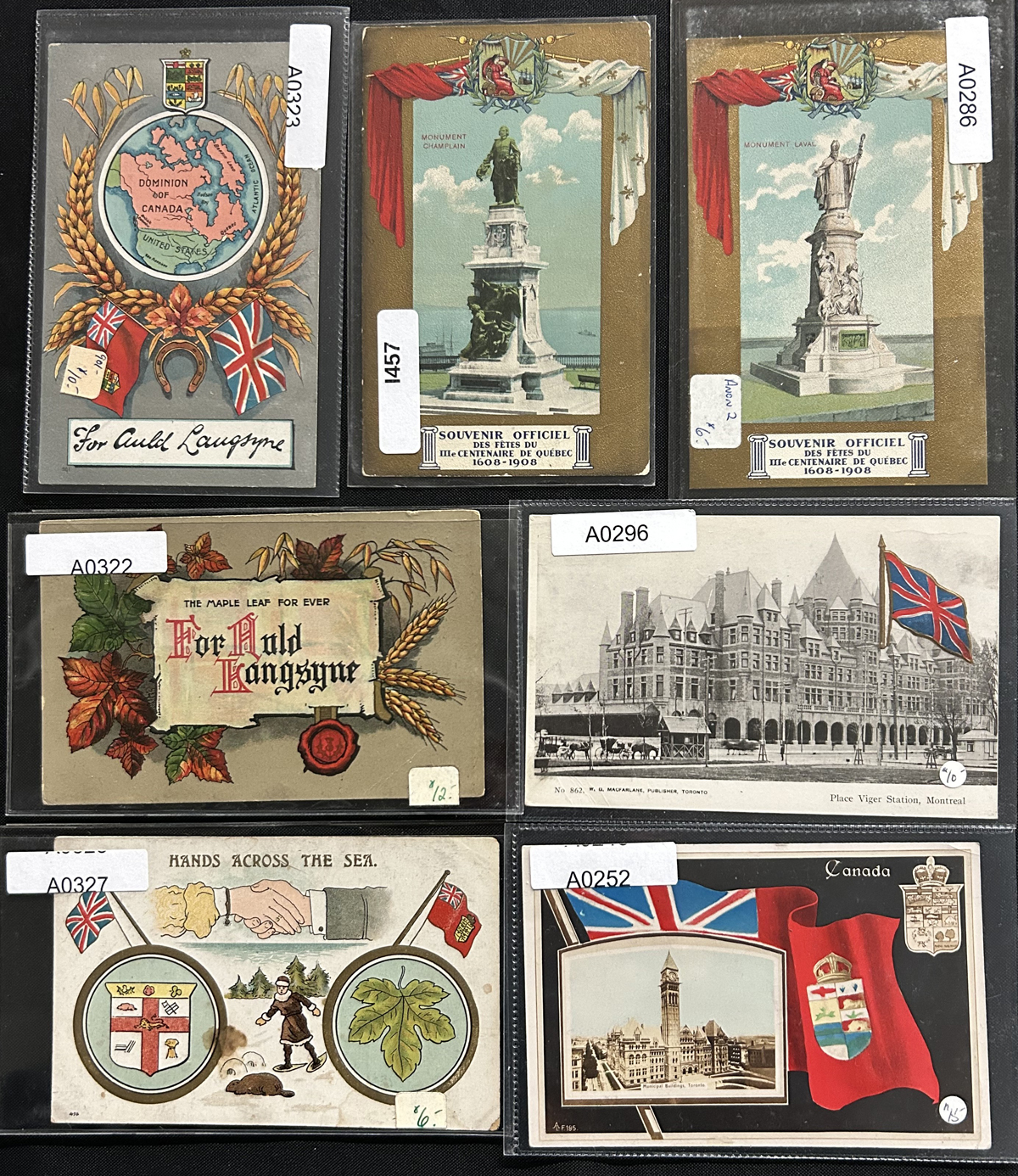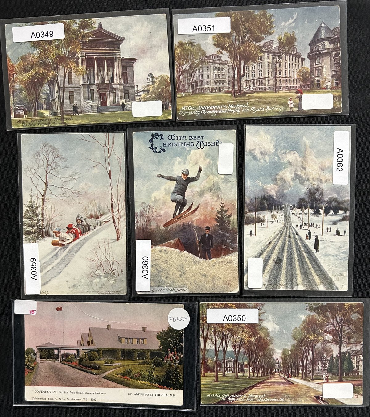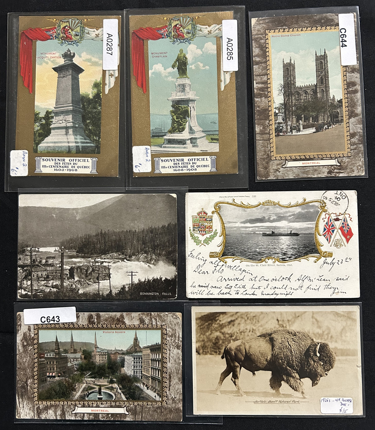 516 PC   imageOld Dealer Stock of Early Picture Postcards with Better Province of Québec Broken Circle Postmarks, a white postcard box with about 600 mostly sleeved cards, the great majority from 1902 to 1920s (plus a few after that). The great majority of these cards have been put aside long ago for having small town PQ broken circle cancels. The cards are either addressed to, or come from these towns, a large quantity of which are long ago closed. In fact, the dealer carefully wrote the town name and Post Office opening and closing dates (in pencil) on most of the cards, which makes it easy to see that a good quantity of these were only open 5-15 years. There are way too many to list or photograph, but our photos will show a sampling. The picture sides often have useful features such as early town views (not all cards are from PQ), etc, and we show a few sample photos of this. Quality of the cards is average, with the odd fault here and there. Should easily be worth our low estimate of 80c per card. (Scan 1) (Scan 2) (Scan 3) (Scan 4) (Scan 5) (Scan 6) (All Scans) (All Images)