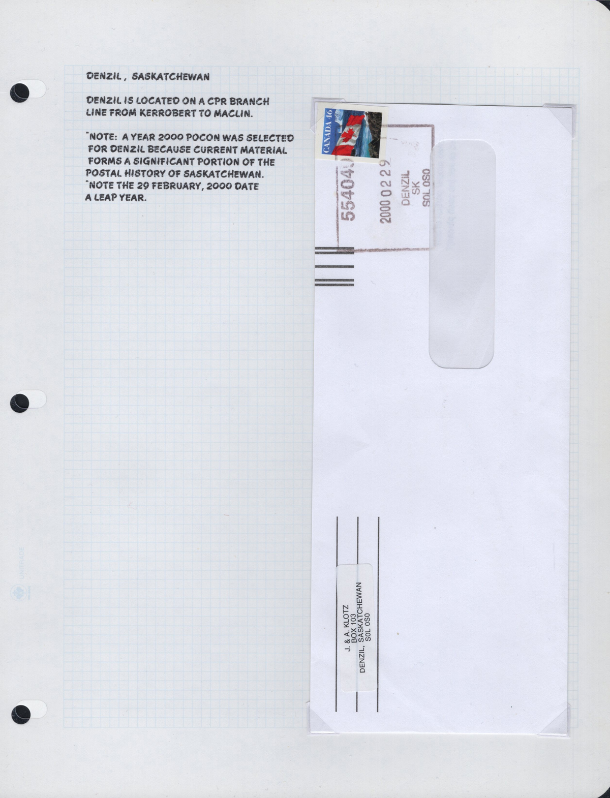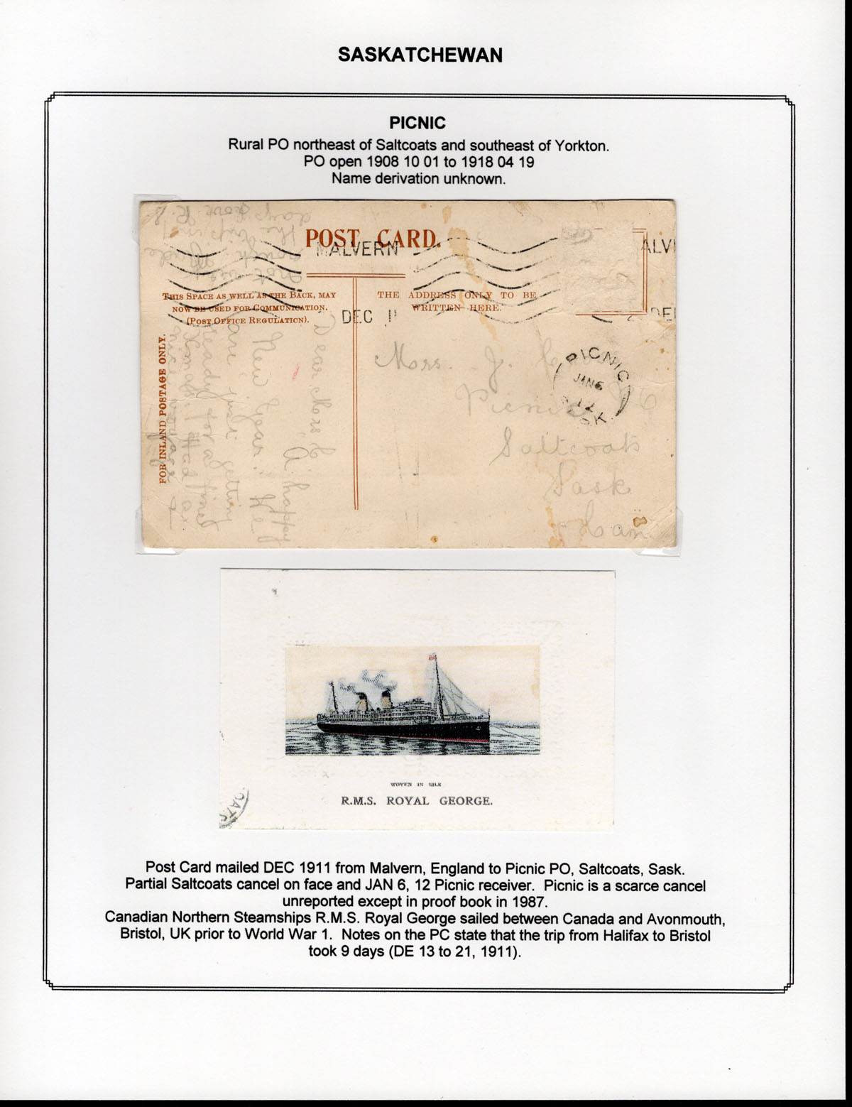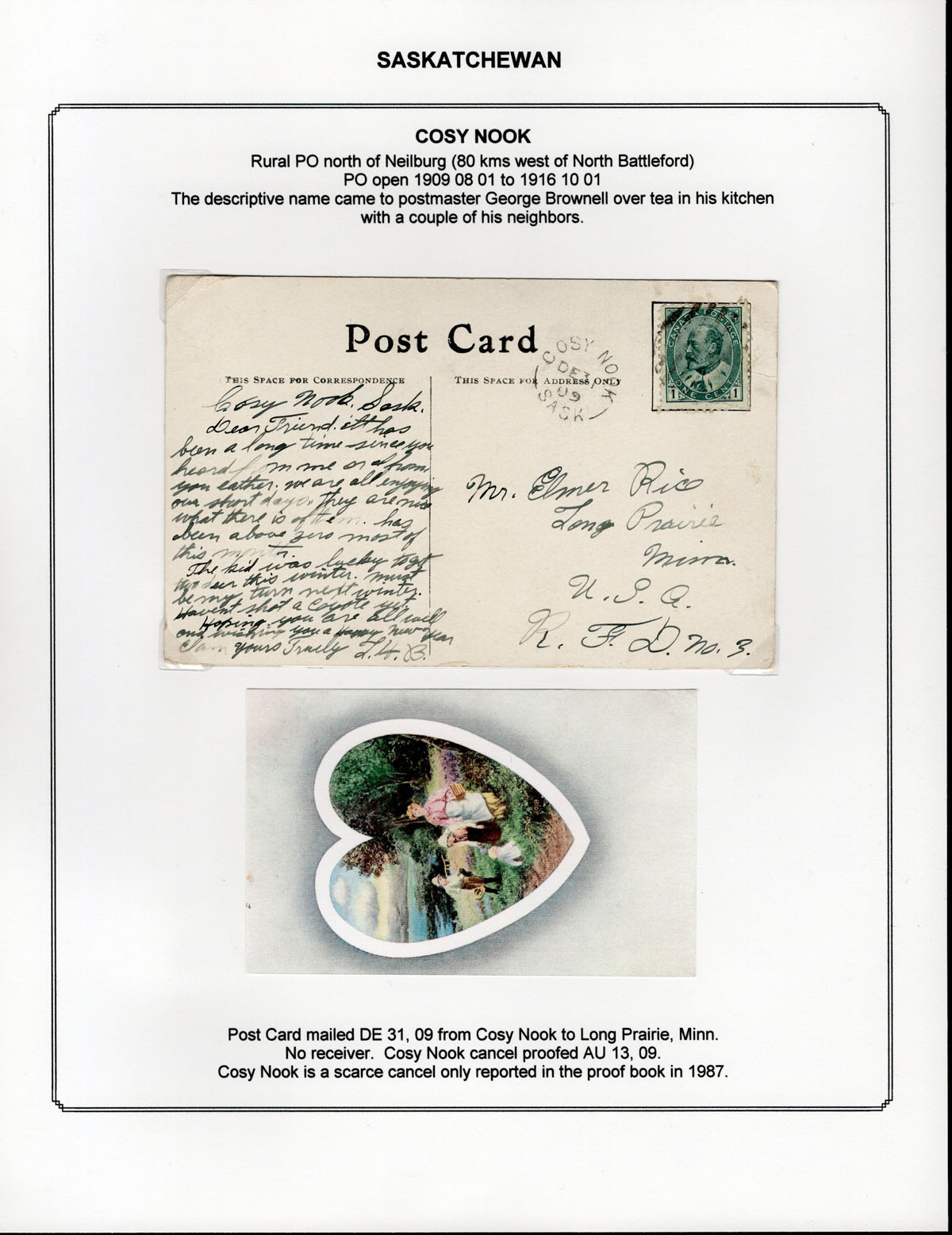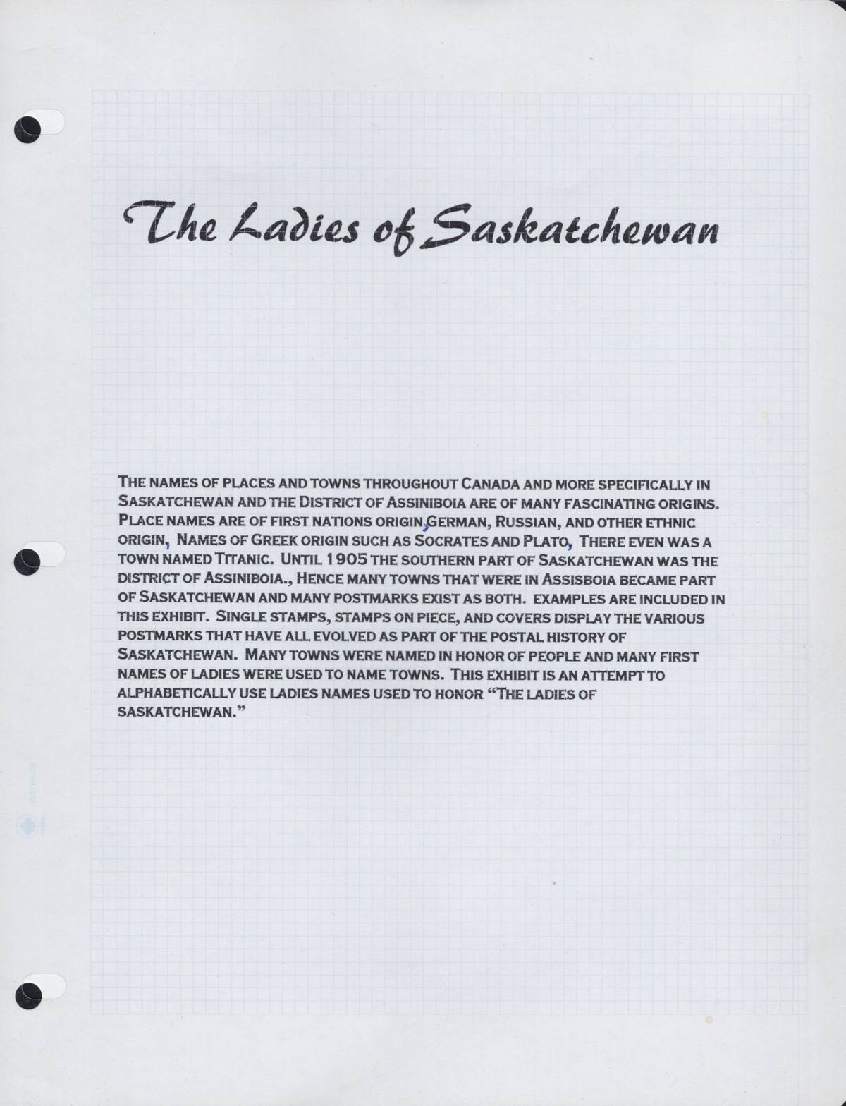517 CVR/PC   image16-Page Exhibit on Saskatchewan Town Cancels “The Ladies of Saskatchewan” last presented in Calgary in 2000, this exhibit contains 18 covers or cards plus another 28 stamps or pieces, each with a Saskatchewan or Assiniboia town postmark with names of ladies. Just a few that we noted include Alma ASSA, Audrey Sask (1901-1915), Constance Sask., Grace Sask. (1910-1926), Harrison Sask. (1907-1914), Kristines Sask. (1905-1934), Lorlie ASSA, Mily Sask., Pascal Sask. (1907-1910), Quincy Sask. (1906-1909), and many more, with many that were only open for a short number of years. All pages scanned online. (Scan 1) (Scan 2) (Scan 3) (Scan 4) (Scan 5) (Scan 6) (Scan 7) (Scan 8) (Scan 9) (Scan 10) (Scan 11) (Scan 12) (Scan 13) (Scan 14) (Scan 15) (Scan 16) (All Scans) (All Images)