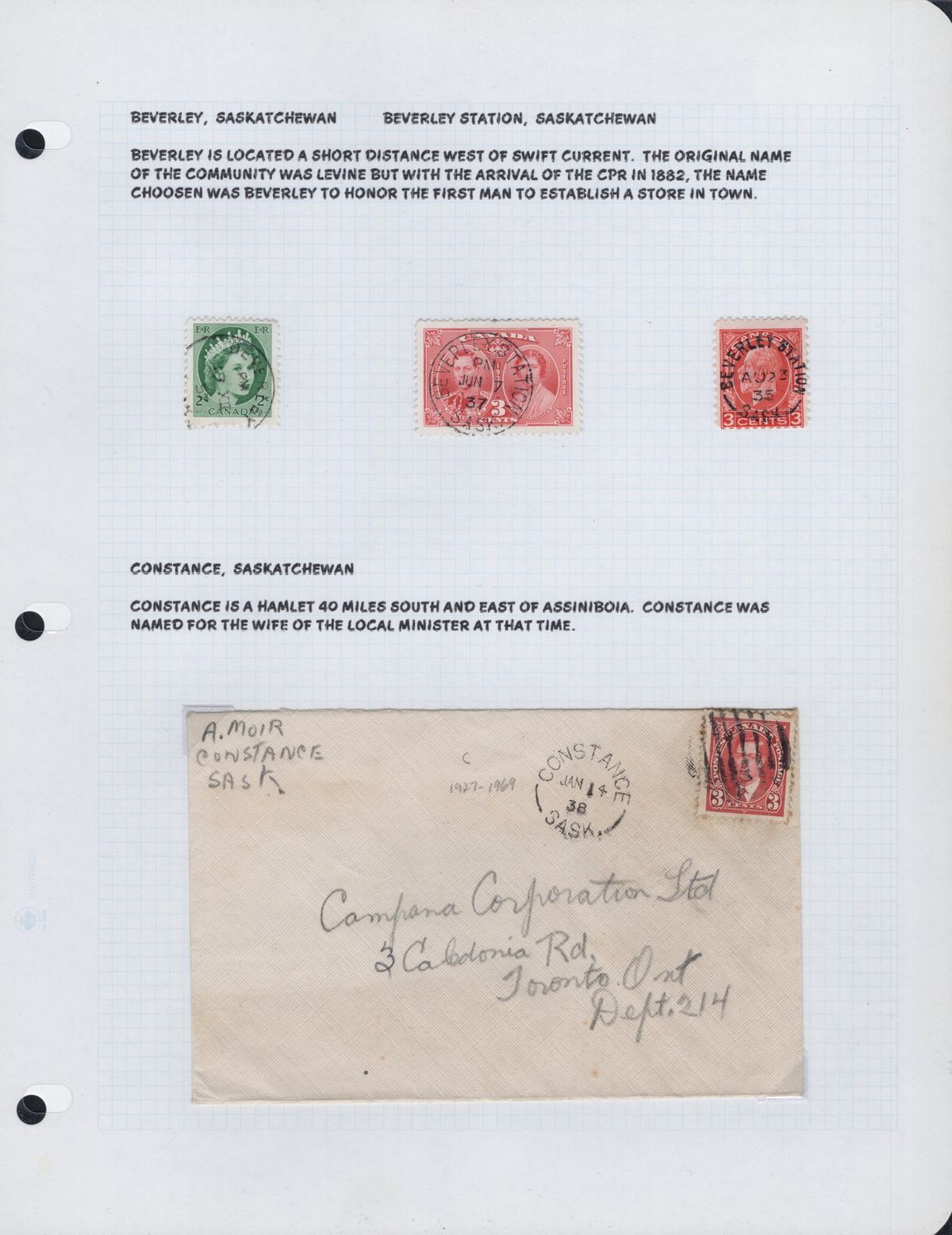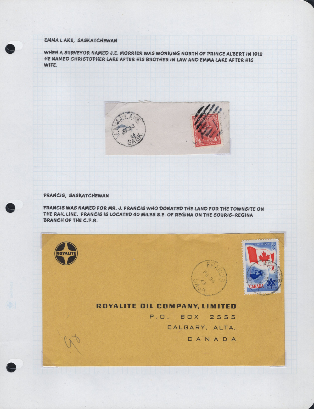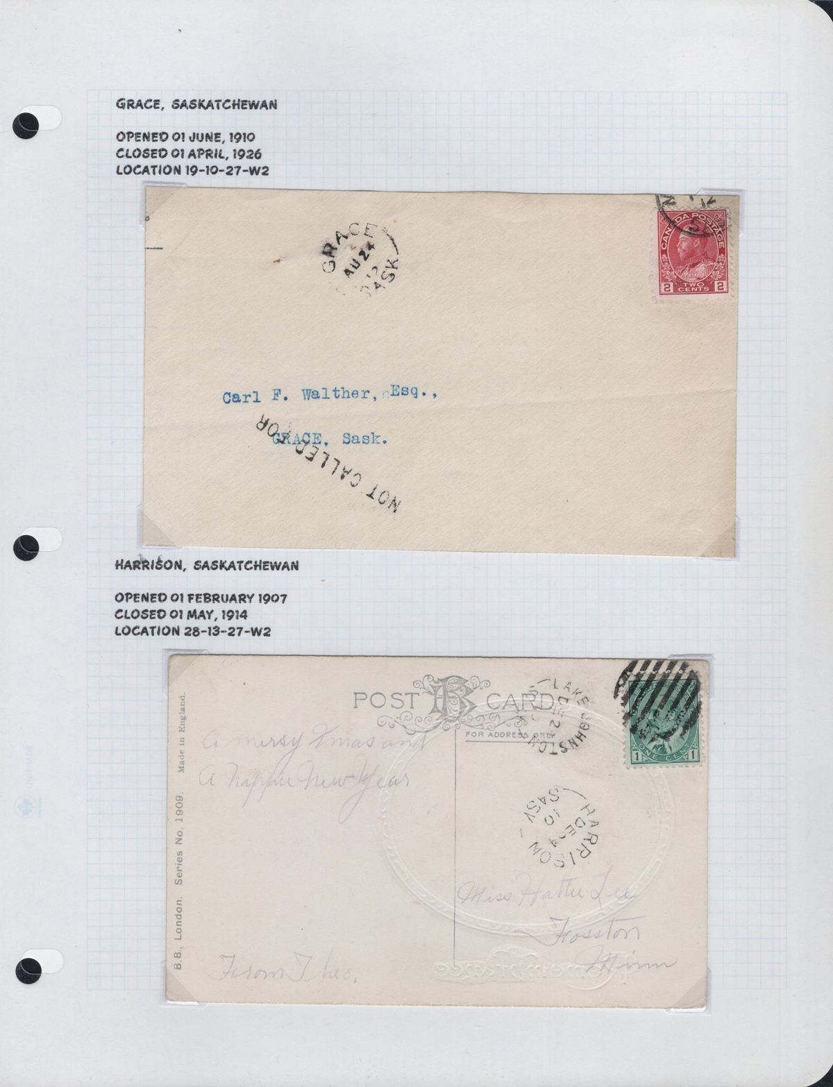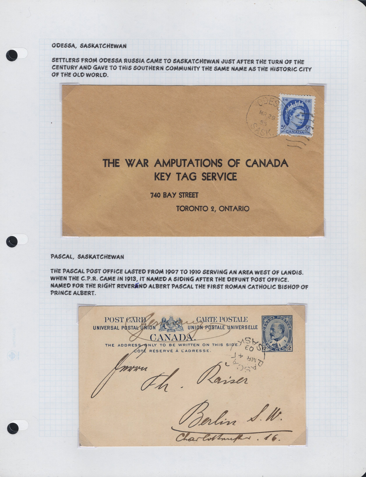 519 CVR/PC   imageExtensive Saskatchewan Town Postmark Collection, a seldom offered, lifetime collection of 1,126 covers/postcards/pieces, all with split ring postmarks, with strength in the earliest days of the Provinces (Edward and Admiral era). Arranged alphabetically on collector made pages, or stock pages and held within 16 binders (takes up about 2 bankers boxes). This is one man's collection, acquired over decades, offered intact, and which includes 179 "E" or "*" (unreported) postmarks, alongside many other closed post offices, RPPC (real photo postcards), rates, destinations etc. Included is the inventory list of towns, compiled by the collector with town name, date acquired and purchase price. This lot represents an opportunity for either the postmark collector or dealer to acquire a life-time work intact. We are offering this group intact in this sale, with a starting price of $15,000 (about $13 per cover). If this collection does not sell intact, it will be appropriately broken up in subsequent Garden City Philatelic Auction postal history sales. We have scanned many of the better items, along with the inventory list. We encourage any interested collectors to contact us with any questions. Click here for a PDF of this lot. (Scan 1) (Scan 2) (Scan 3) (Scan 4) (All Scans) (All Images)