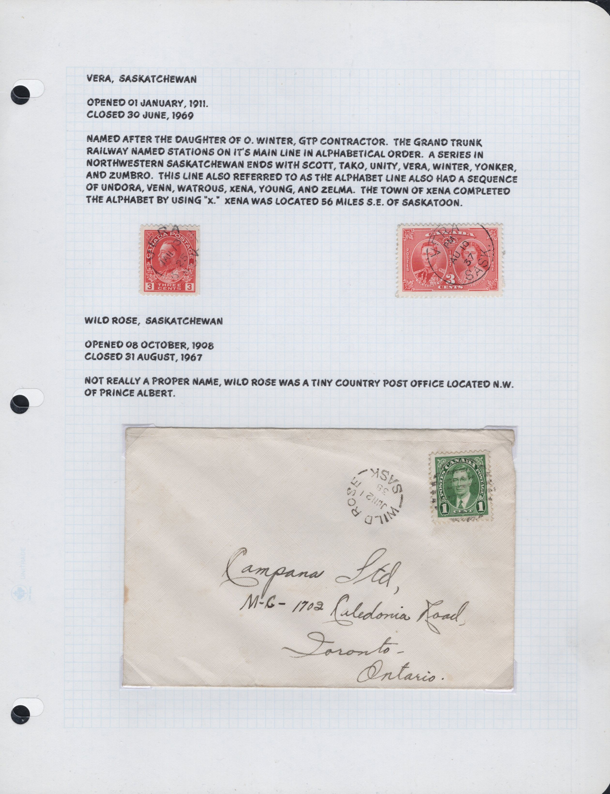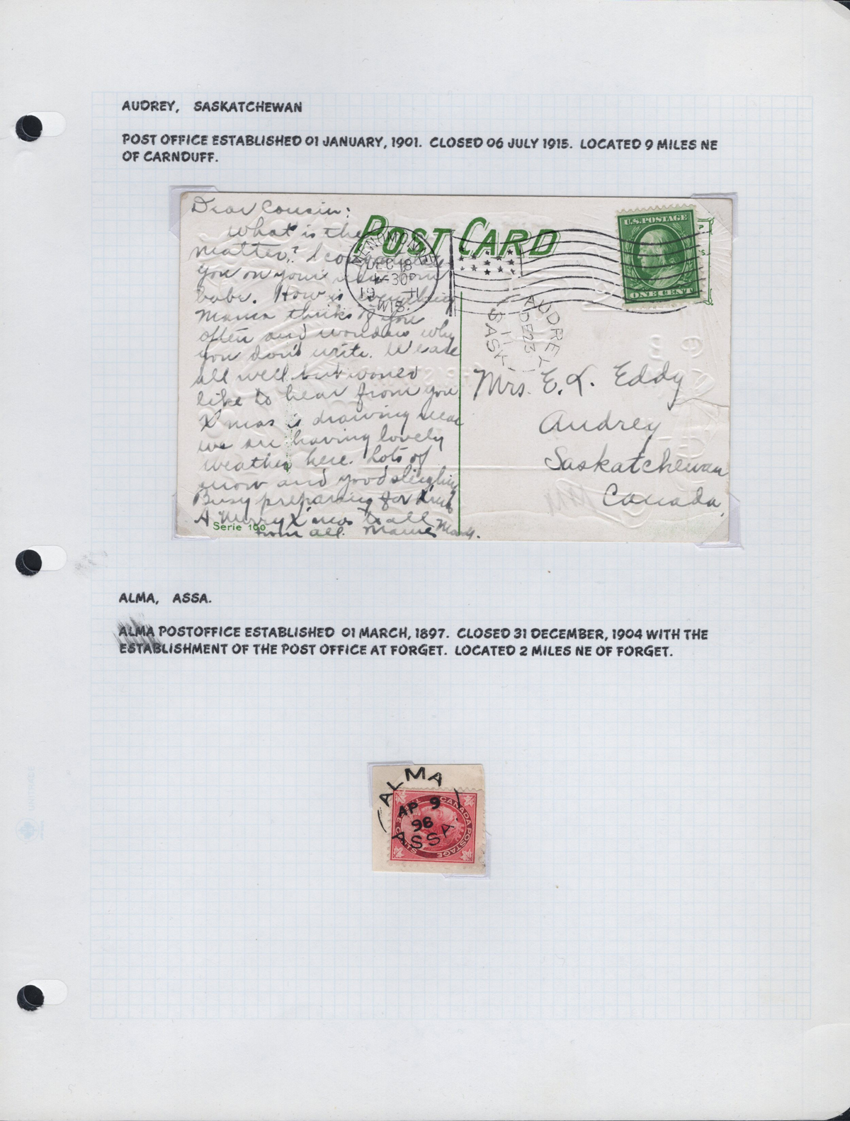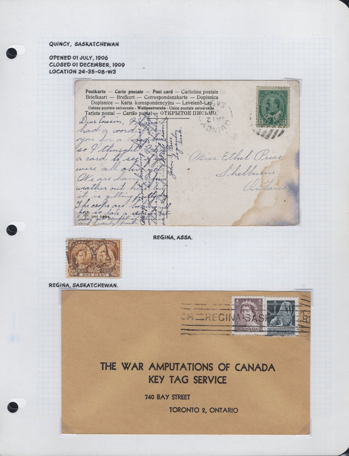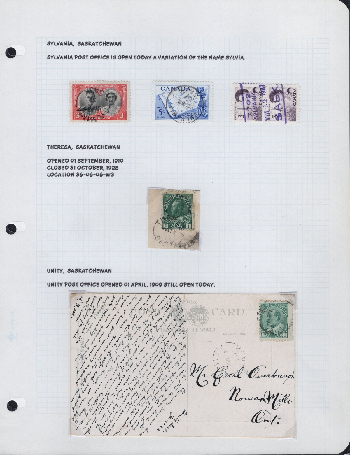 519 CVR/PC   imageExtensive Saskatchewan Town Postmark Collection, a seldom offered, lifetime collection of 1,126 covers/postcards/pieces, all with split ring postmarks, with strength in the earliest days of the Provinces (Edward and Admiral era). Arranged alphabetically on collector made pages, or stock pages and held within 16 binders (takes up about 2 bankers boxes). This is one man's collection, acquired over decades, offered intact, and which includes 179 "E" or "*" (unreported) postmarks, alongside many other closed post offices, RPPC (real photo postcards), rates, destinations etc. Included is the inventory list of towns, compiled by the collector with town name, date acquired and purchase price. This lot represents an opportunity for either the postmark collector or dealer to acquire a life-time work intact. We are offering this group intact in this sale, with a starting price of $15,000 (about $13 per cover). If this collection does not sell intact, it will be appropriately broken up in subsequent Garden City Philatelic Auction postal history sales. We have scanned many of the better items, along with the inventory list. We encourage any interested collectors to contact us with any questions. Click here for a PDF of this lot. (Scan 1) (Scan 2) (Scan 3) (Scan 4) (All Scans) (All Images)