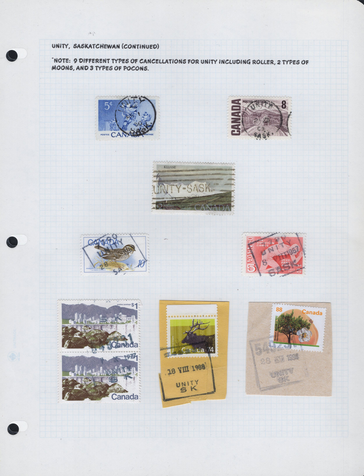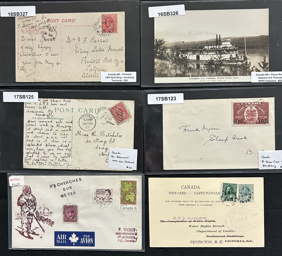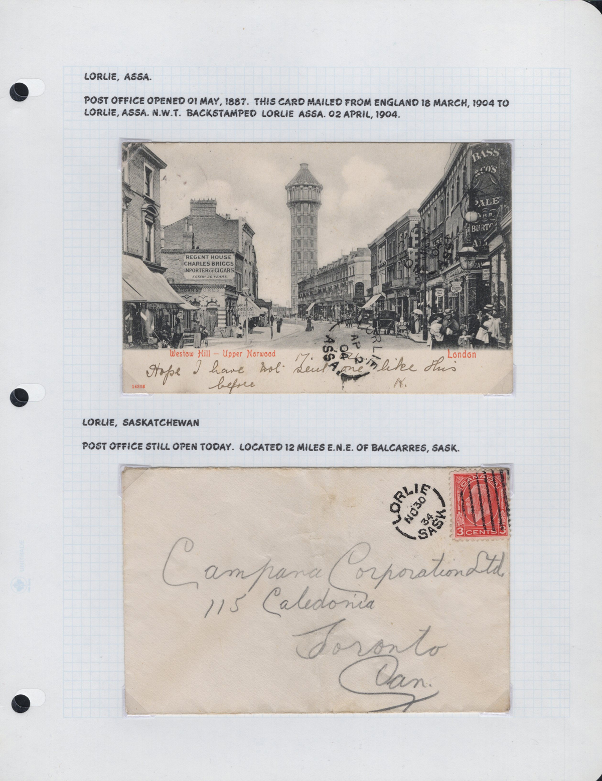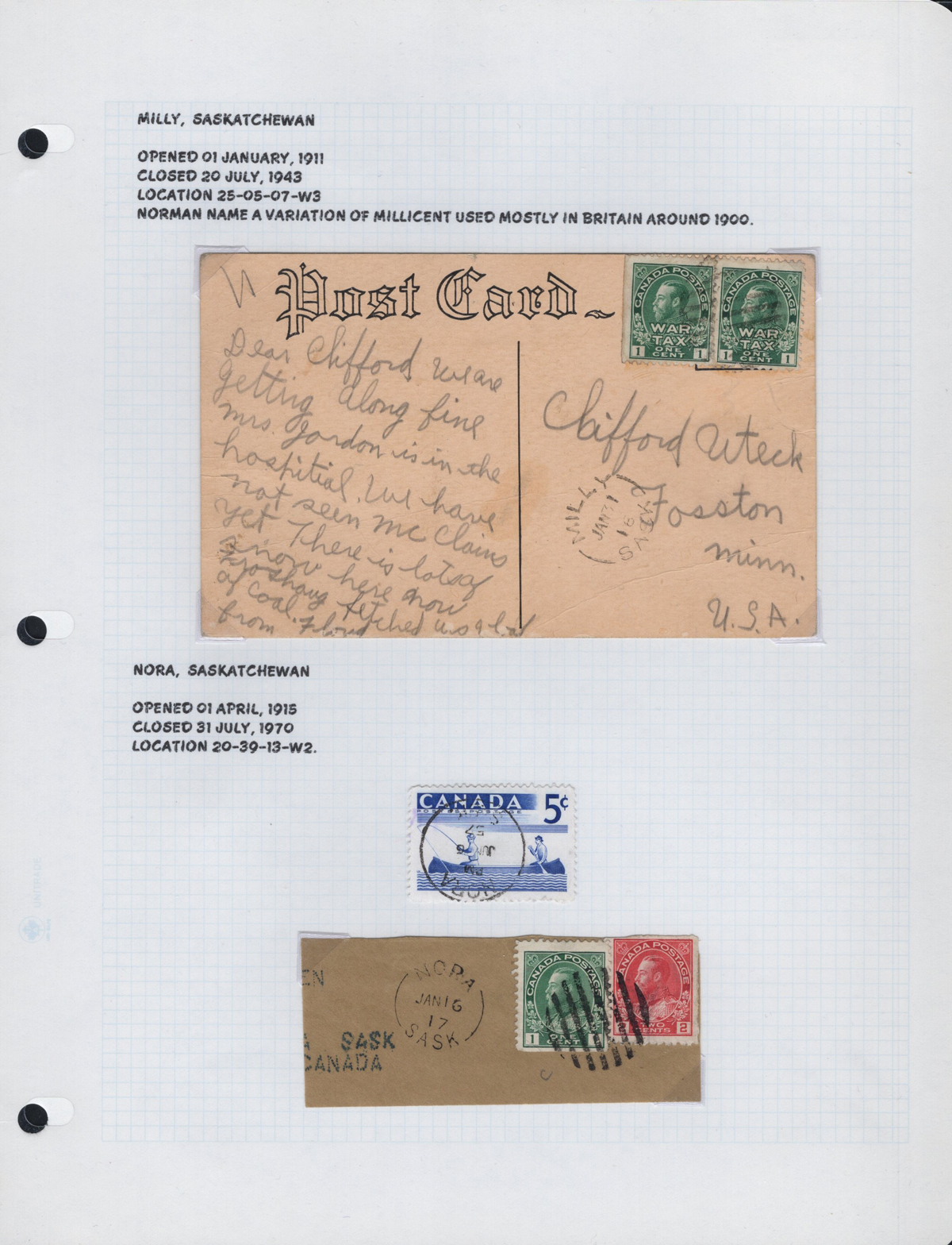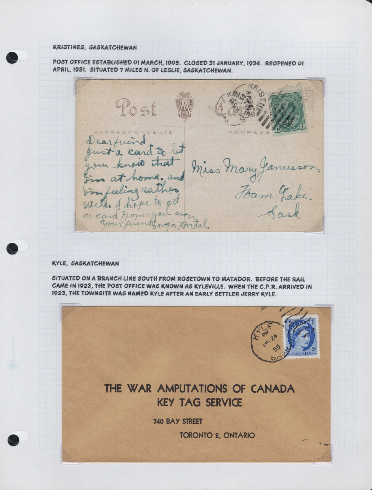 519 CVR/PC   imageExtensive Saskatchewan Town Postmark Collection, a seldom offered, lifetime collection of 1,126 covers/postcards/pieces, all with split ring postmarks, with strength in the earliest days of the Provinces (Edward and Admiral era). Arranged alphabetically on collector made pages, or stock pages and held within 16 binders (takes up about 2 bankers boxes). This is one man's collection, acquired over decades, offered intact, and which includes 179 "E" or "*" (unreported) postmarks, alongside many other closed post offices, RPPC (real photo postcards), rates, destinations etc. Included is the inventory list of towns, compiled by the collector with town name, date acquired and purchase price. This lot represents an opportunity for either the postmark collector or dealer to acquire a life-time work intact. We are offering this group intact in this sale, with a starting price of $15,000 (about $13 per cover). If this collection does not sell intact, it will be appropriately broken up in subsequent Garden City Philatelic Auction postal history sales. We have scanned many of the better items, along with the inventory list. We encourage any interested collectors to contact us with any questions. Click here for a PDF of this lot. (Scan 1) (Scan 2) (Scan 3) (Scan 4) (All Scans) (All Images)