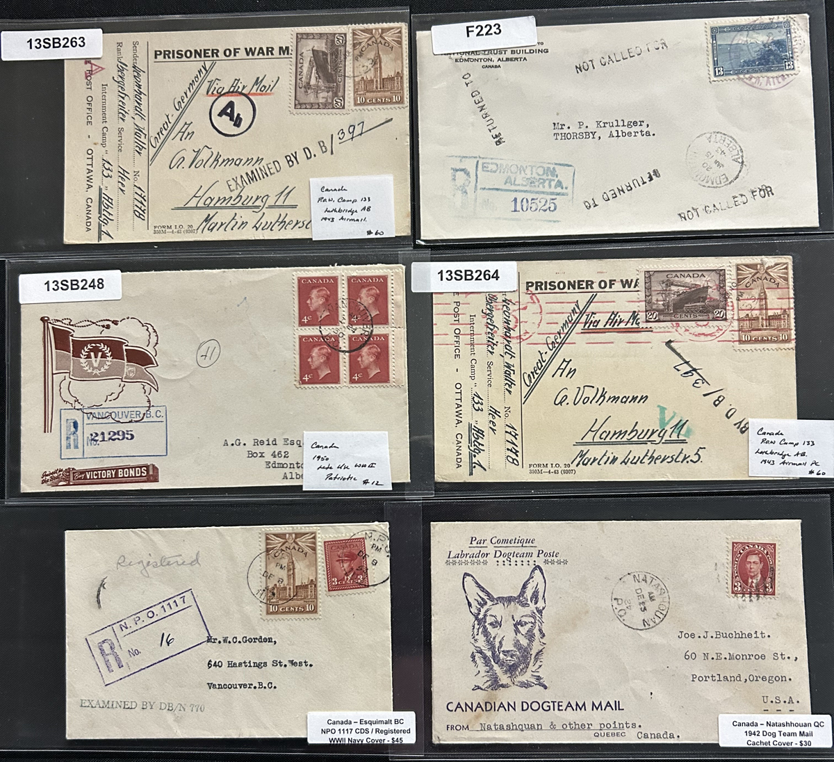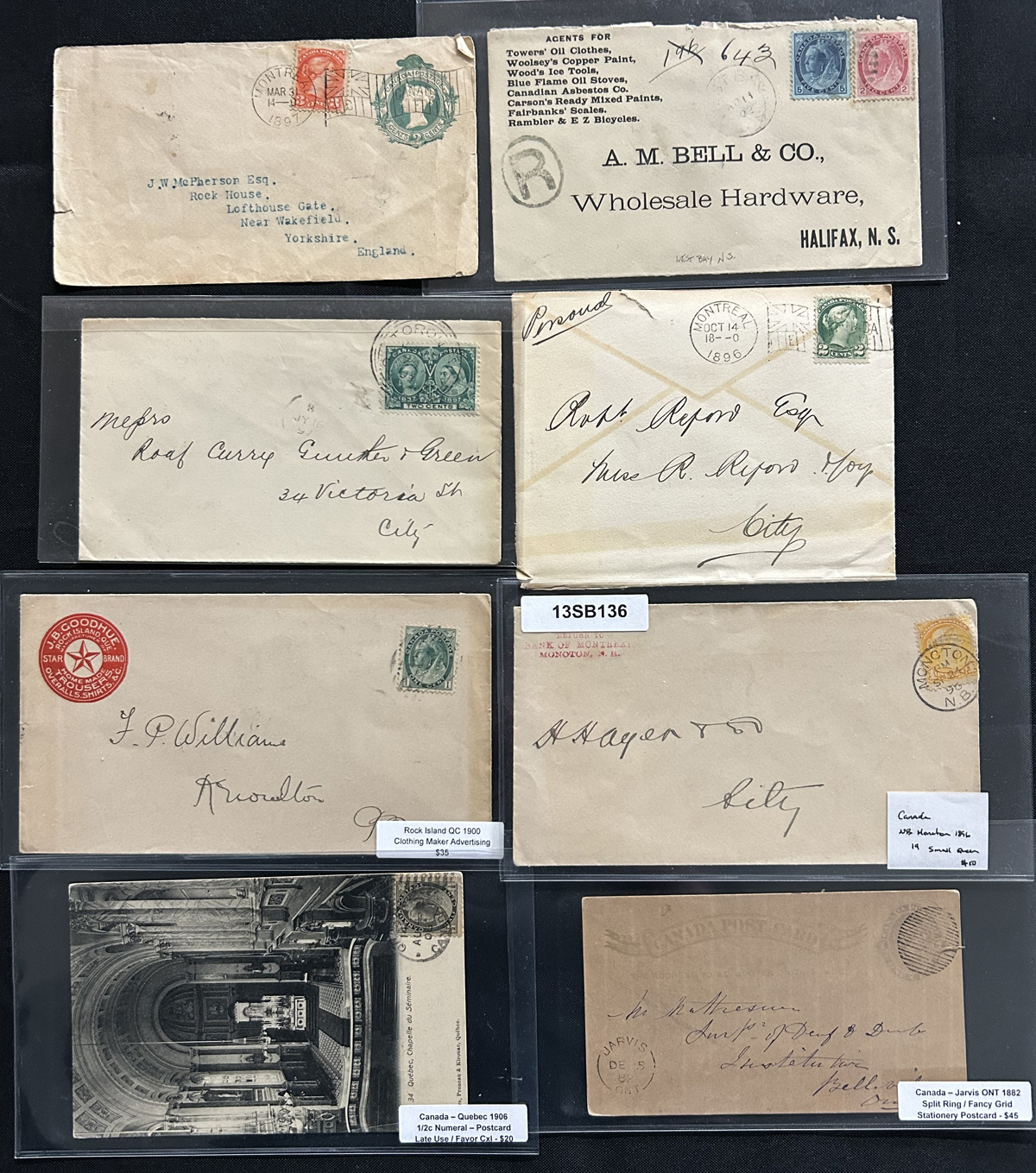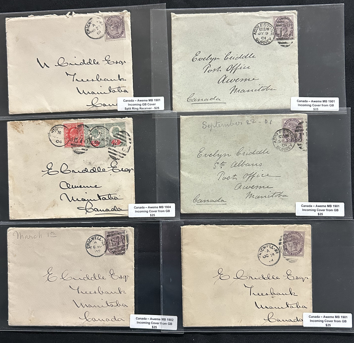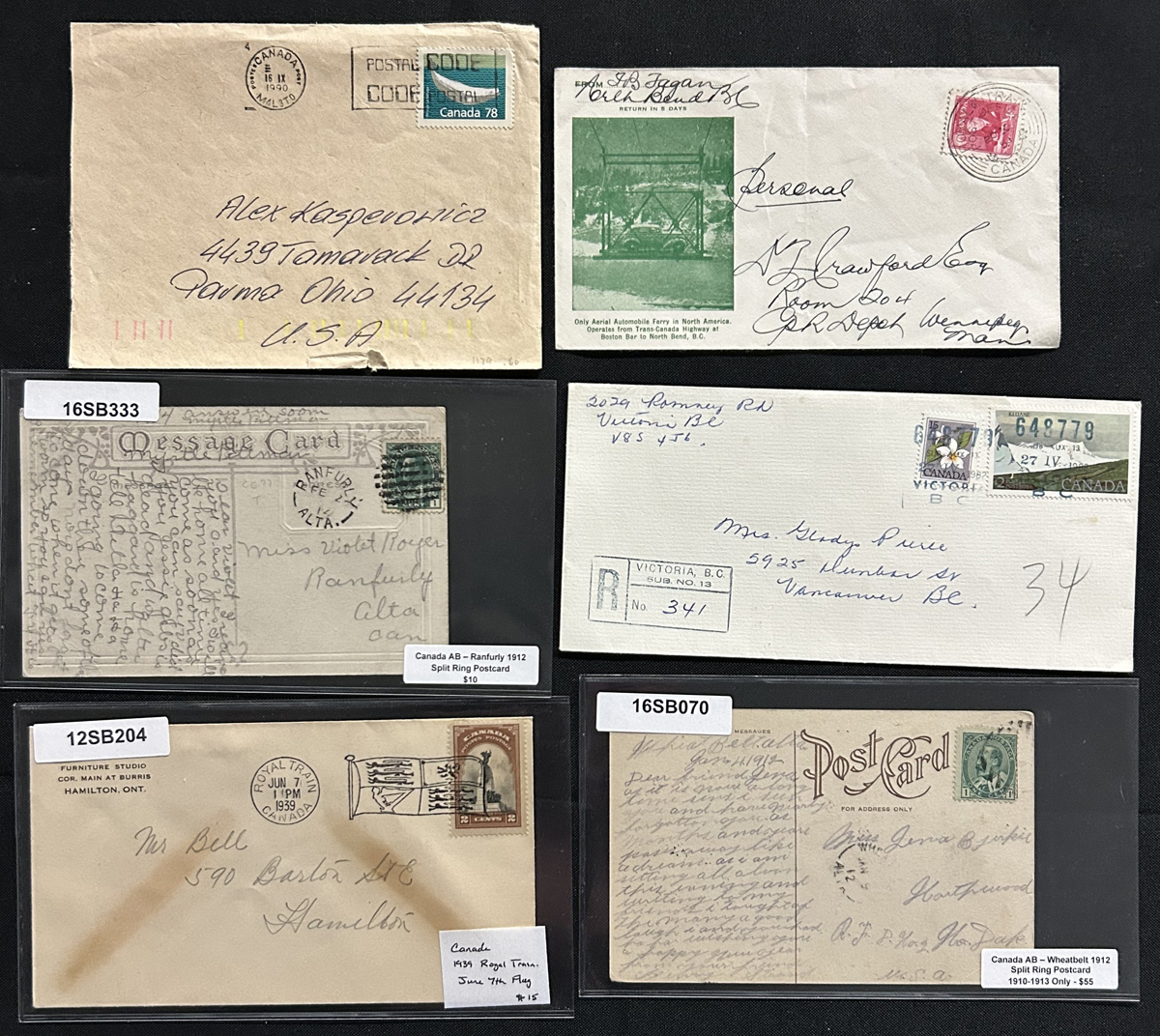 519 CVR/PC   imageExtensive Saskatchewan Town Postmark Collection, a seldom offered, lifetime collection of 1,126 covers/postcards/pieces, all with split ring postmarks, with strength in the earliest days of the Provinces (Edward and Admiral era). Arranged alphabetically on collector made pages, or stock pages and held within 16 binders (takes up about 2 bankers boxes). This is one man's collection, acquired over decades, offered intact, and which includes 179 "E" or "*" (unreported) postmarks, alongside many other closed post offices, RPPC (real photo postcards), rates, destinations etc. Included is the inventory list of towns, compiled by the collector with town name, date acquired and purchase price. This lot represents an opportunity for either the postmark collector or dealer to acquire a life-time work intact. We are offering this group intact in this sale, with a starting price of $15,000 (about $13 per cover). If this collection does not sell intact, it will be appropriately broken up in subsequent Garden City Philatelic Auction postal history sales. We have scanned many of the better items, along with the inventory list. We encourage any interested collectors to contact us with any questions. Click here for a PDF of this lot. (Scan 1) (Scan 2) (Scan 3) (Scan 4) (All Scans) (All Images)