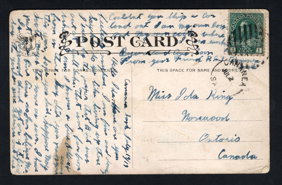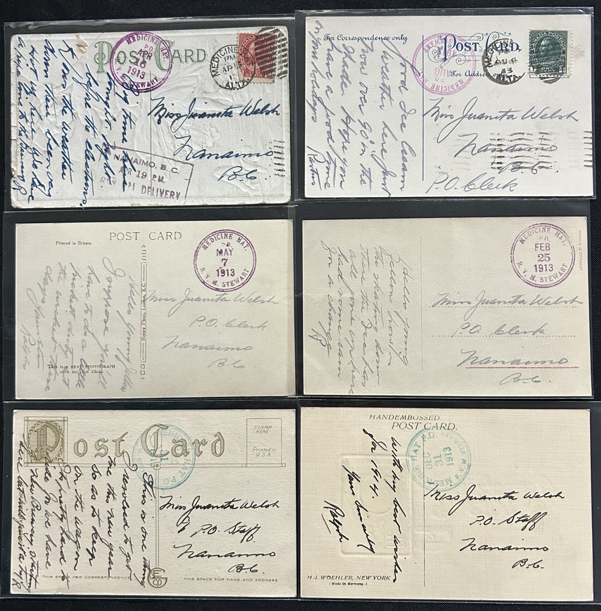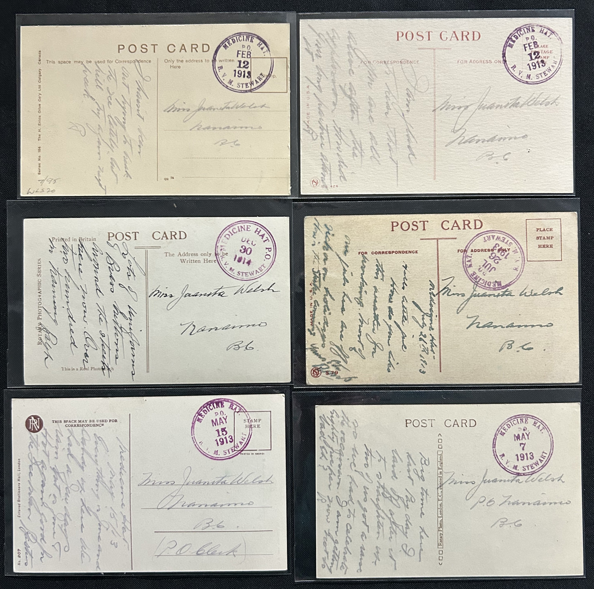 510 PC   imageCorrespondence of 20 Picture Postcards Sent from Medicine Hat AB to Nanaimo, BC, to "Miss Juanita Welsh . P.O. Staff (sometimes "Staff") / Nanaimo, B.C.”, dated between February 1913 to December 1914. Only two of the cards are franked (1c and 2c Admirals) and the rest were mailed free-franked. Each of the cards has a "Medicine Hat / P.O. / R.V.M. Stewart” double circle datestamp, three in green and the rest in violet. A few have edge or other faults, still an interesting group. (Scan 1) (Scan 2) (All Scans) (All Images)