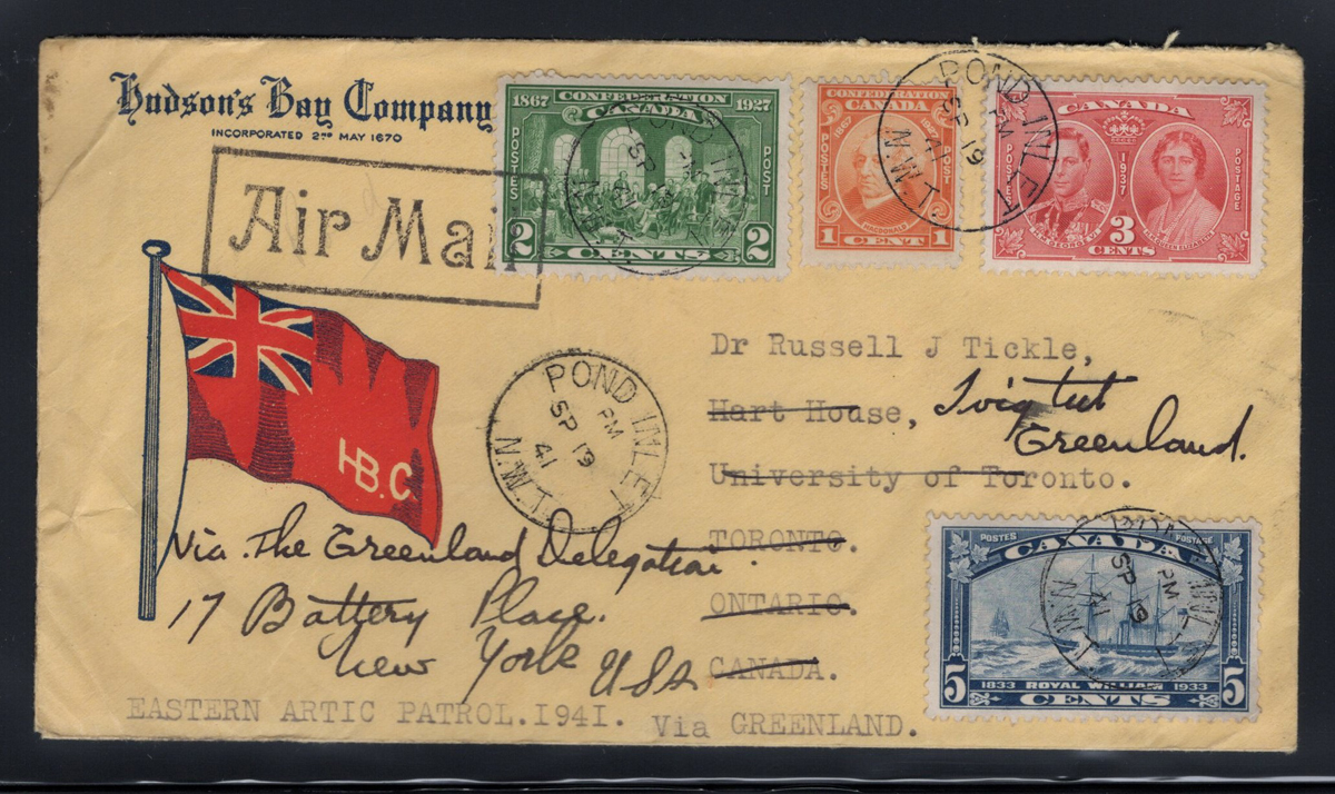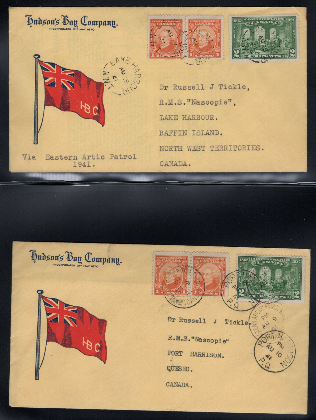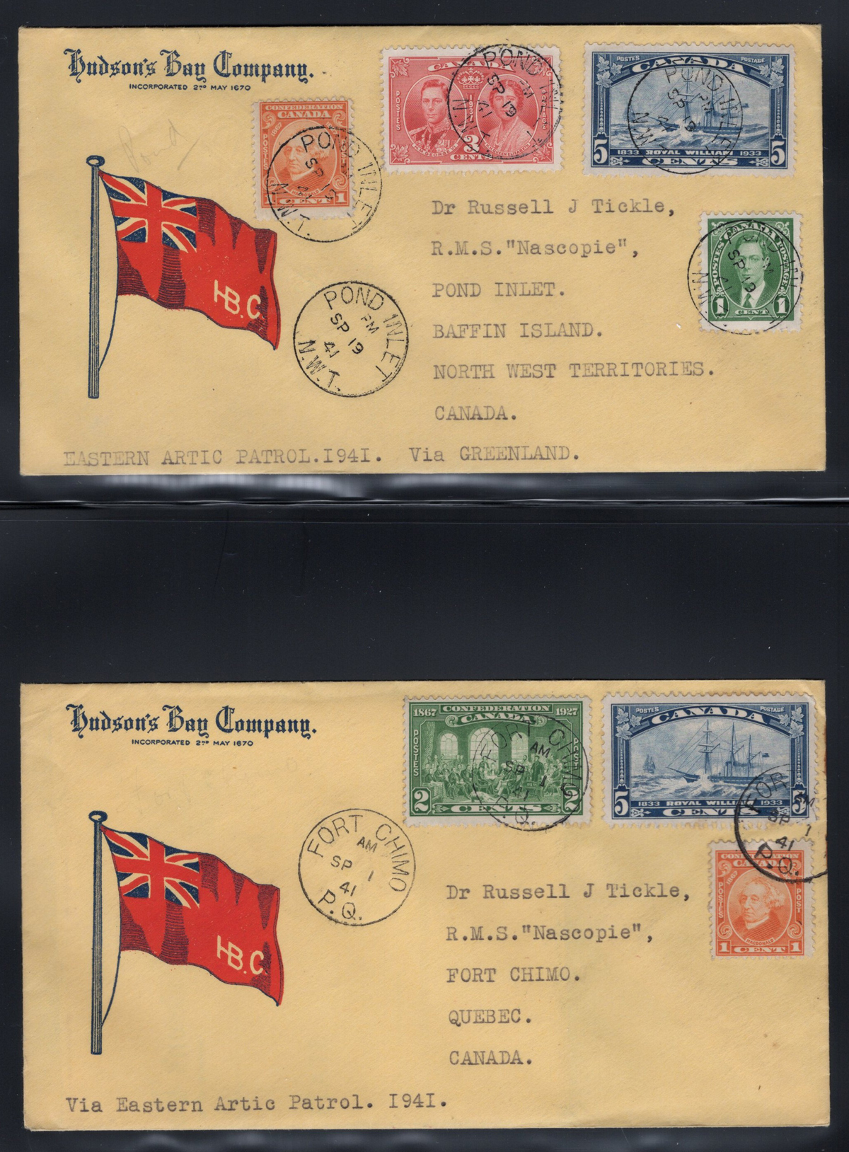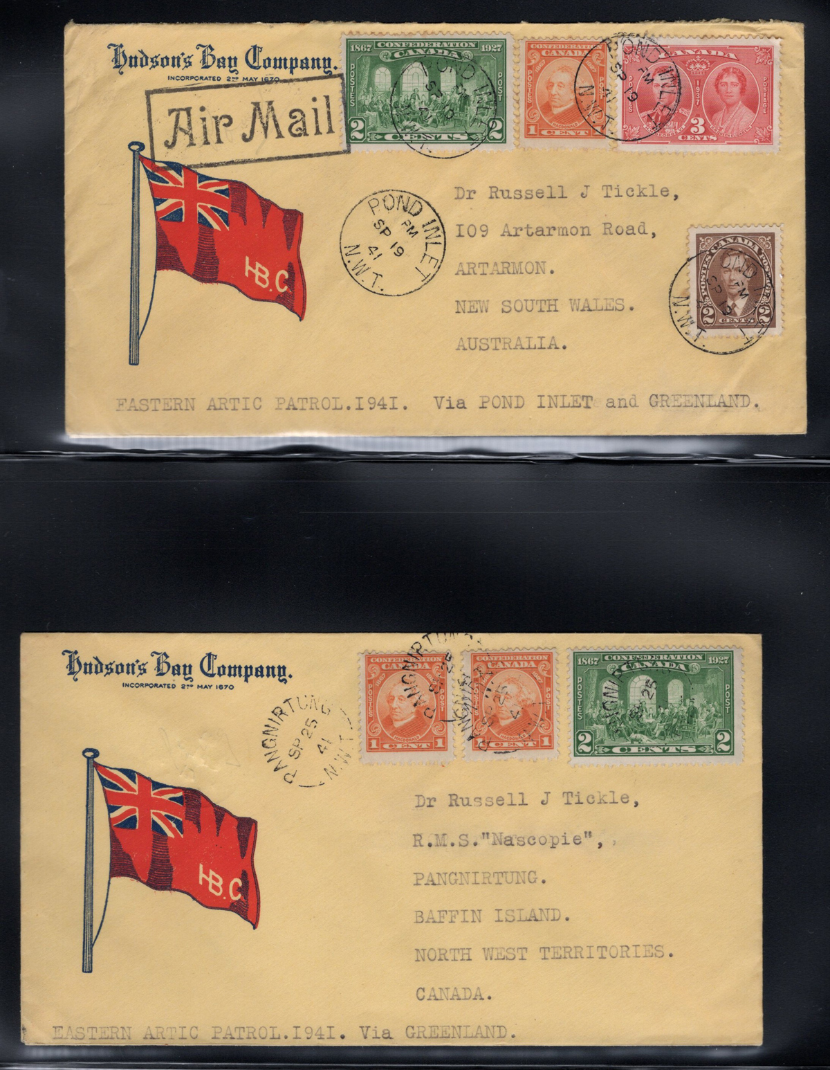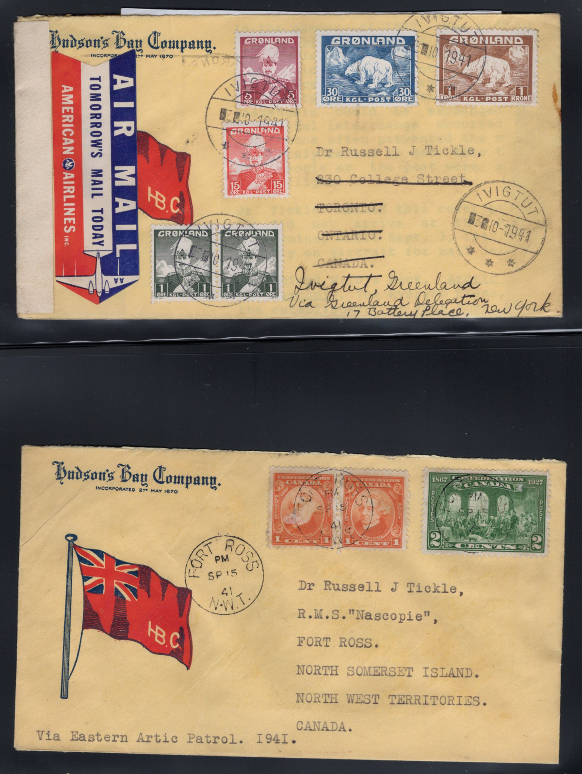514 CVR   imageGroup of 9 Better Eastern Arctic Mail Covers from 1941, all yellow Hudson's Bay Company flag covers addressed to Dr. Russell J. Tickle at various addresses including different places in Northwest Territories, northern Québec, one to Australia and two to Toronto which were forwarded to Greenland and New York respectively. We note a colourful variety of Canadian stamp frankings and one censored cover is franked with 6 Greenland stamps. All but the Greenland cover have an "Eastern Arctic Patrol R.M.S. / Canada" c.d.s. (dated between AUG.10 and SEP.26, 1941). A very fine group with a high retail value. (Scan 1) (Scan 2) (Scan 3) (Scan 4) (Scan 5) (All Scans) (All Images)