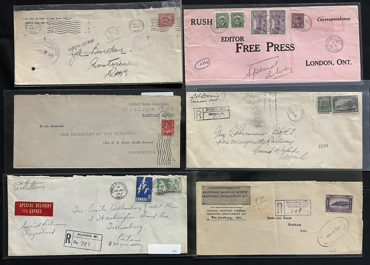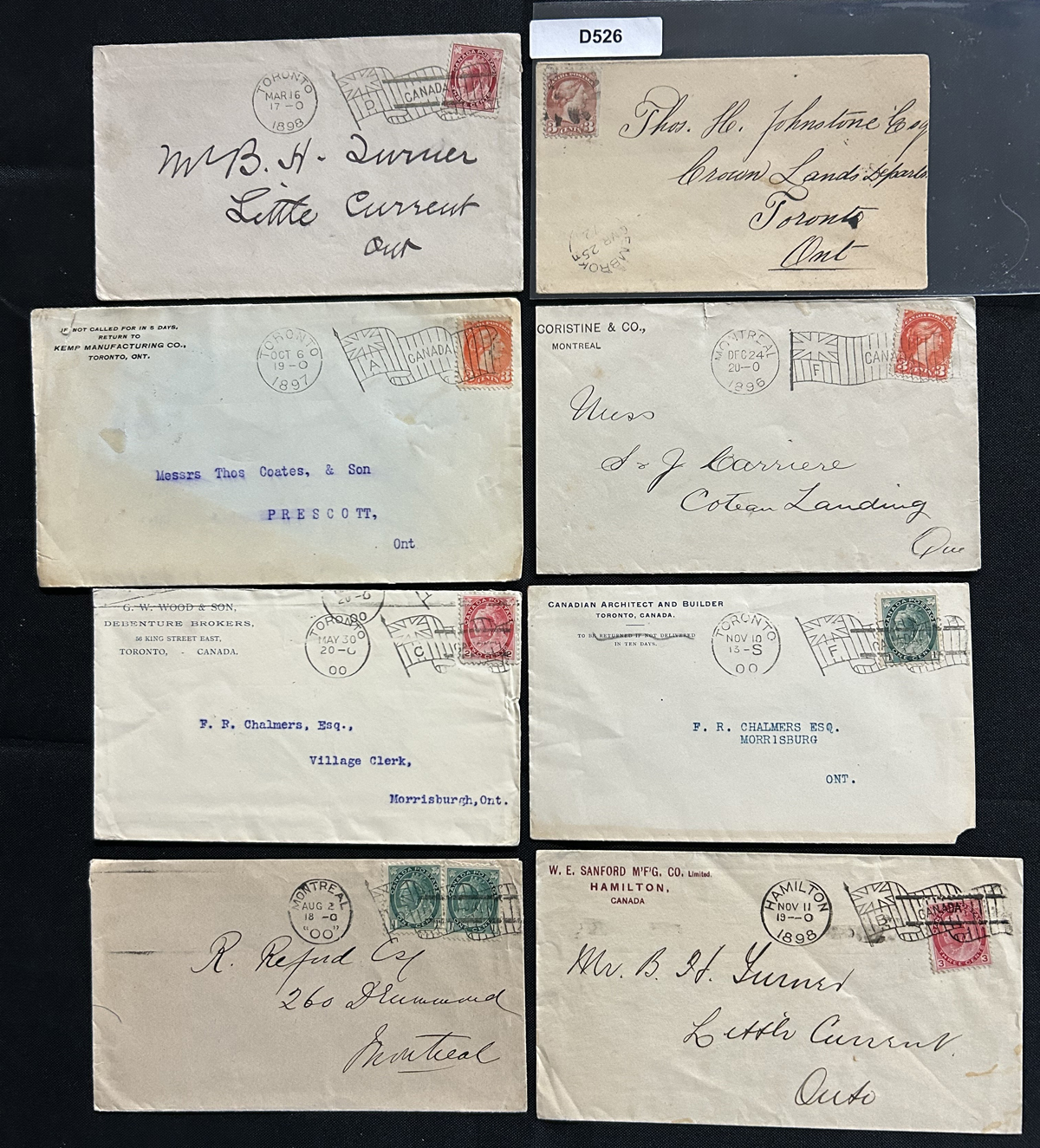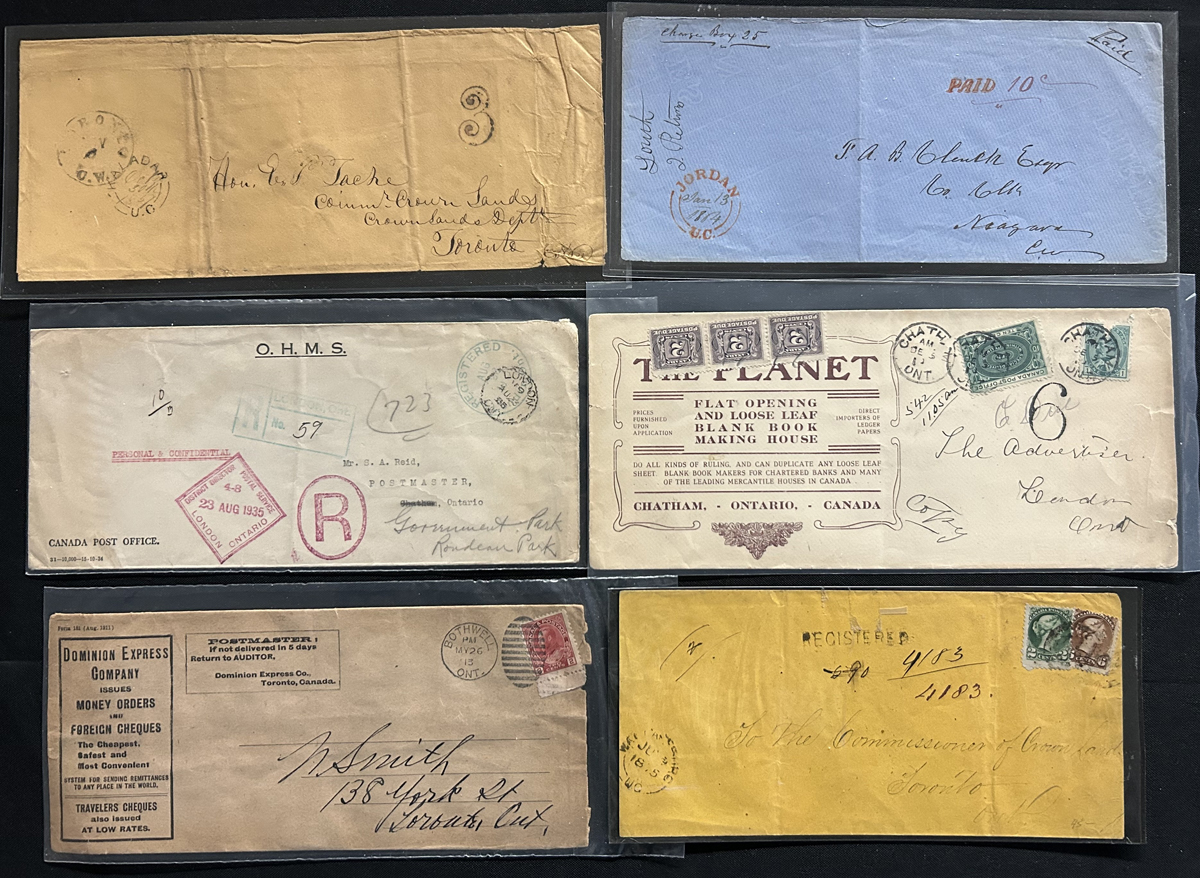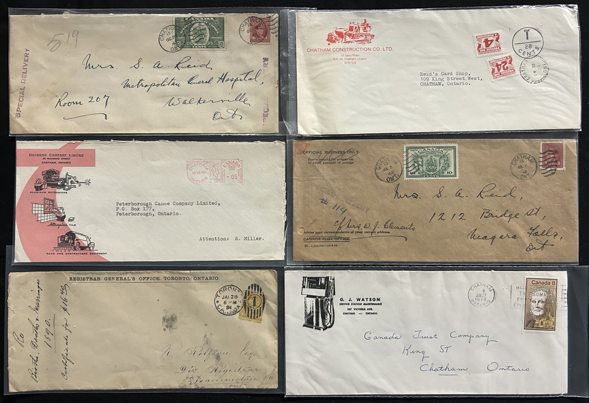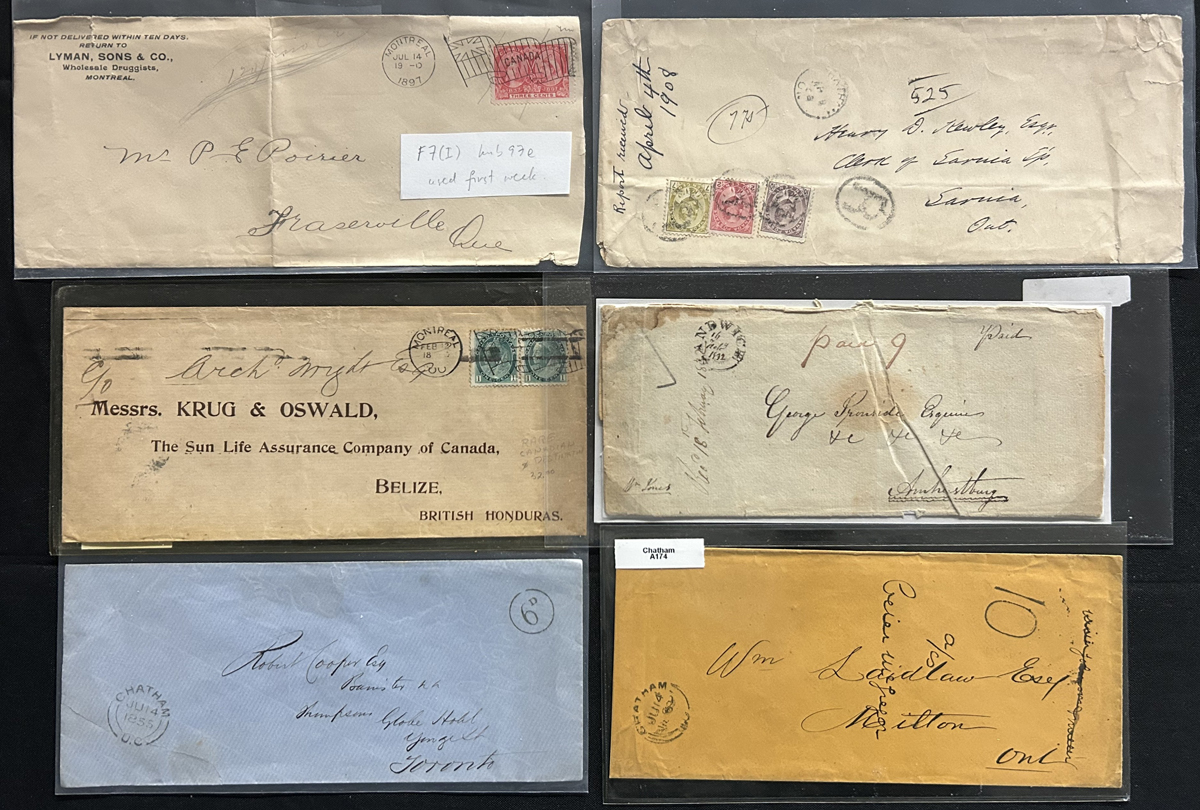 507 CVR   imageGroup of 165 #10 Size Covers, with Many Better, 1832 to 1990s, includes covers, stationery covers, precancelled, illustrated advertising, early stampless covers, corner cards, postage due, registered, special delivery, noted better postmarks such as Kaladar U.C (OCT.30.1857 is the ERD), a lovely Jordan U.C. from 1864 (in red, used years after the normal period), a Montréal Involute Bickerdike flag used in the first week, a 2c Numeral cover mailed to Belize, British Honduras (FEB.25.1900 receiver) an 1929-type Sandwich postmark from 1832 and much more. The majority are from Kent county, and most of those from Chatham. Some have folds, etc. Still overall fine or better. (Scan 1) (Scan 2) (Scan 3) (Scan 4) (Scan 5) (All Scans) (All Images)