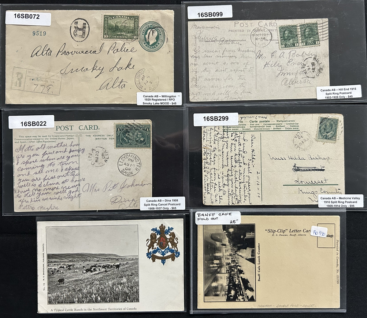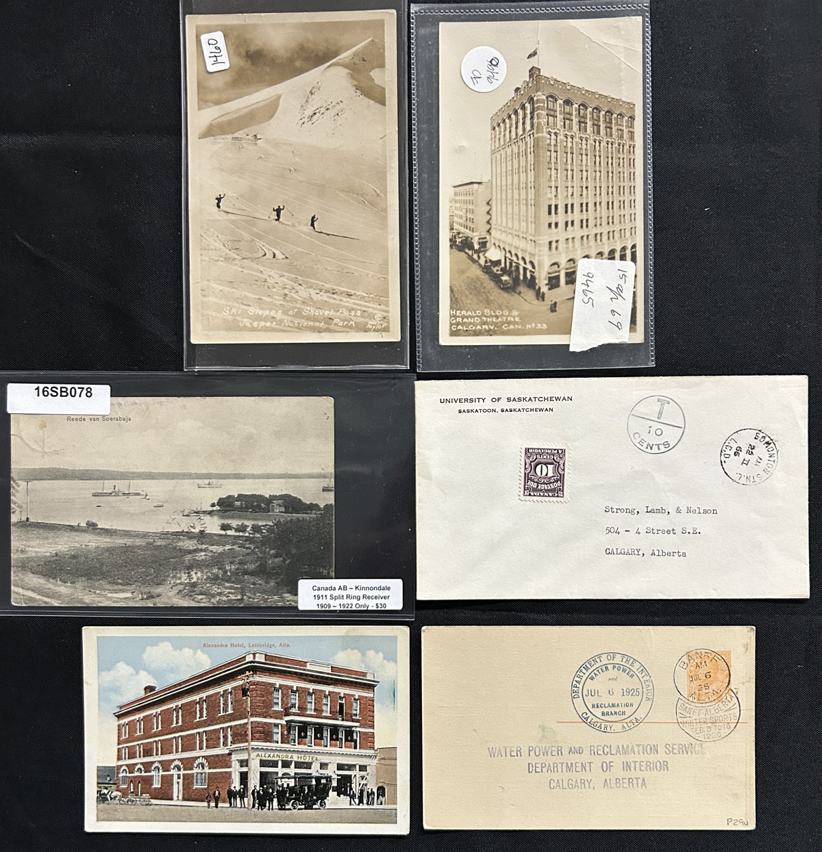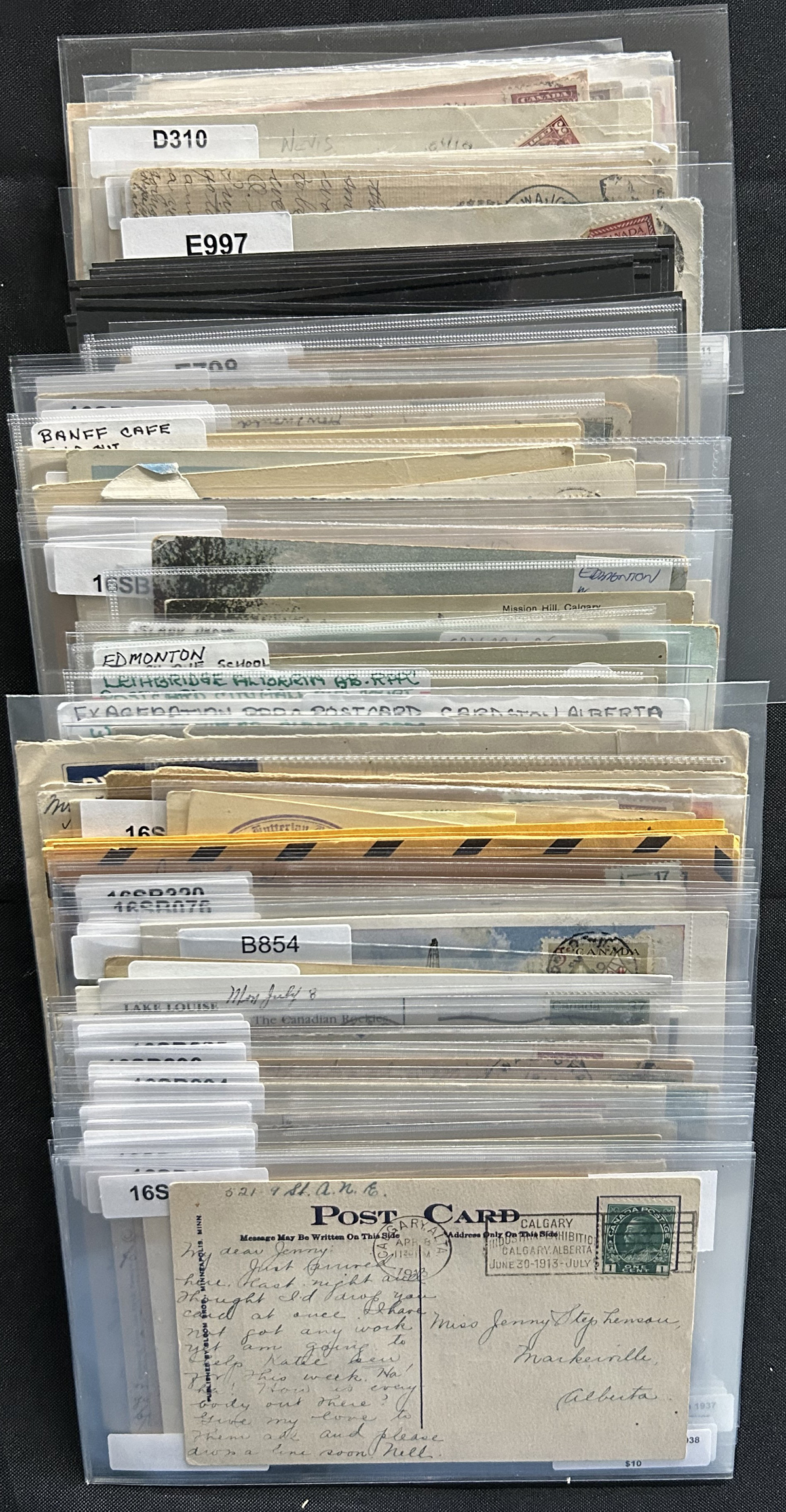 511 CVR/PC   imageGroup of 110 Alberta Covers and Cards, Territorial to 1980s, a nice group comprising of picture postcards, including some real photo, as well as covers, with lots of postmark interest, noted several small town cancels and much more. Nice overall quality, many are sleeved and priced. See photos for an overview and a selection. (Scan 1) (Scan 2) (Scan 3) (All Scans) (All Images)
