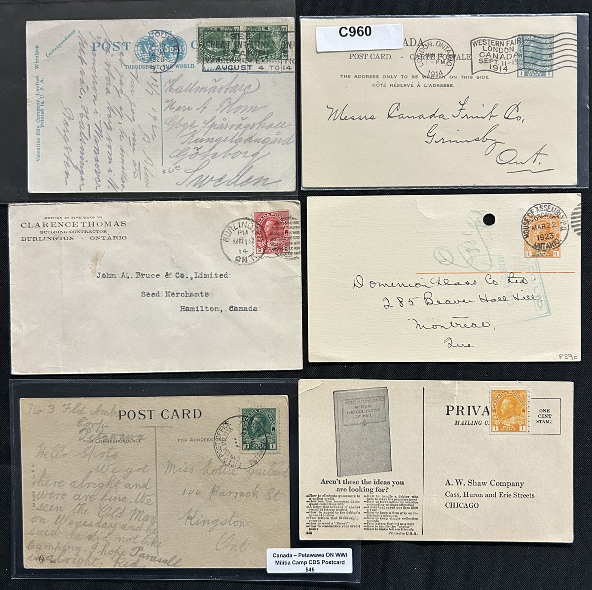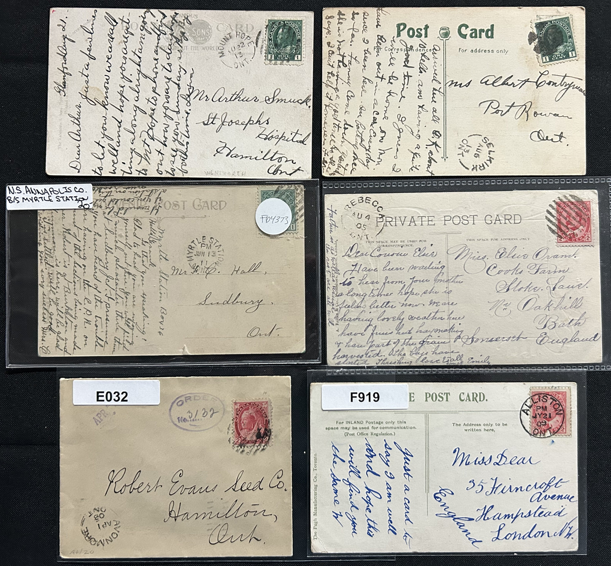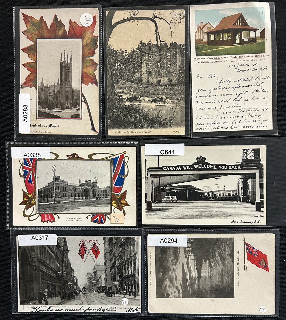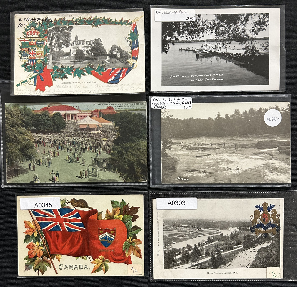 515 CVR/PC   imageGroup of Over 210 Covers and Cards with Ontario Postmarks, 1890s to 1940s, the majority are picture postcards but we note some covers as well. A good selection of mostly small town postmarks here, with the odd larger town machine cancel or C.D.S. here and there. The picture side of the postcards also hold interest, as there are several patriotics, real photos, town views, etc. (Scan 1) (Scan 2) (Scan 3) (Scan 4) (All Scans) (All Images)