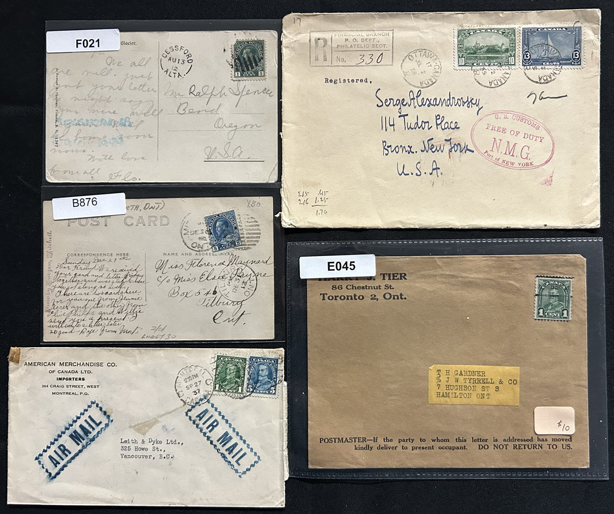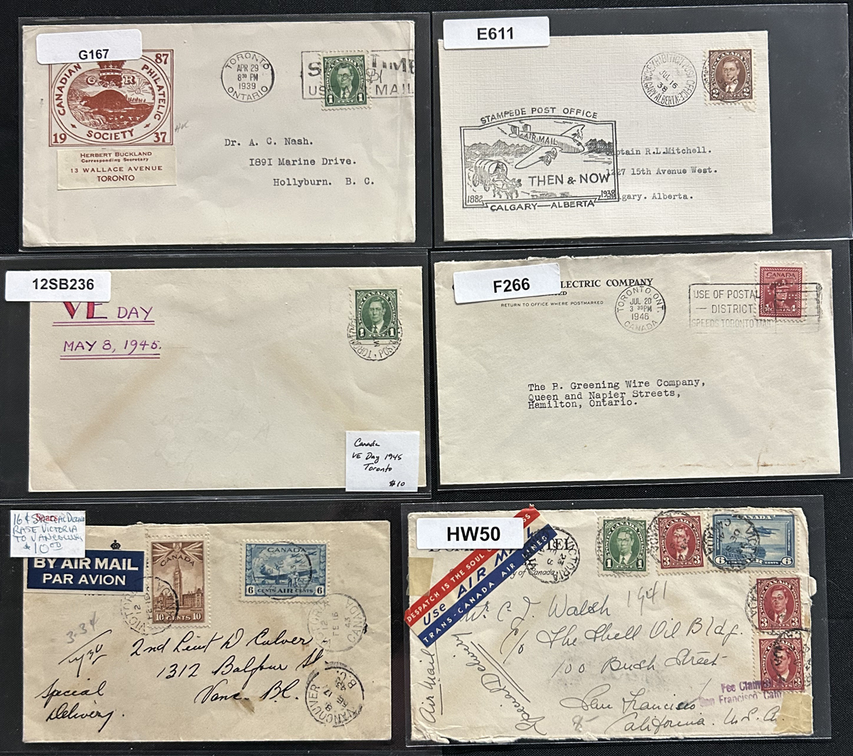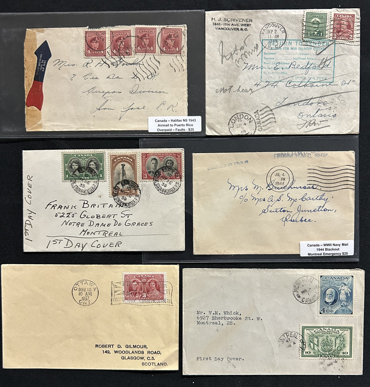 505 CVR   imageGroup of About 120 King George VI Era Covers, with a good variety of material including black-out cancels, precancels, airmail rates, registered, military postmarks, first days, slogans, patriotic, private perfins, a reused OHMS cover, a nice ballot box tag franked with a block of 4 of the 8c Mufti, and more. Overall fine to very fine, with the usual small faults. (Scan 1) (Scan 2) (Scan 3) (Scan 4) (All Scans) (All Images)