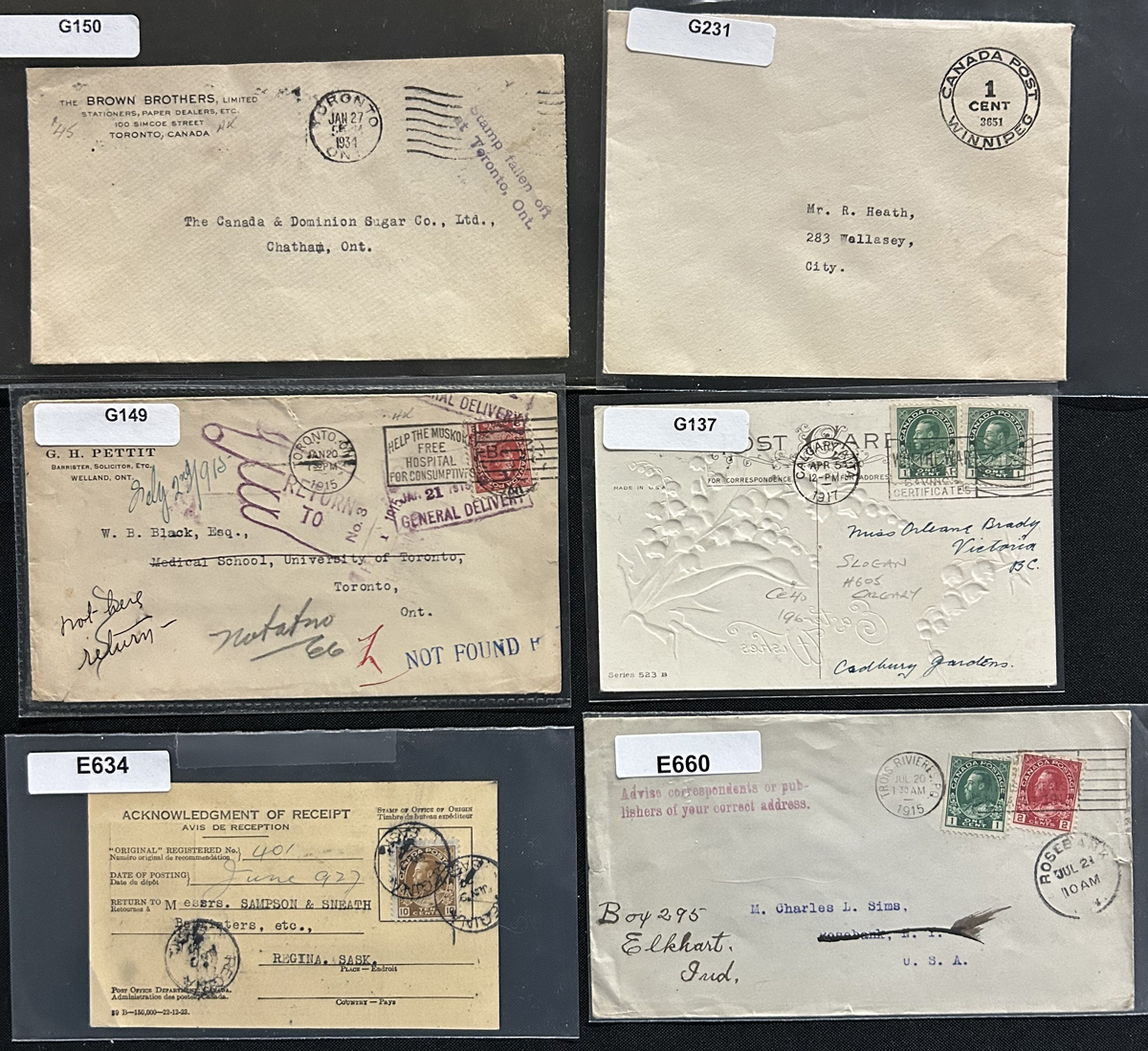 503 CVR/PC   imageGroup of 145 King George V Era Covers and Cards, a good variety here, with Admirals, Arch, Medallion and other frankings, we noted many postmark interest (slogans, duplex, etc.) as well as corner cards, a few registered, a few military, etc. Faults here and there, else fine to very fine overall. Pictures show a sampling. (Scan 1) (Scan 2) (Scan 3) (Scan 4) (All Scans) (All Images)