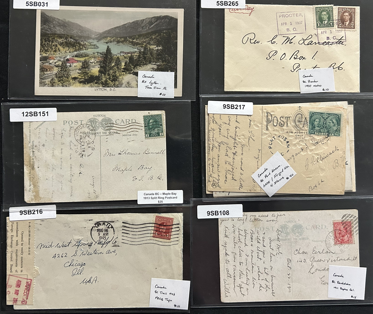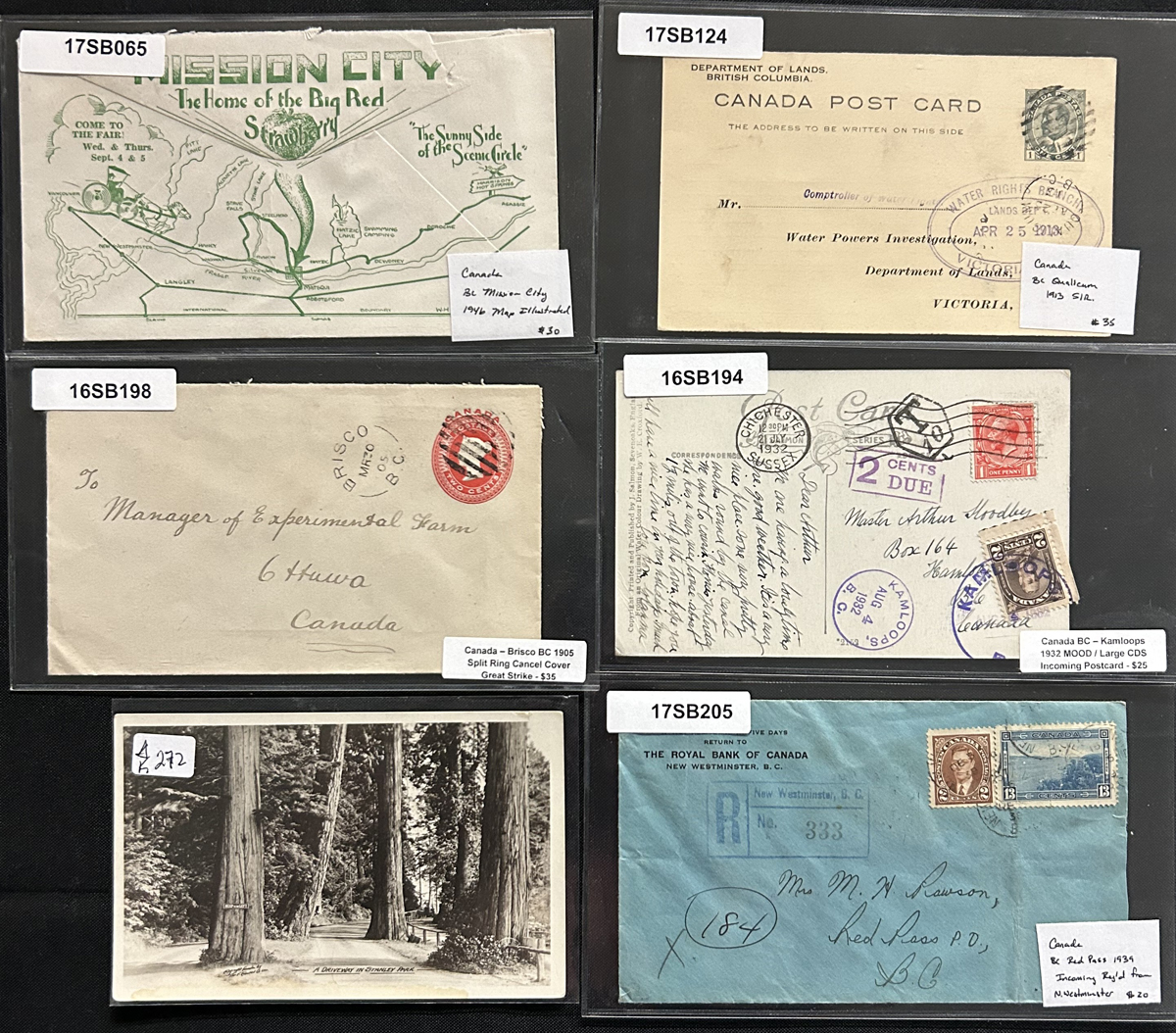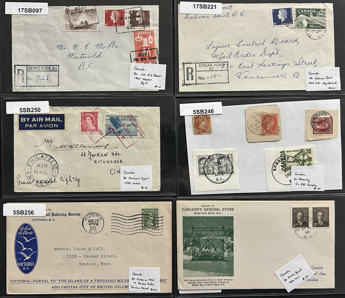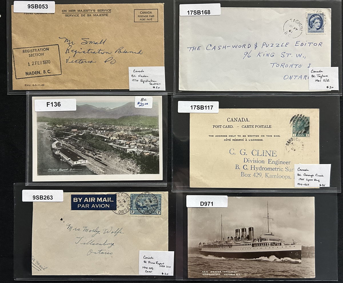 512 CVR/PC   imageGroup of About 360 British Columbia Covers and Cards, 1890s to 1950s, a good variety of material in this lot, including picture postcards, West Coast ships, registered covers, many small town postmarks and more. A few have small faults, else an overall fine to very fine, and quite useful lot. (Scan 1) (Scan 2) (Scan 3) (Scan 4) (Scan 5) (All Scans) (All Images)
