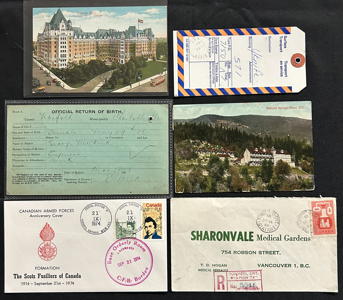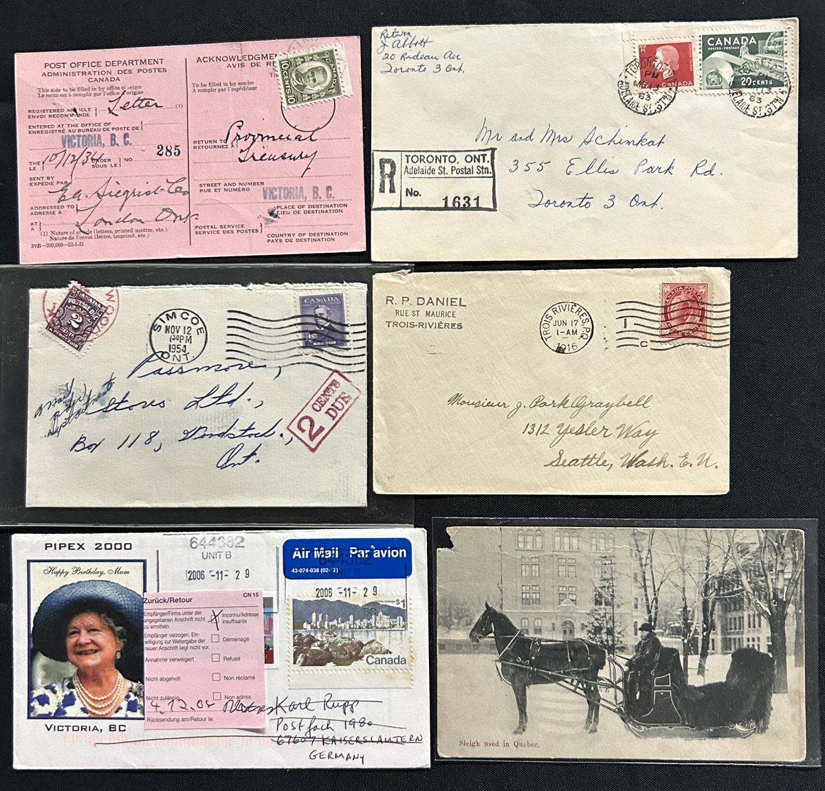 504 CVR/PC   imageGroup of About 380 Covers and Cards, with strength in the KGVI to 1990s era, noting a wide variety of material including good picture postcards (with picture and postmark interest), small town postmarks (incl. many from BC / Western provinces), frankings, registered, airmail, foreign destinations, military postmarks and much more. Many have faults to varying degrees, still many are fine to very fine. See pictures for an idea. (Scan 1) (Scan 2) (Scan 3) (Scan 4) (Scan 5) (Scan 6) (All Scans) (All Images)