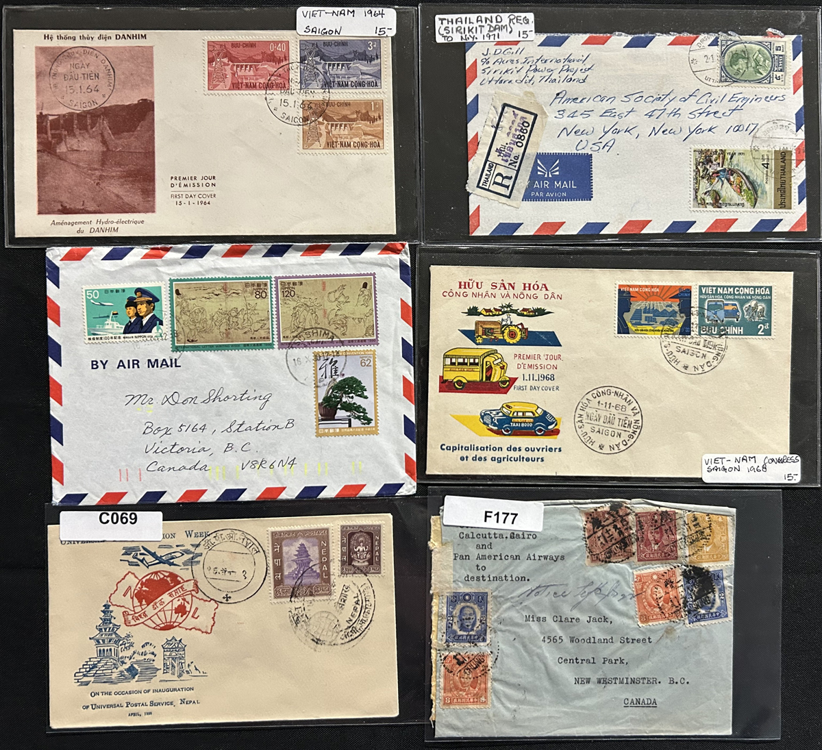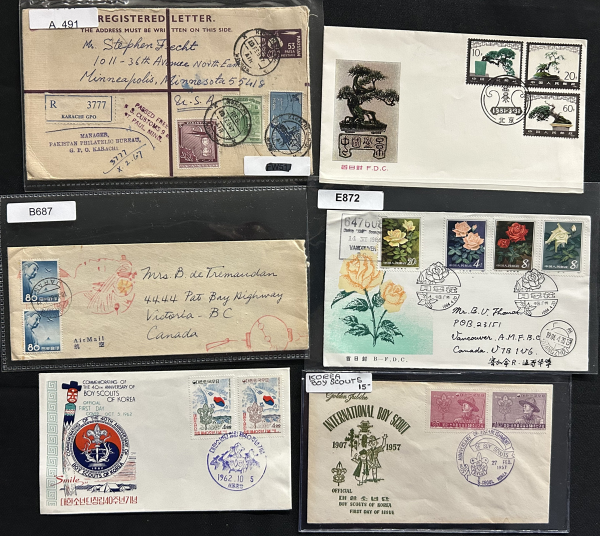 520 CVR/PC   imageGroup of About 130 Covers and Cards from Asian Countries, including Japan, Indonesia, Philippines, Korea and more. Note many airmail rates, many were mailed to Canada, some FDC, commercial mail and more. A few have small faults, else overall fine or better. (Scan 1) (Scan 2) (Scan 3) (All Scans) (All Images)
