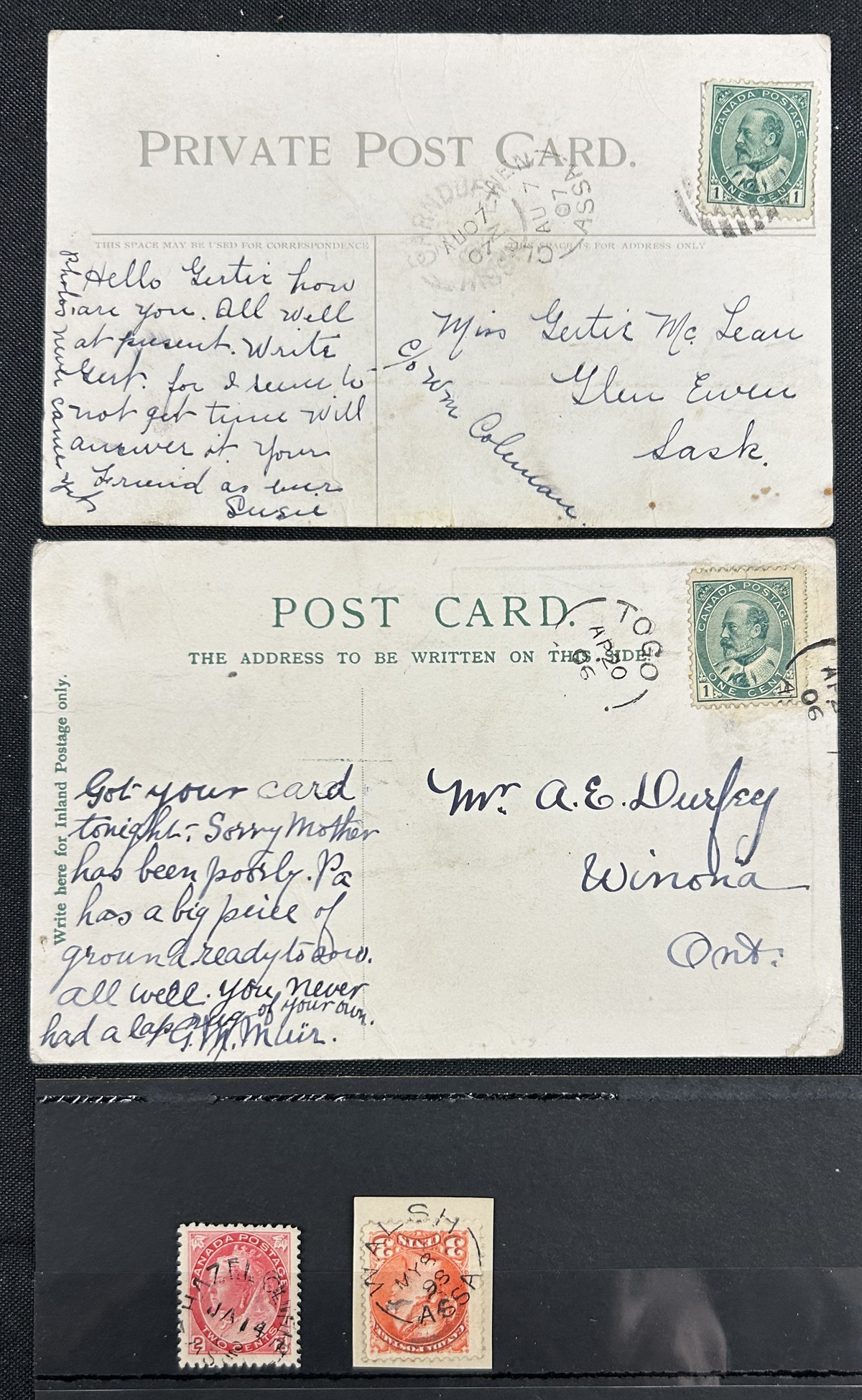 518 PC   imageGroup of Assiniboia Postmarks on 12 Cards, includes c.d.s. strikes from Moosomin, Grenfell, Indian Head, Weyburn and Oxbow. Broken circles from Togo, Southcote, Carnduff and Glen Ewen (the last two are on the same card). Also includes a Wolseley duplex, Strassbourg Station Sask., Walsh ASSA on 3c SQ piece and Hazelwoood on 2c Numeral stamp, as well as a Moosomin NWT on registration receipt. Many of the cards (postal cards and picture postcards) have faults, else a useful group which contains some scarce strikes.