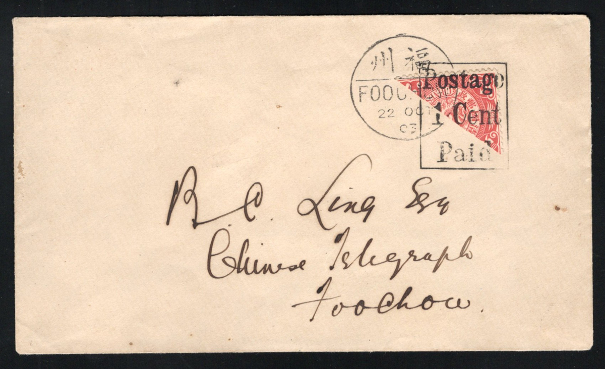 524 CVR 123 image1903 Bisected 2c Issue on Cover from Foochow, mailed on the first day of this usage (OCT.22.1903) to a local address in Foochow, with Scott #123 properly tied by c.d.s. and boxed "Postage 1 Cent Paid" handstamp. Back has no receiver (catalogued as such) but we note a small red expert handstamp. Very fine. (Scan 1) (Scan 2) (All Scans) (All Images)