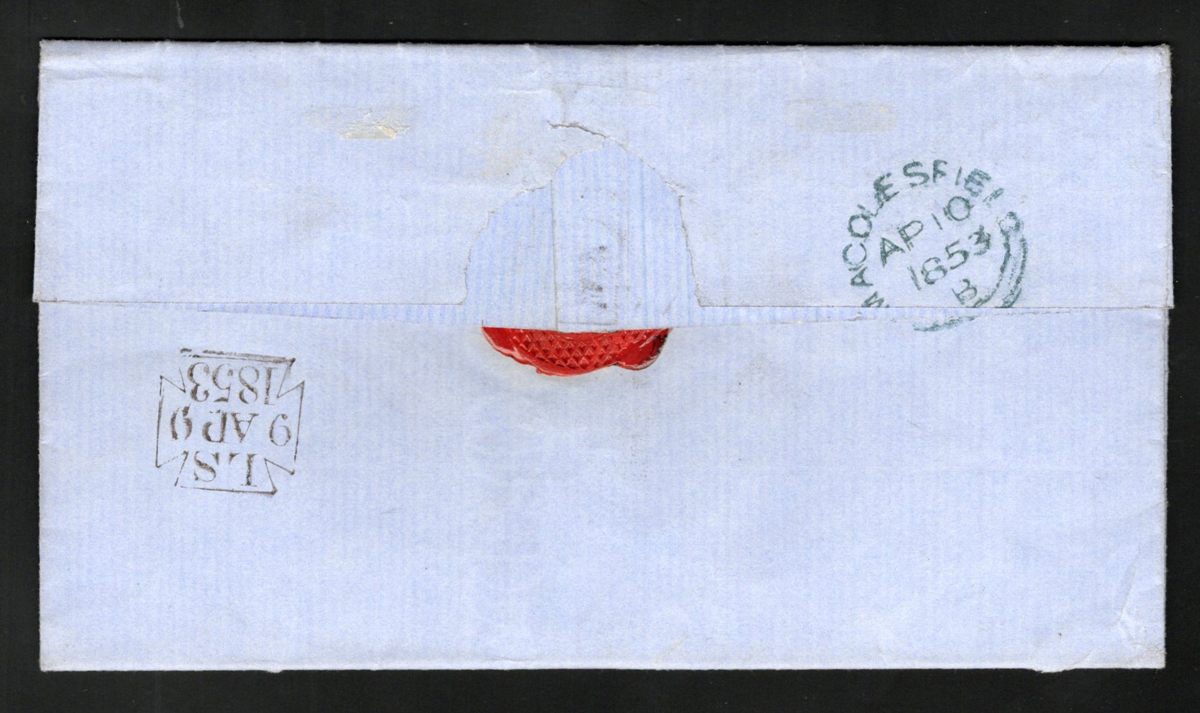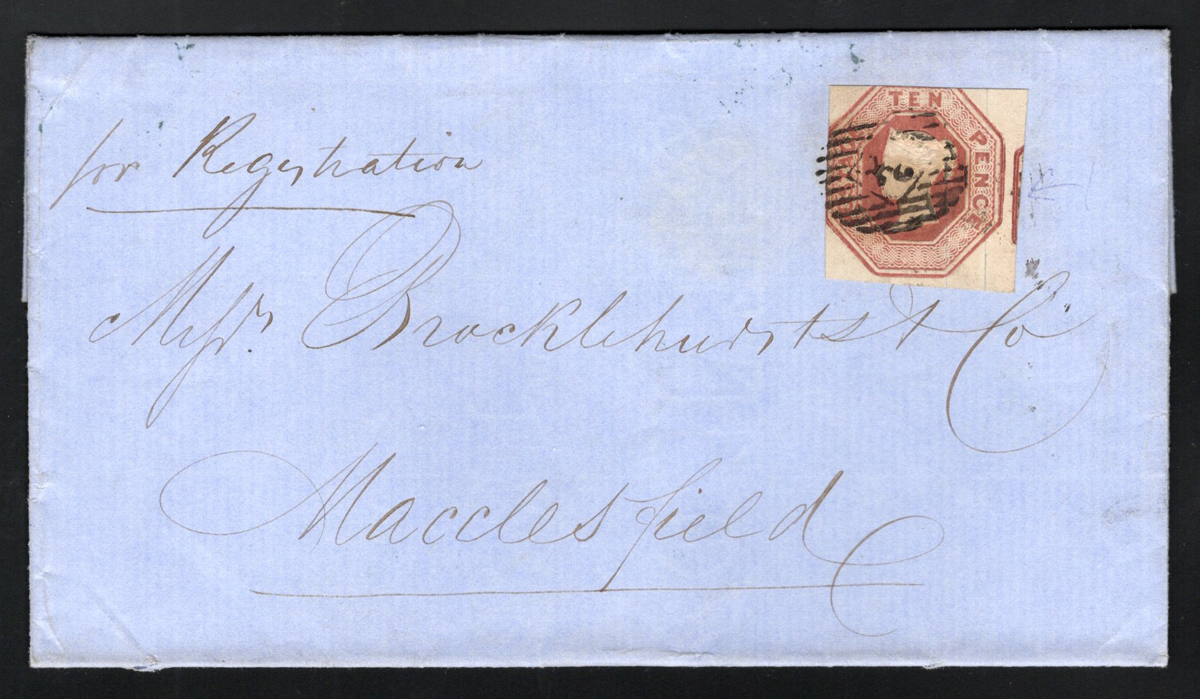 540 CVR 6 image10d Embossed Queen Victoria on 1853 Registered Folded Letter, mailed from London (dateline inside plus neat Lombard Street datestamp on back) on APR.9.1853 to Macclesfield (APR.10 receiver in green on back), endorsed "for Registration" and franked with a 10d red brown QV embossed imperforate (with silk thread and showing part of next stamp at right) just tied to letter by a grid numeral. The letter inside notes that this "enclosed £65 in three bills". Very fine. S.G. 57, £3,200. (Scan 1) (Scan 2) (All Scans) (All Images)