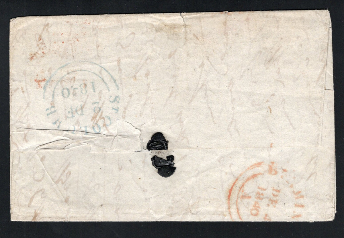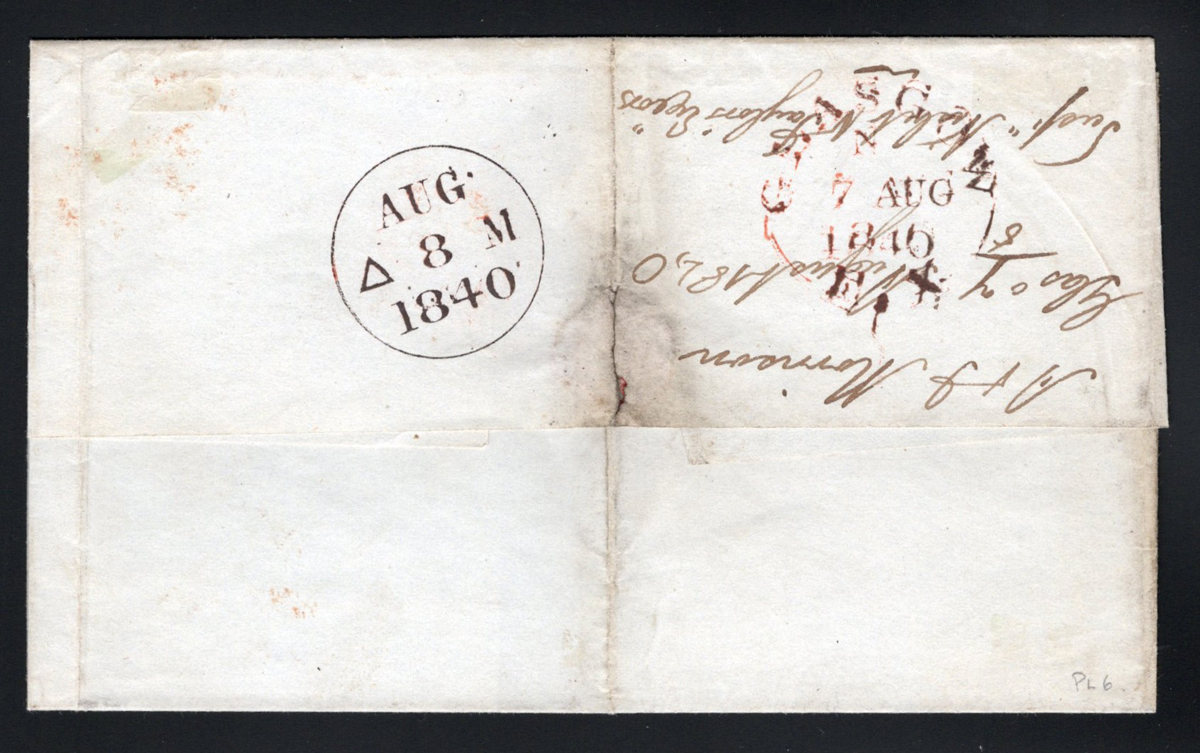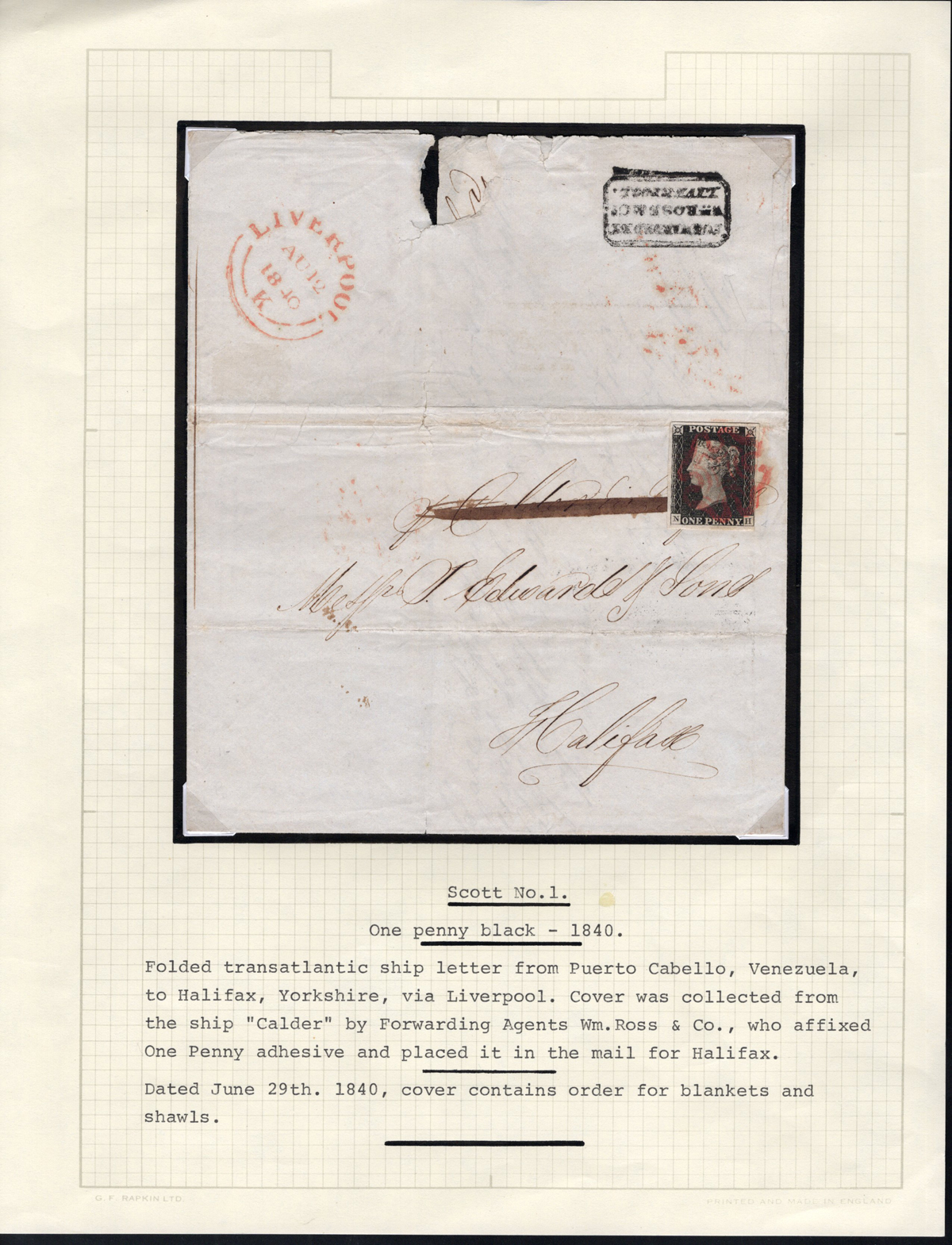 537 CVR 1 image1840 (Aug.12) Penny Black Folded Letter Mailed from Venezuela to England, mailed from Puerto Cabello, Venezuela on JUN.29.1840 (dateline inside) to Halifax, England and arrived in Liverpool on AUG.12.1840 (receiver in red) where it was taken over by a forwarding agent (boxed "FORWARDED BY / WM. ROSS & CO. / LIVERPOOL"), who added a 4-margin (close, to clear on one side) 1p black Queen Victoria imperforate adhesive (Plate 1b, position NH) tied by a red Maltese Cross cancel (same colour as the Liverpool receiver). A rare and desirable use of the Penny Black, in fact we have not found any similar examples except for one incoming from India which received similar treatment and was described at auction as one of three known (from India) and sold for U$9,300. This was the pride and joy of the owner, as it was given to him by a neighbour when he was a child. The neighbour had a family connection to the senders in Venezuela, and this is the first time it appears on the market.